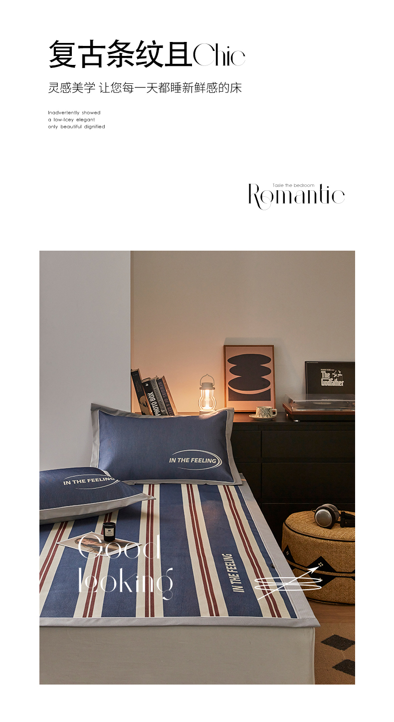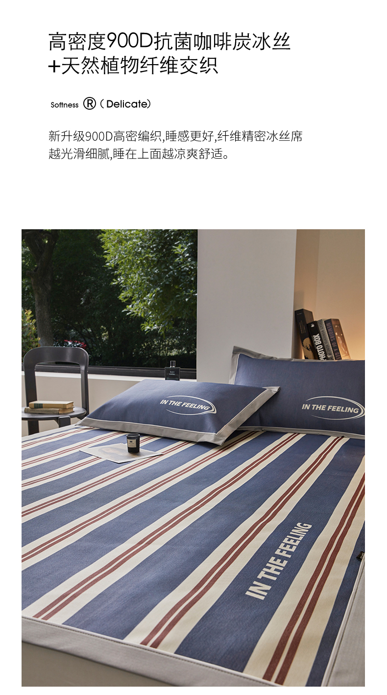 商品名称:圆岛家纺 2023夏季A类复古条纹系列高档900D数码印花冰丝凉席 普鲁士蓝