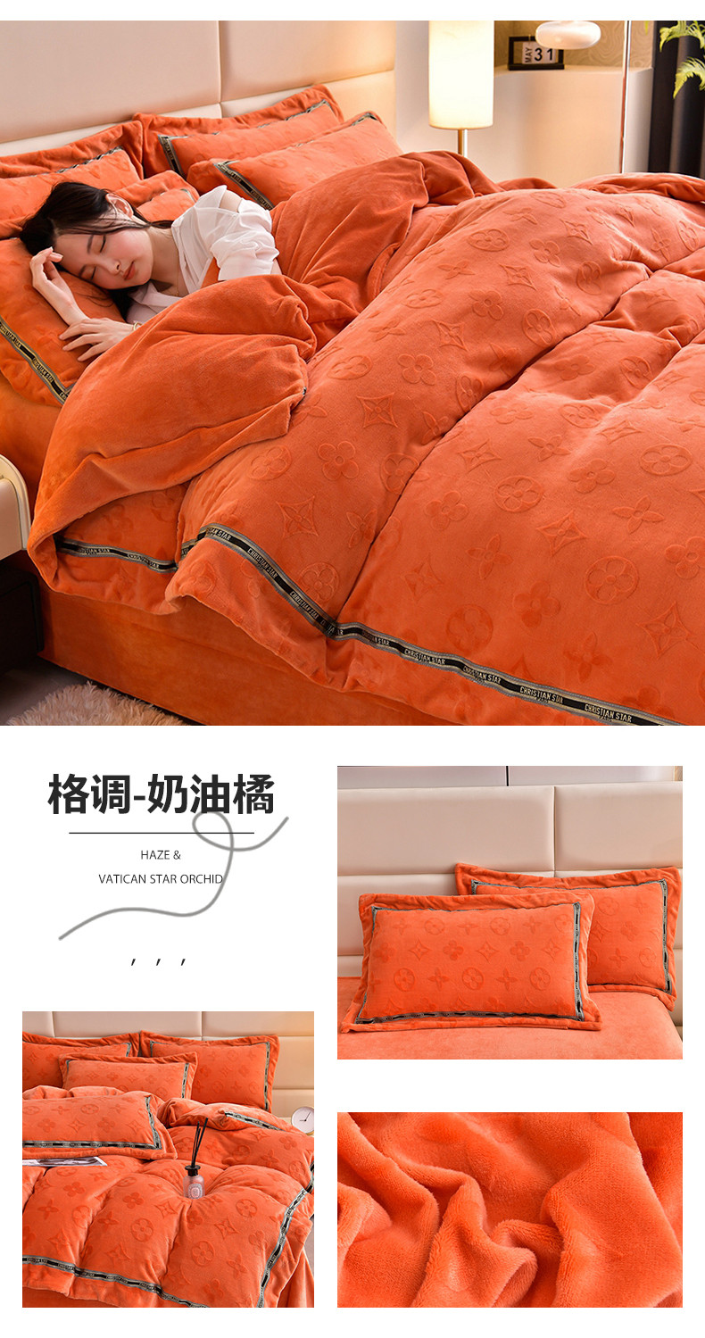 妮恒美 2023新款牛奶绒雕花压线款四件套 格调-奶油橘