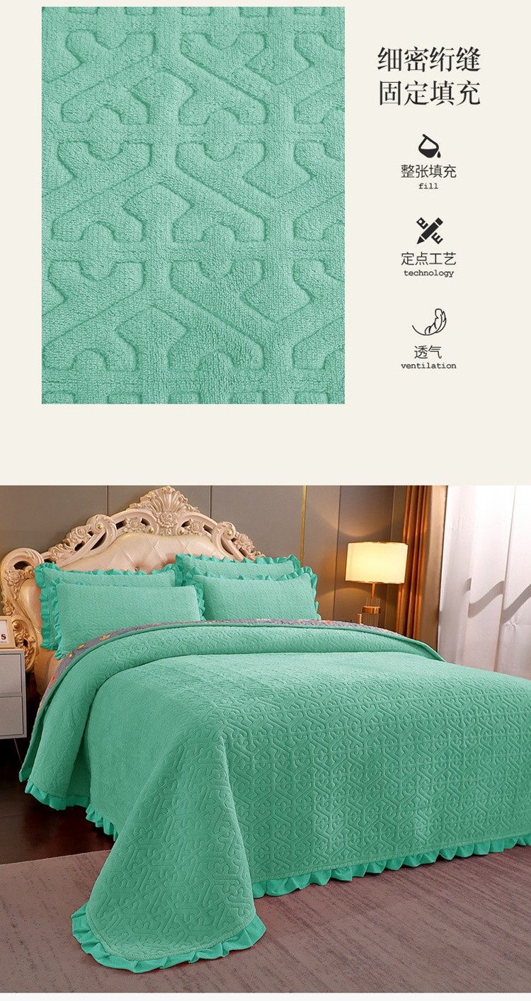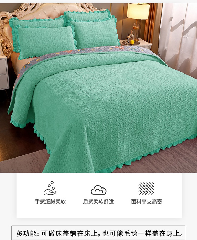 • 91家纺网 家纺一手货源 找家纺 2023新款纯色小花边牛奶绒床盖三件套 暖馨-浅绿