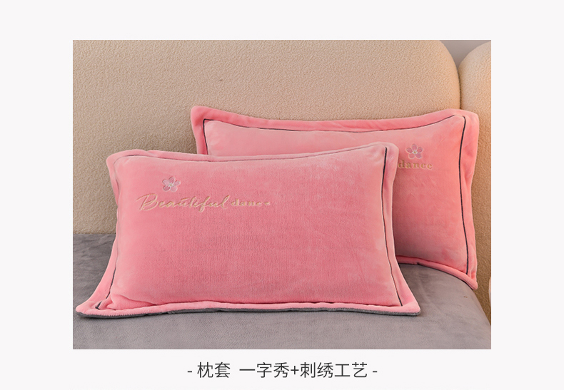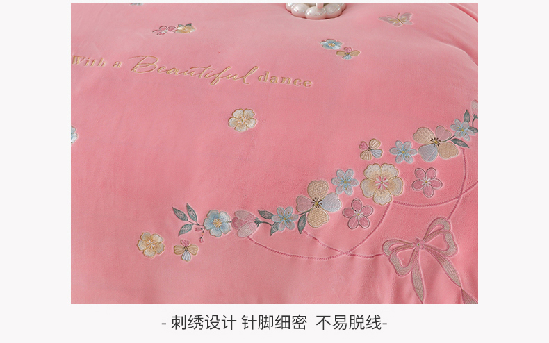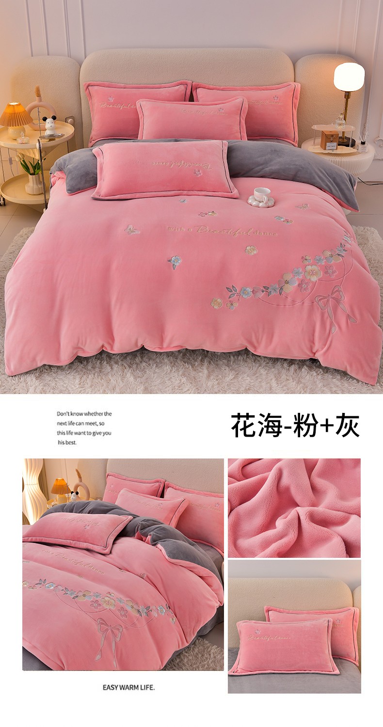 商品名称:畅畅家纺 2023高克重牛奶绒刺绣花四件套金貂法莱宝宝水晶雪花绒四件套 花海-粉+灰