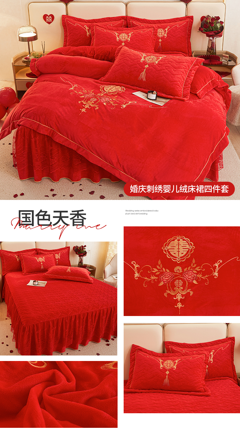 当前位置: 91家纺网 > 商品网购 > 床品套件 > 四件套 > 宜凡家纺 2023秋冬新品新品婴儿绒婚庆床裙四件套 国色天香