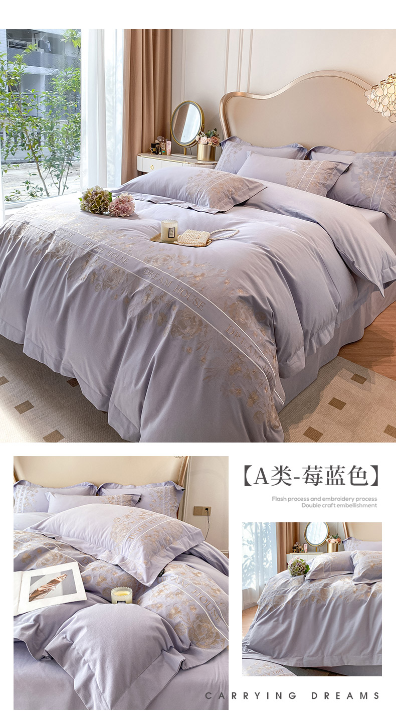 商品名称: 2023新款A类母婴级加厚全棉磨毛四件套纯棉保暖床单轻奢风刺绣长绒棉纯色床上用品 莓蓝色