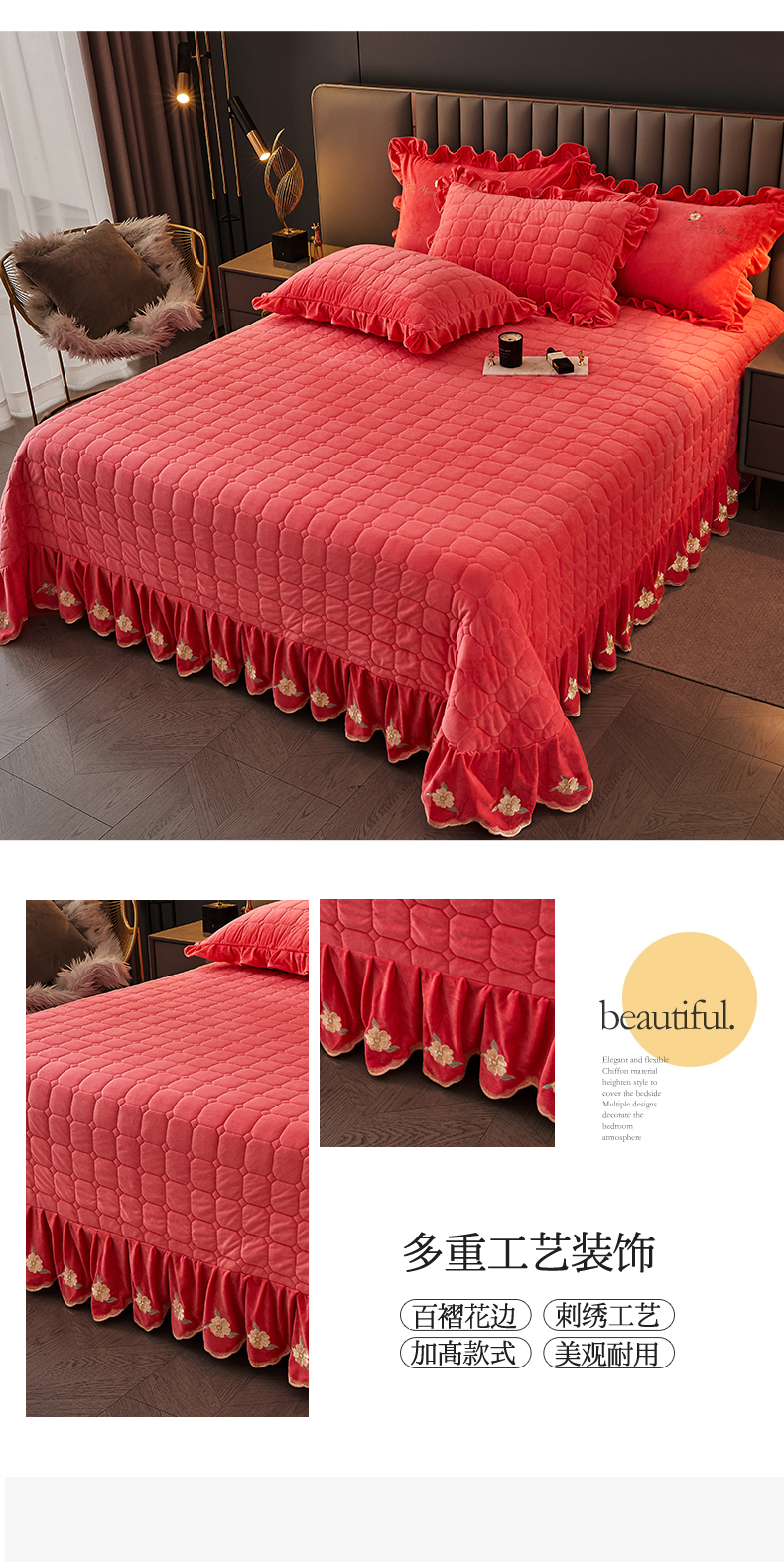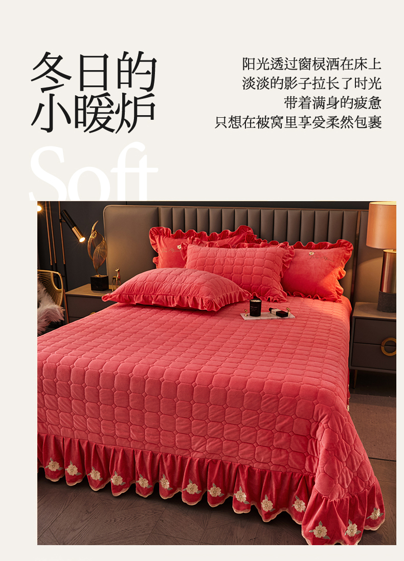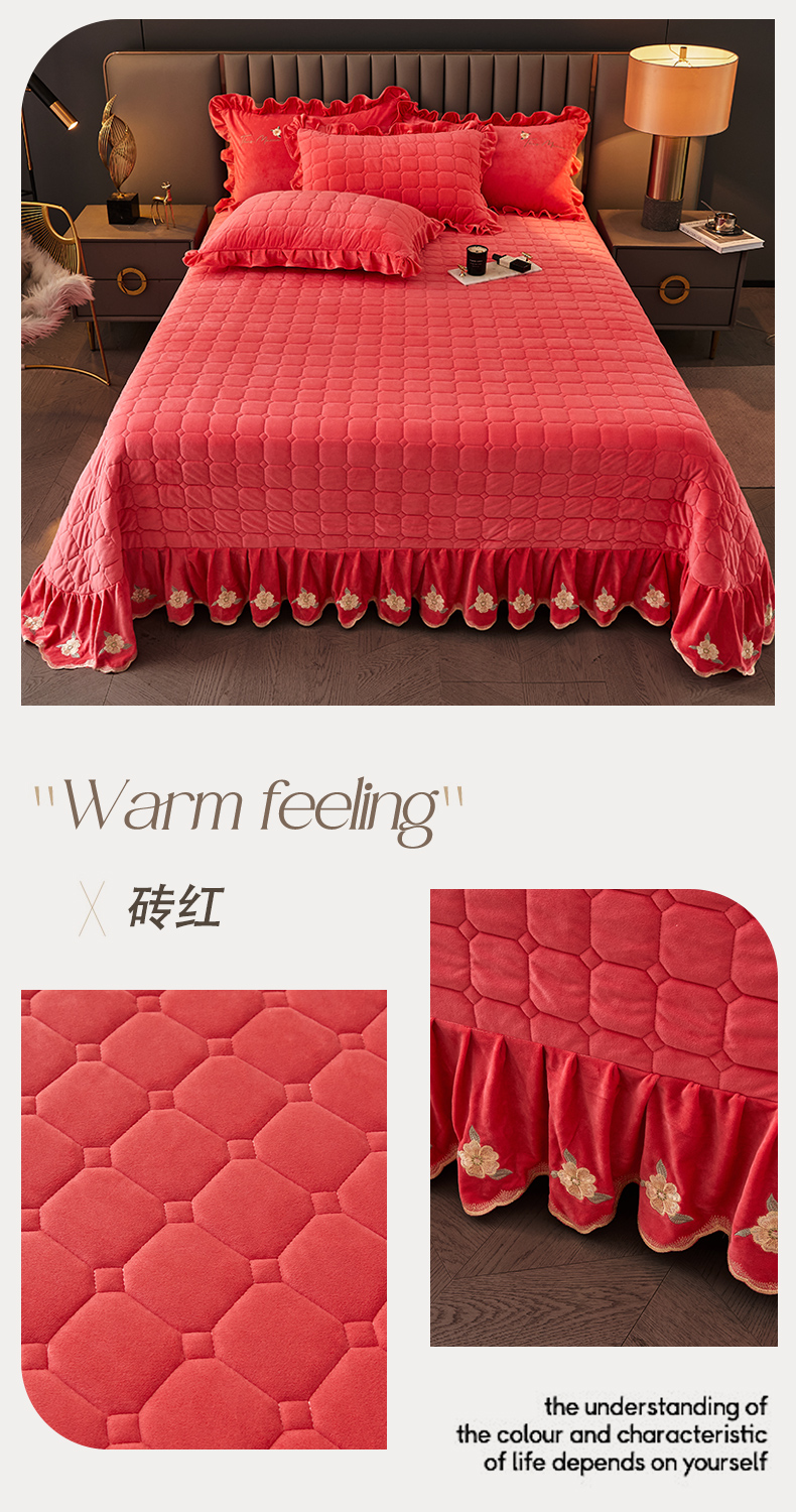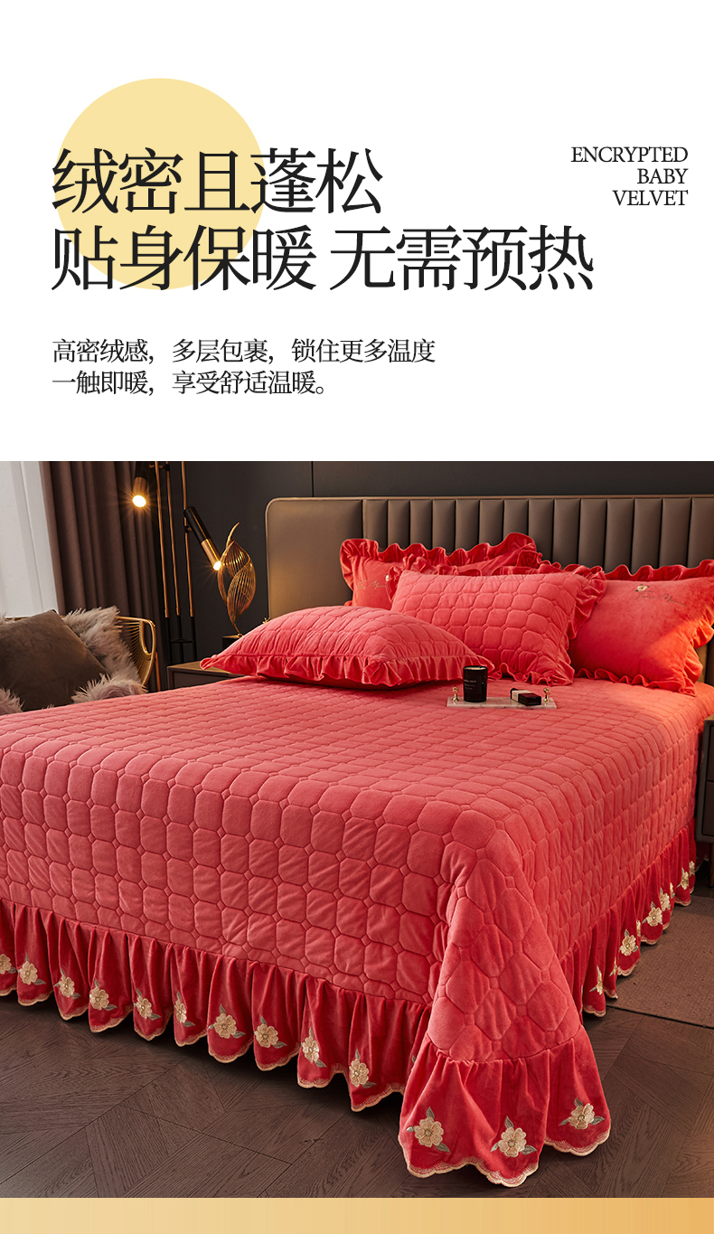 (总)恒爱 2022秋冬水晶绒翩翩花舞夹棉单床裙,大红色,豆沙红,橄榄绿,公主粉,桔色,咖啡色,孔雀绿,拉菲红,罗兰紫,玫红色,美人玉,米白色,米驼色,抹茶绿,浅灰色,紫色