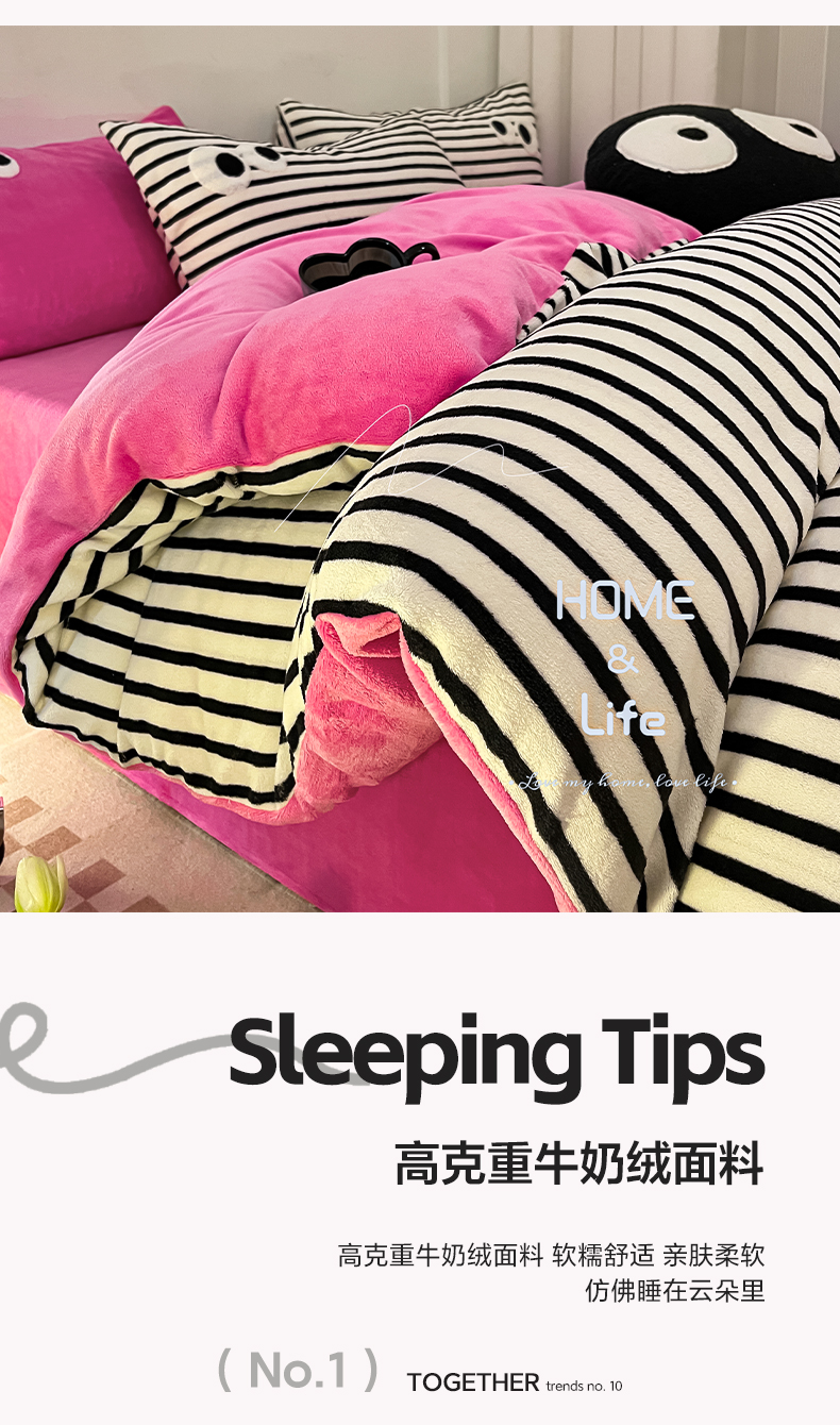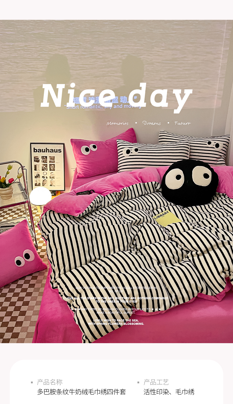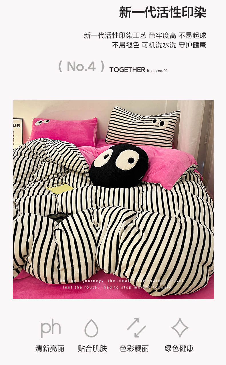 商品名称:如一 2023新款大眼萌条纹牛奶绒四件套 大眼萌-黑