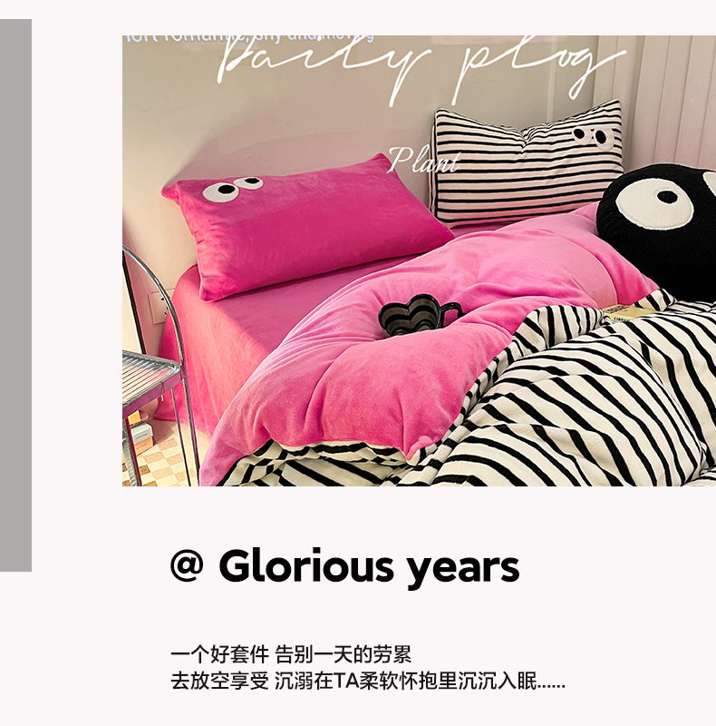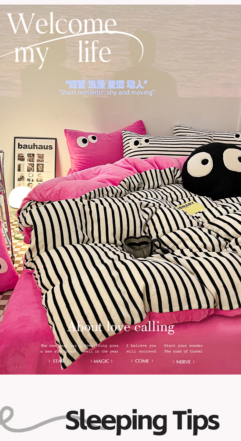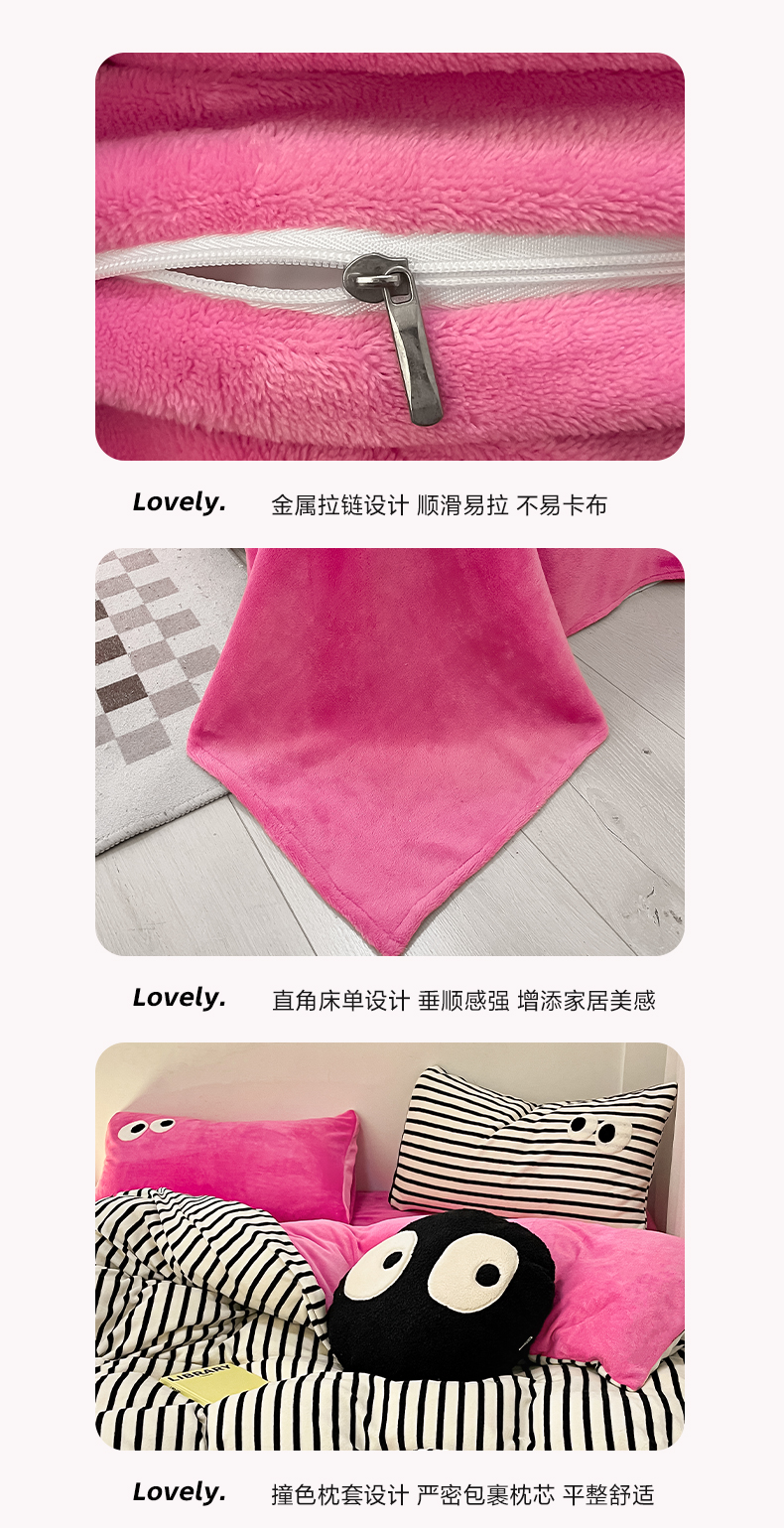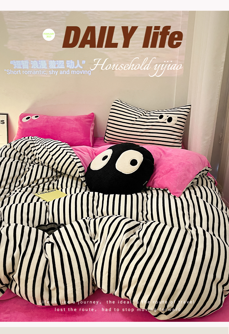 商品名称:如一 2023新款大眼萌条纹牛奶绒四件套 大眼萌-黑
