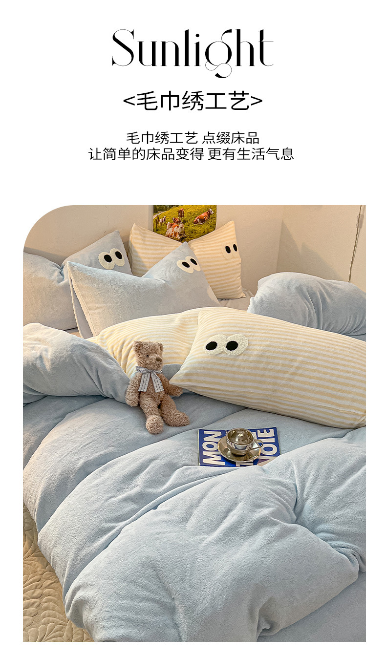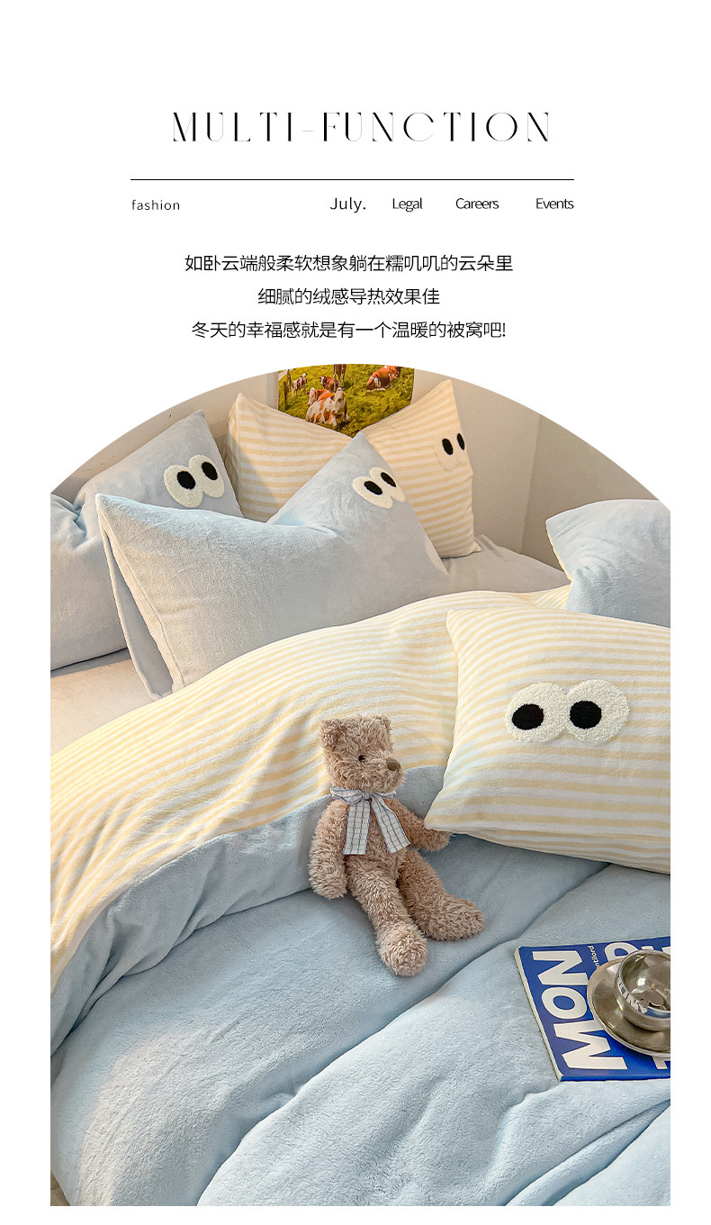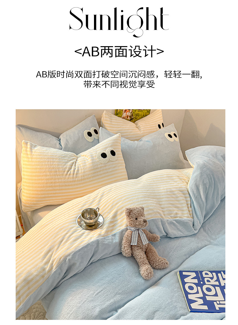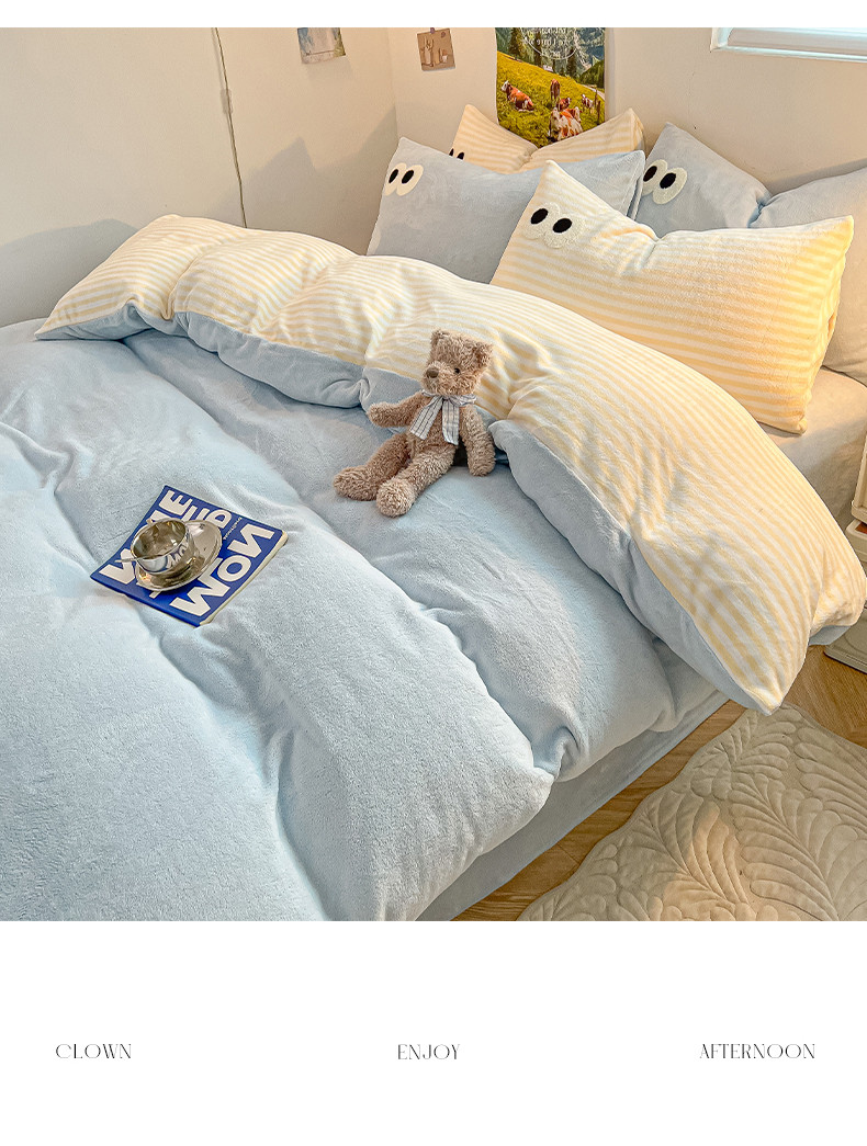 商品名称:韩都家居 2023新款加厚牛奶绒拼色四件套 大眼萌-小黄条