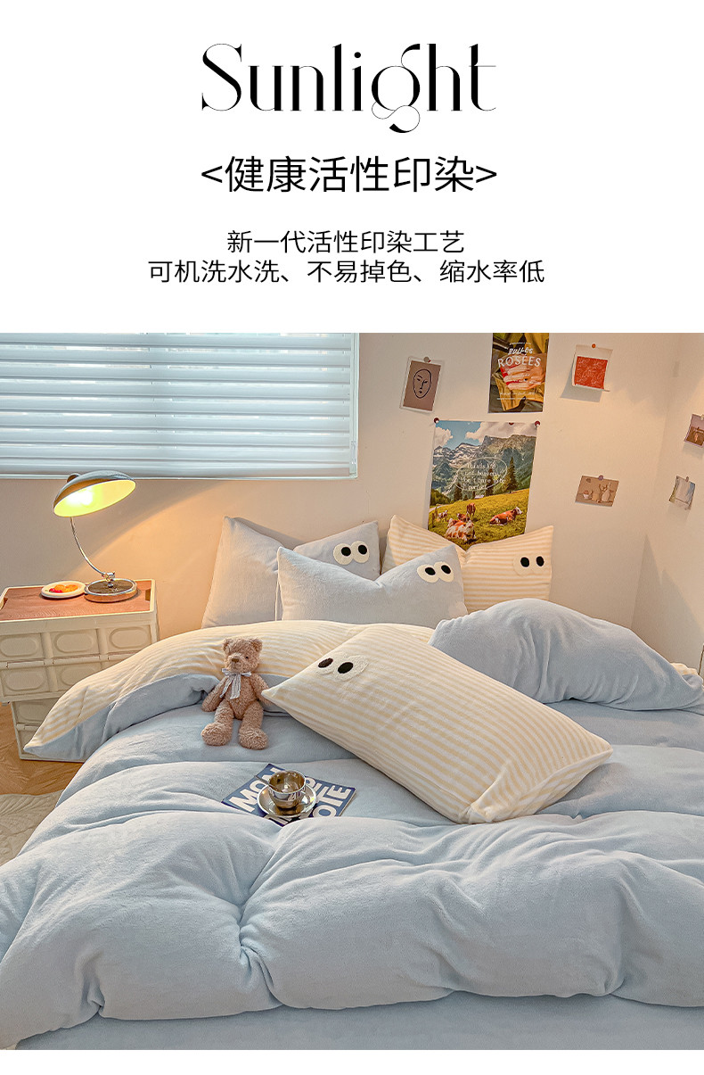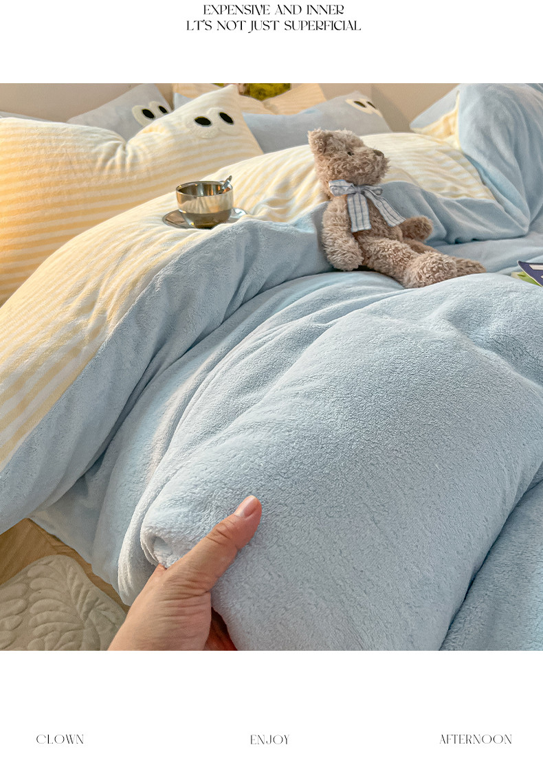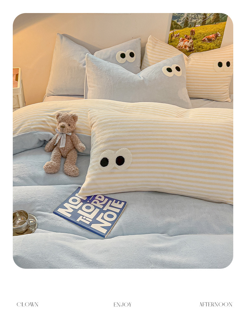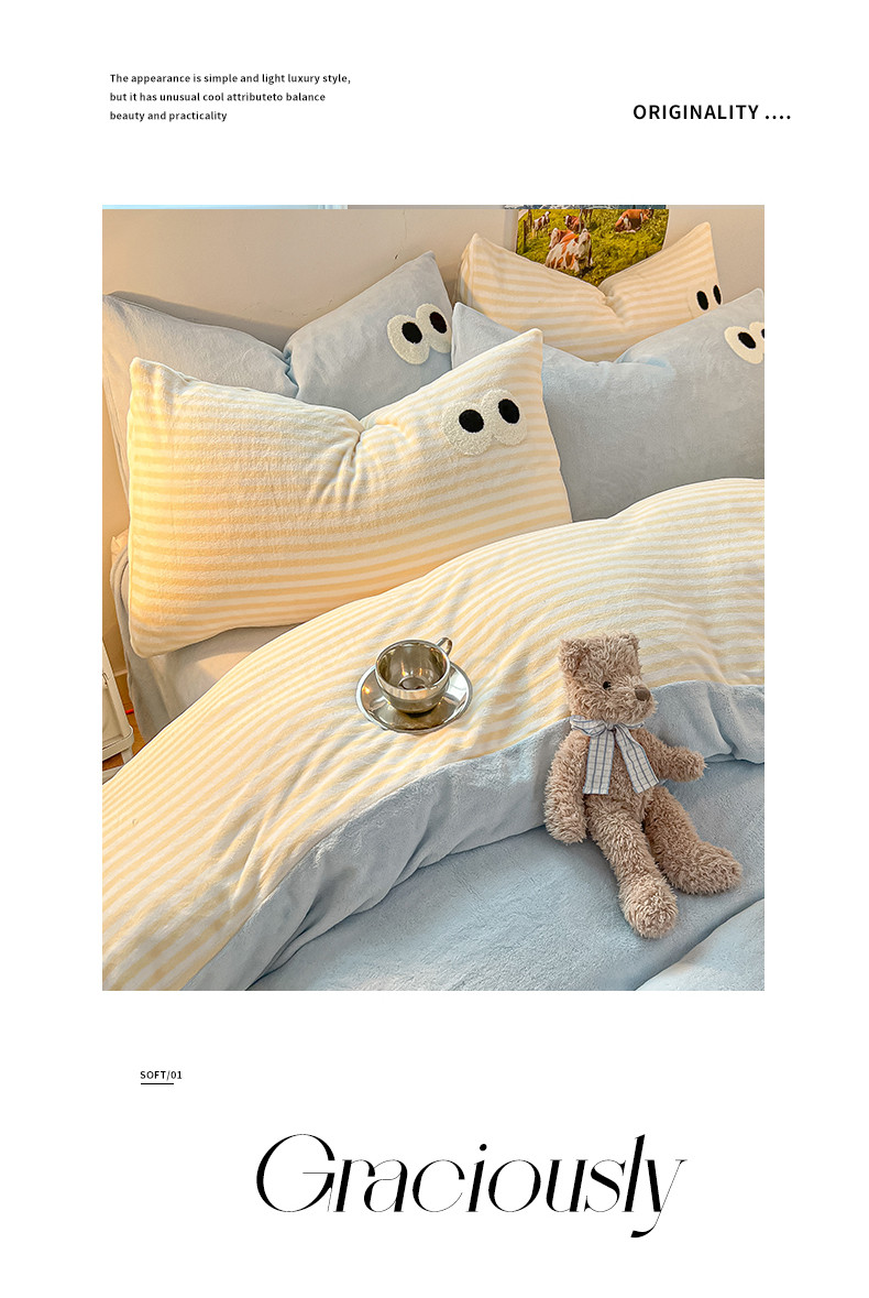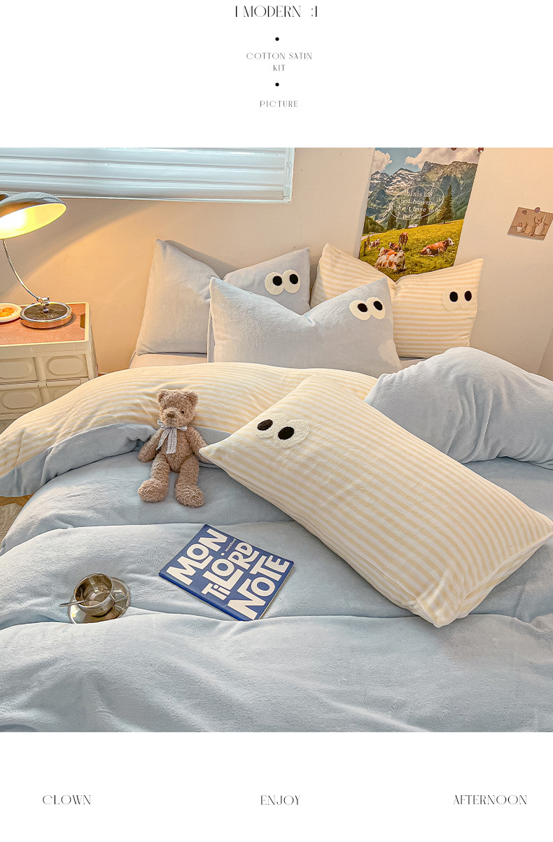 商品名称:韩都家居 2023新款加厚牛奶绒拼色四件套 大眼萌-小黄条
