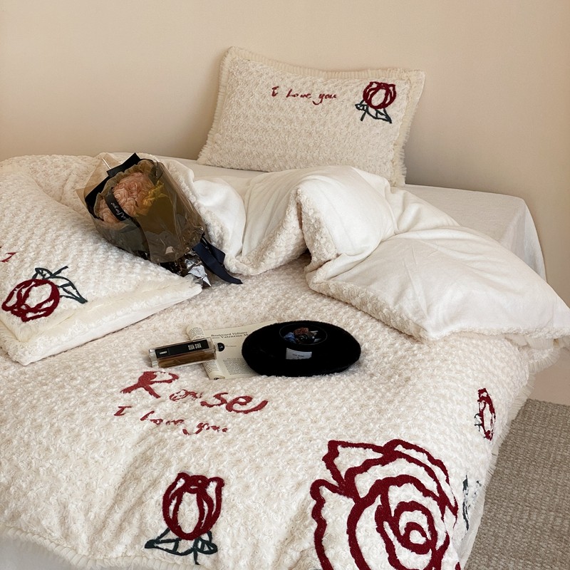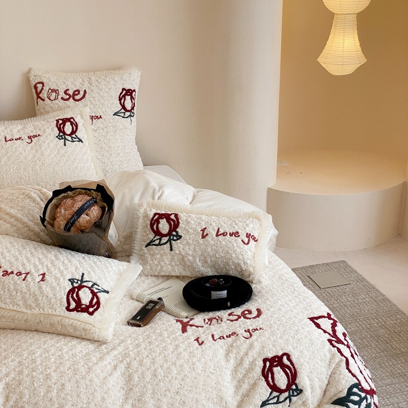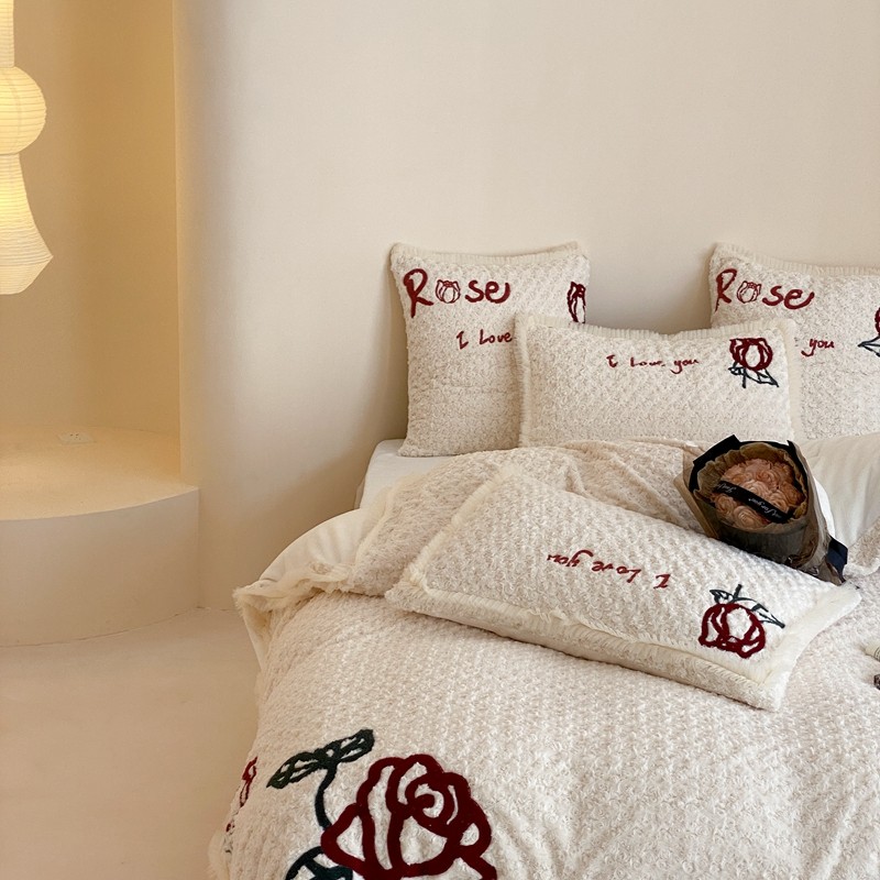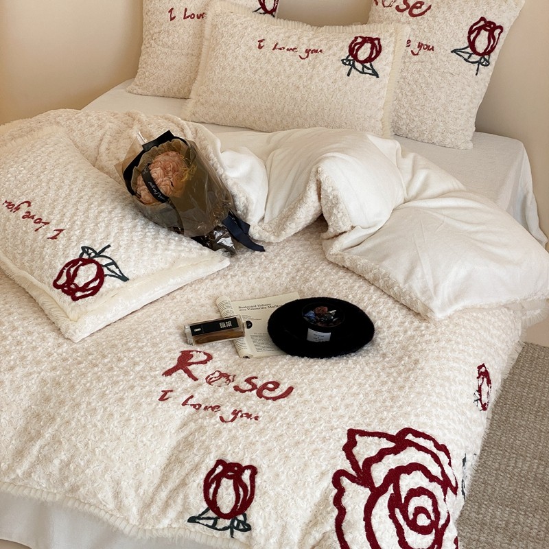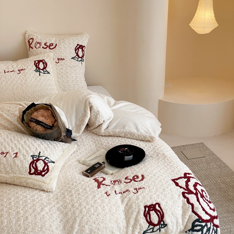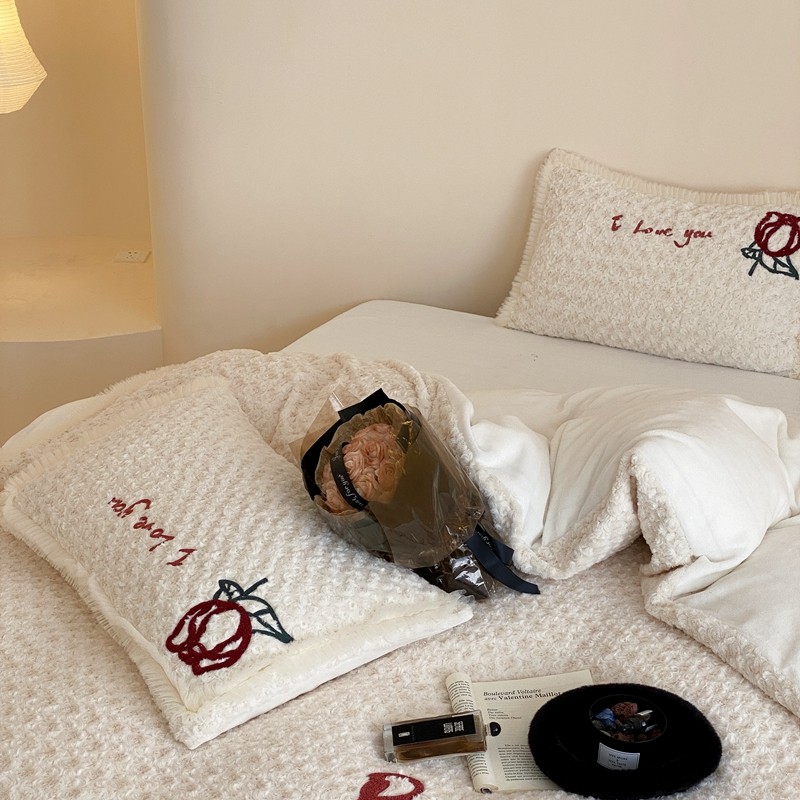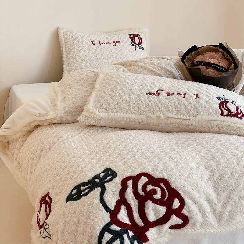 总 星野 2023秋冬新款兔毛绒牛奶绒毛巾绣抽褶花边四件套-玫瑰庄园