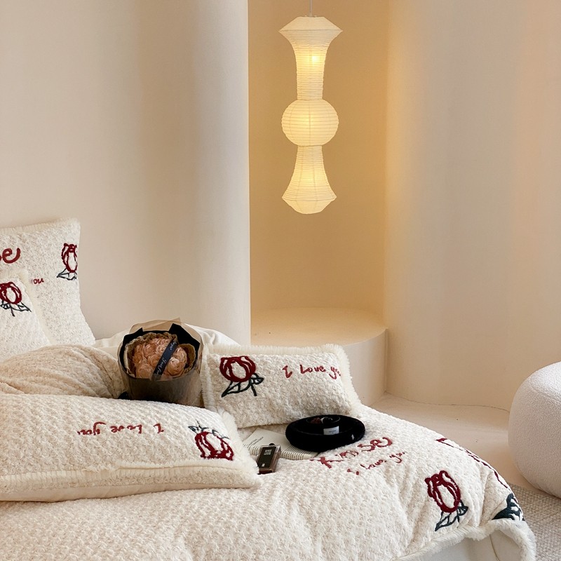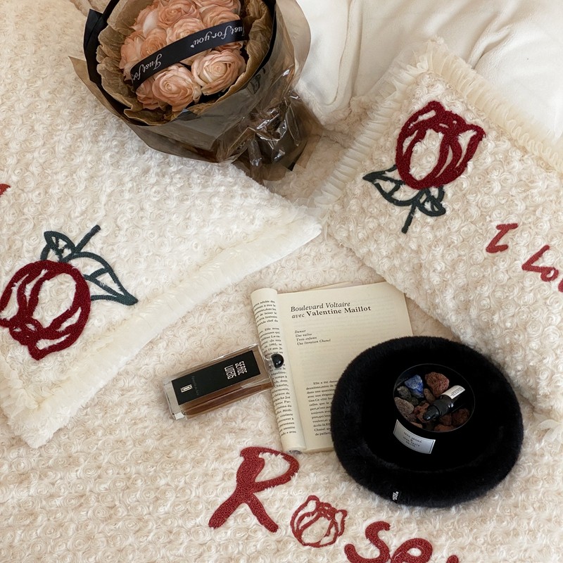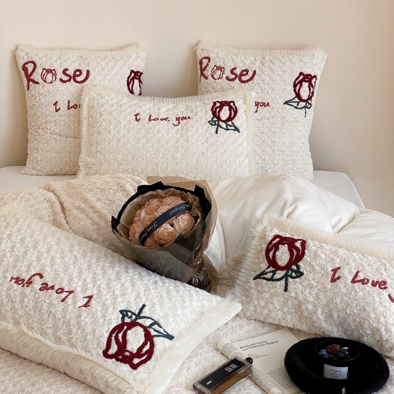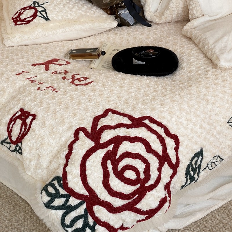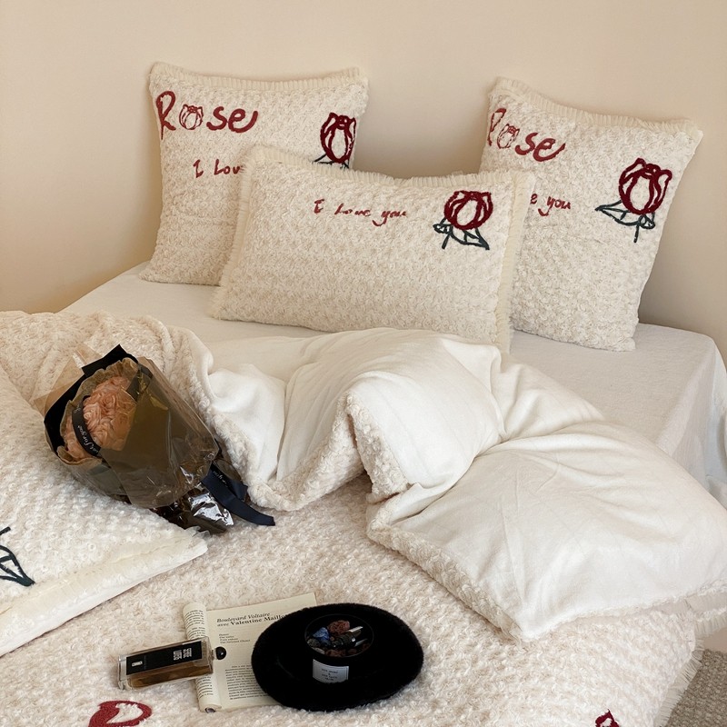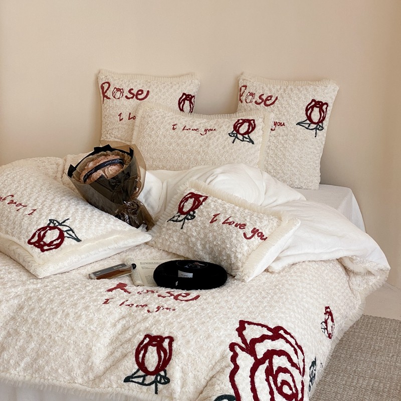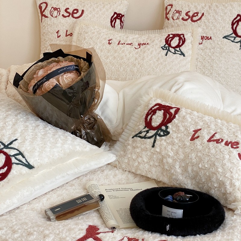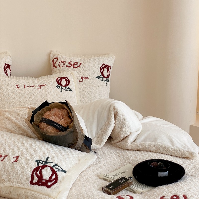 总 星野 2023秋冬新款兔毛绒牛奶绒毛巾绣抽褶花边四件套-玫瑰庄园