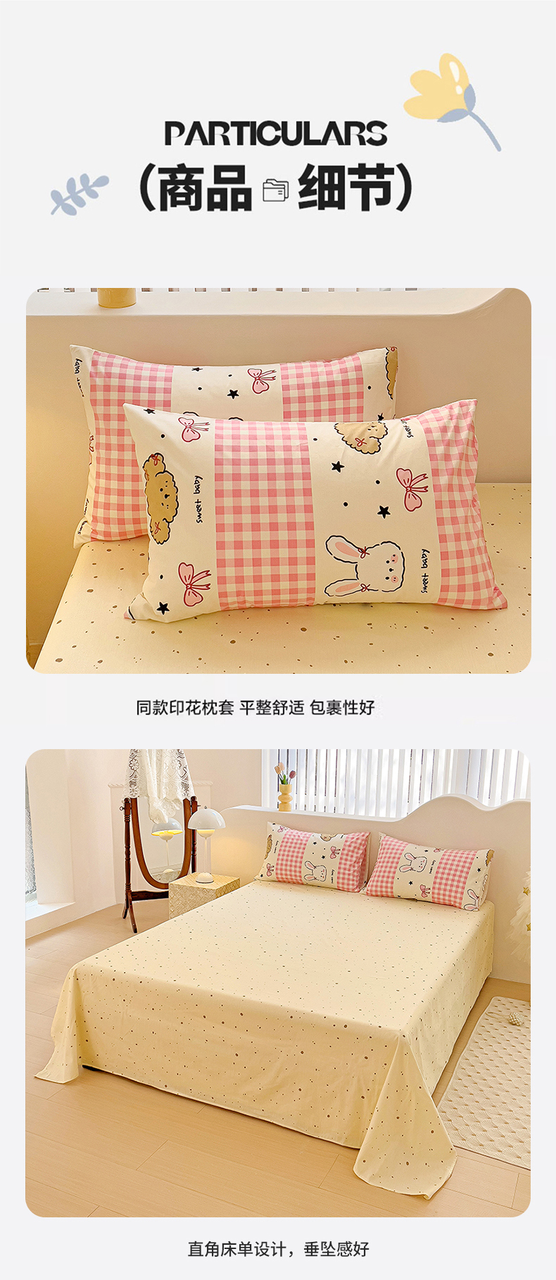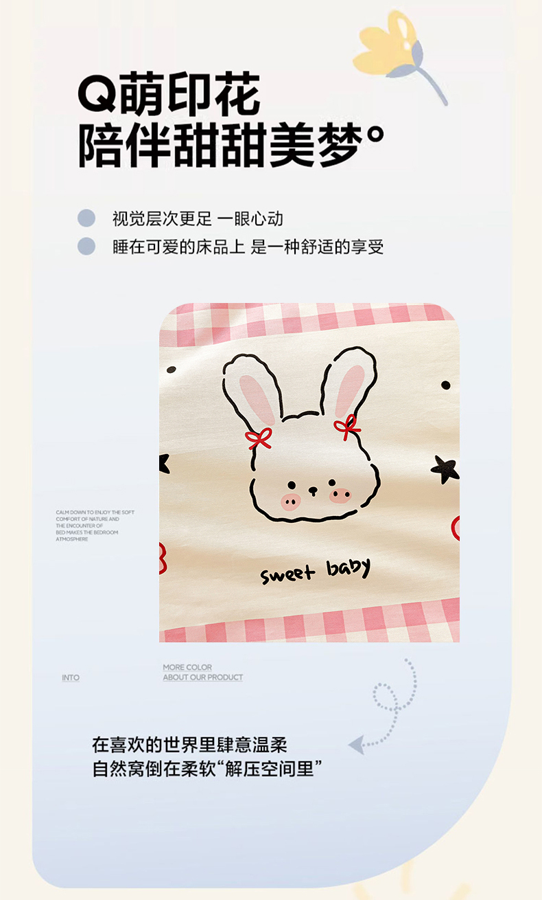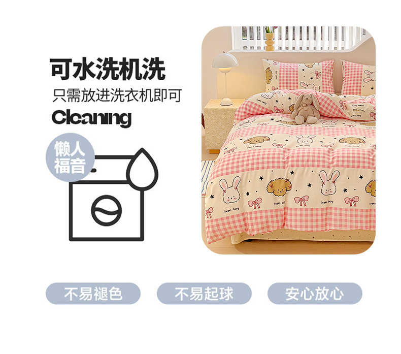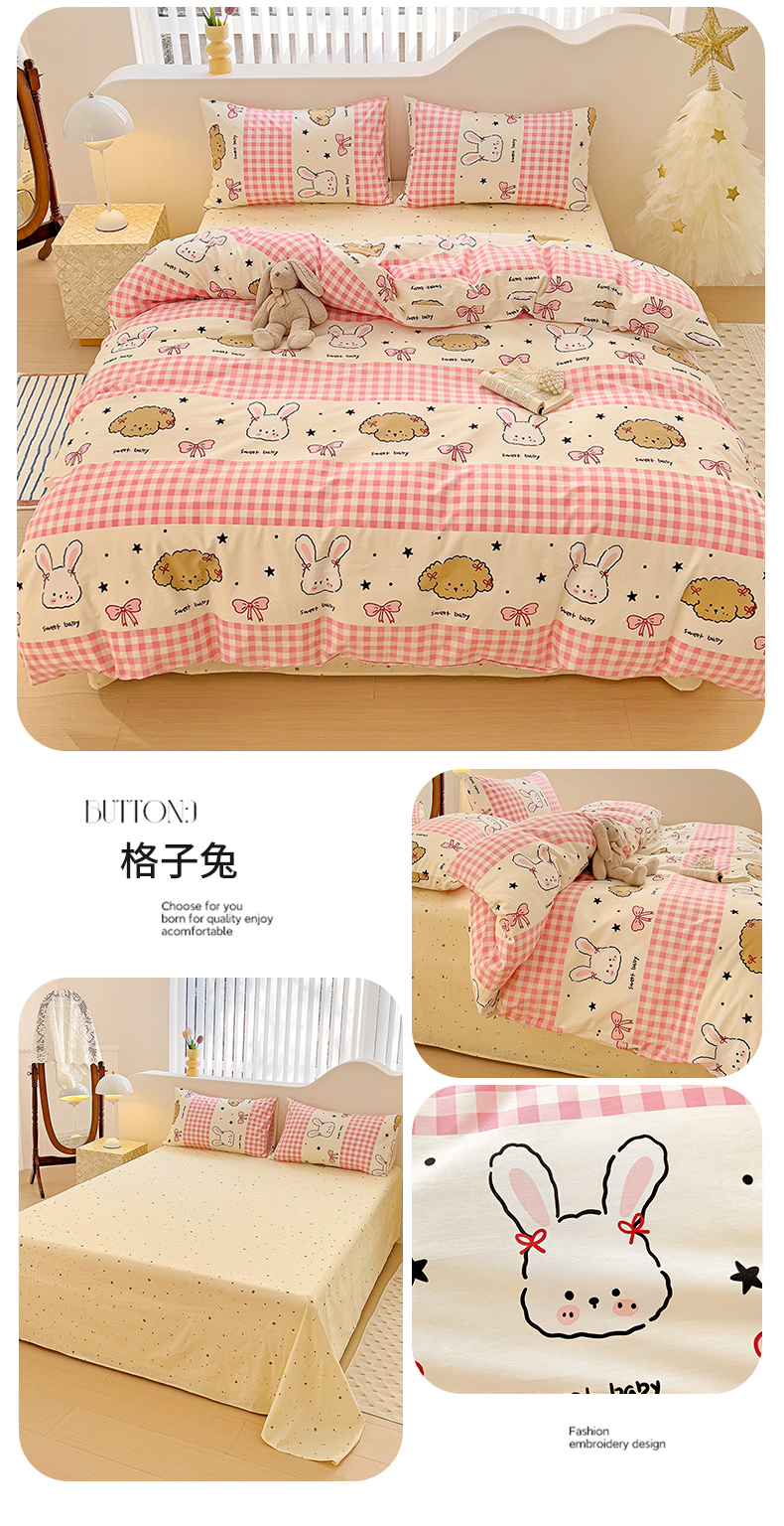 商品名称:珺柔家纺 2024新款40支13070全棉印花四件套 格子兔
