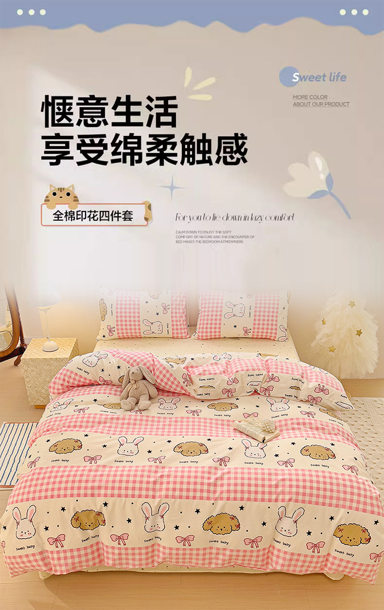 (总)珺柔家纺 2023新款13372全棉印花四件套,朵拉花园,粉色郁金香 ,可爱兔,迷你兔,太阳花,顽皮狗,喜结连理,薰衣草
