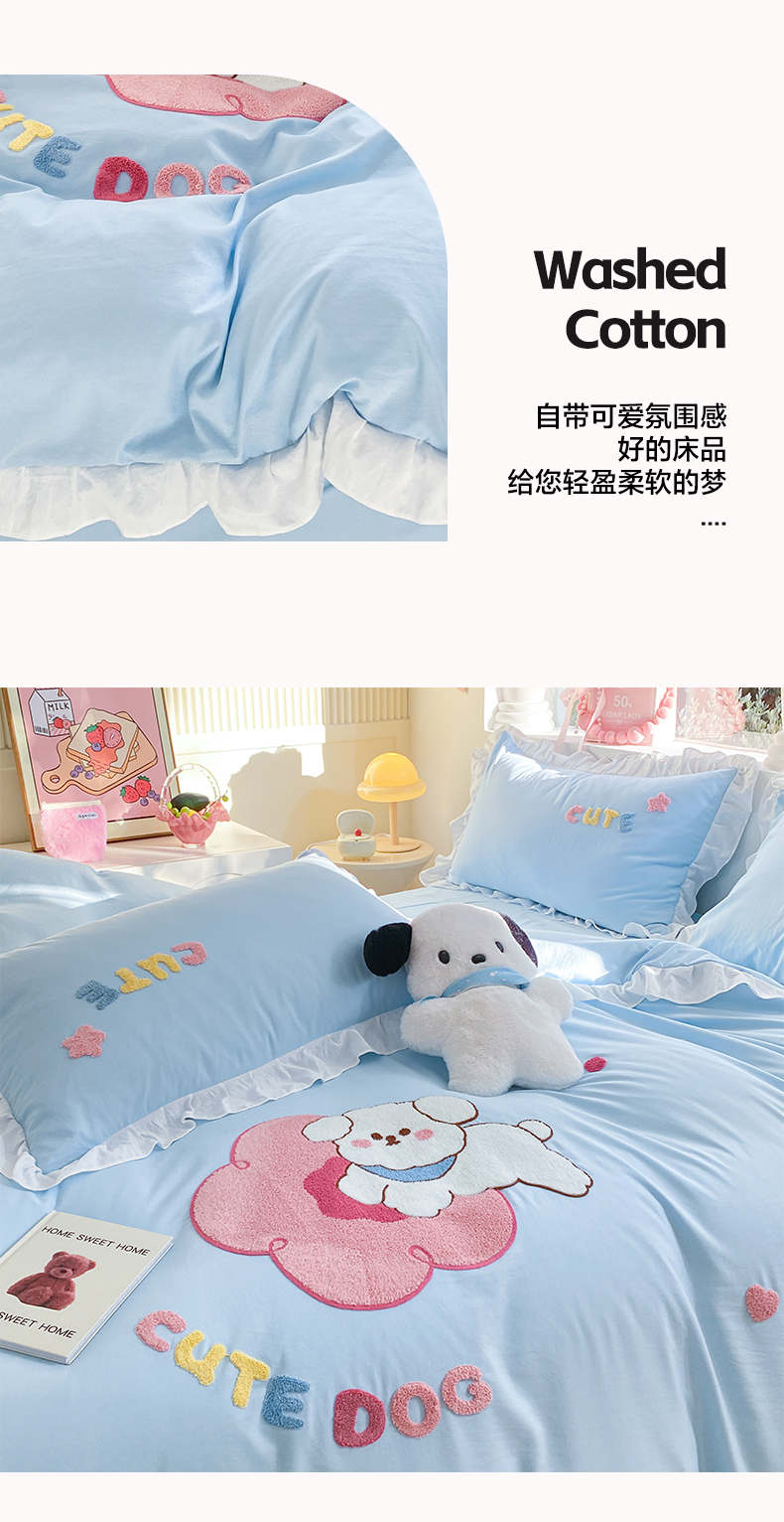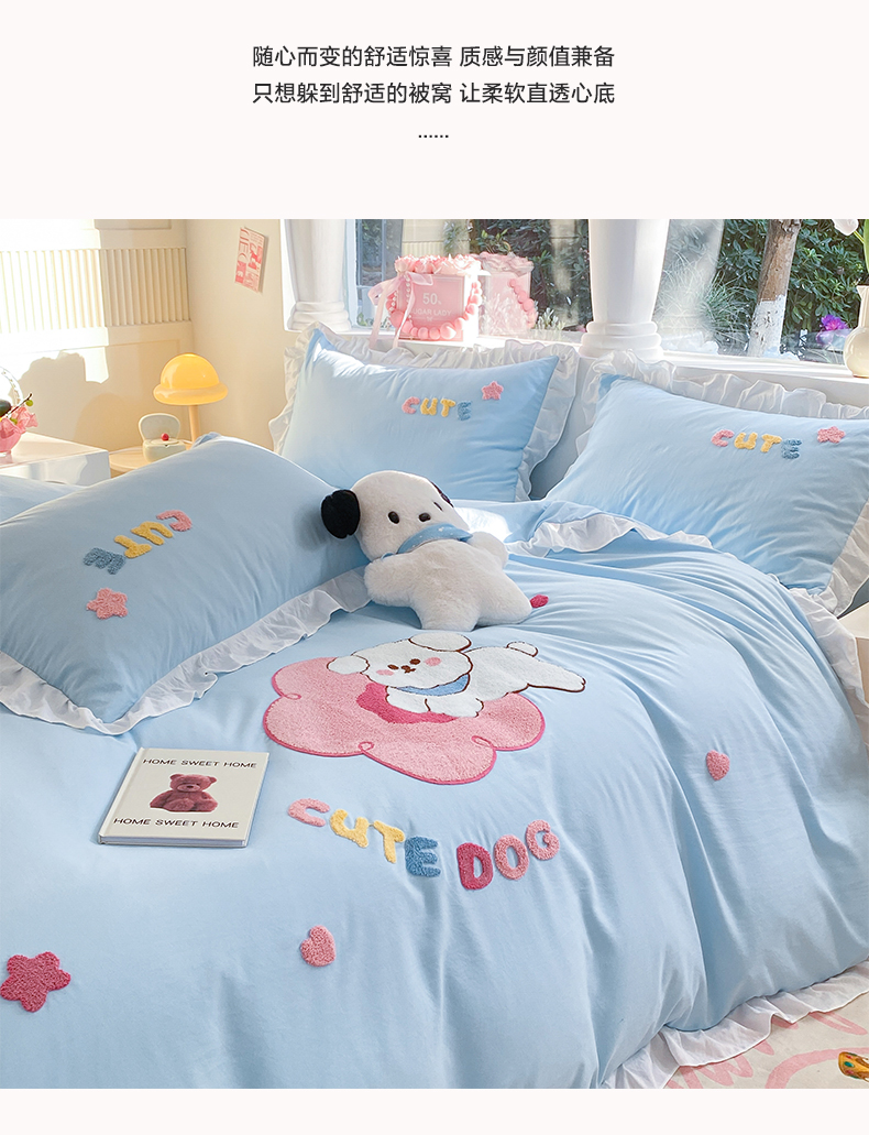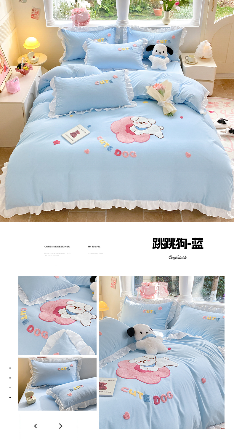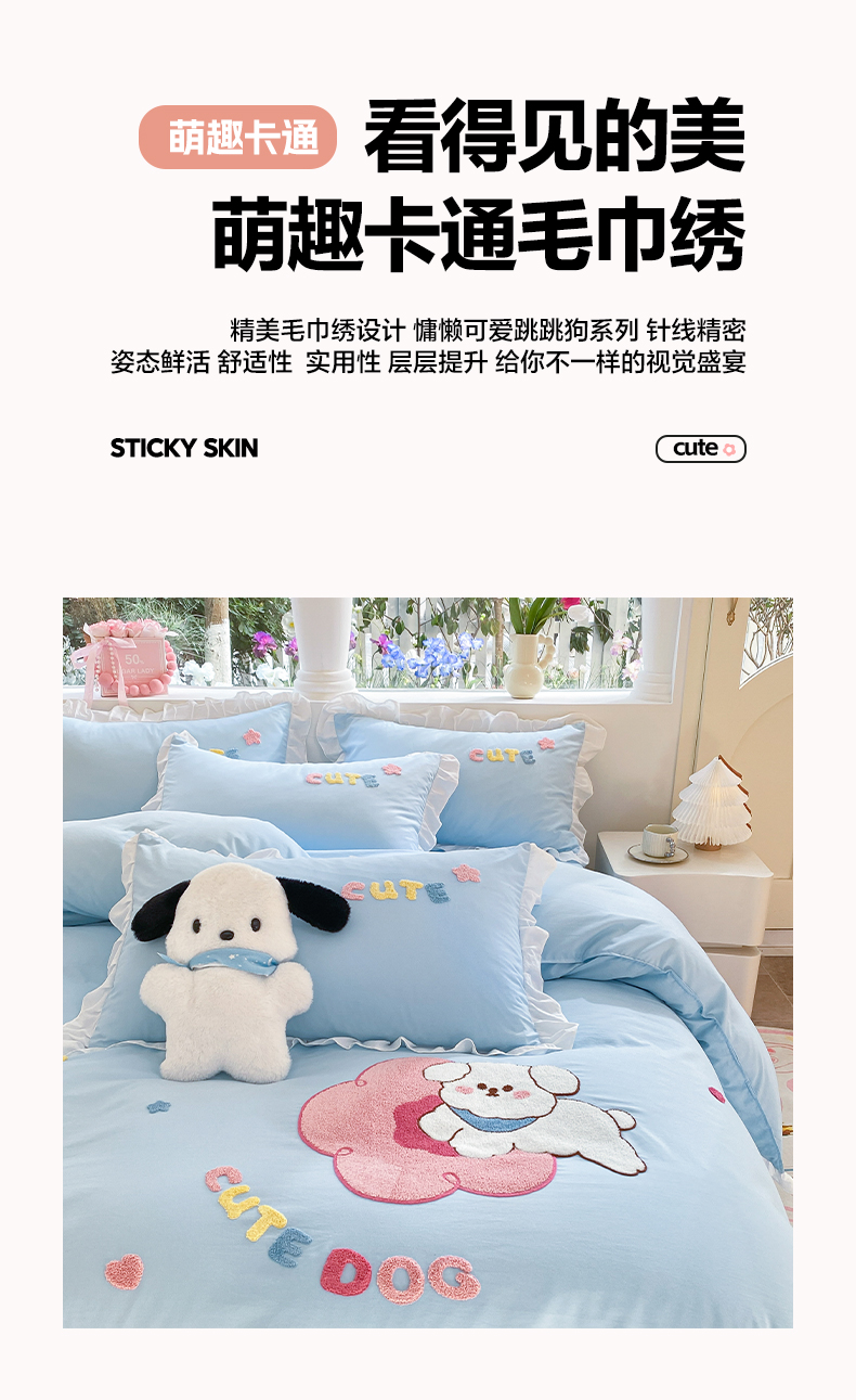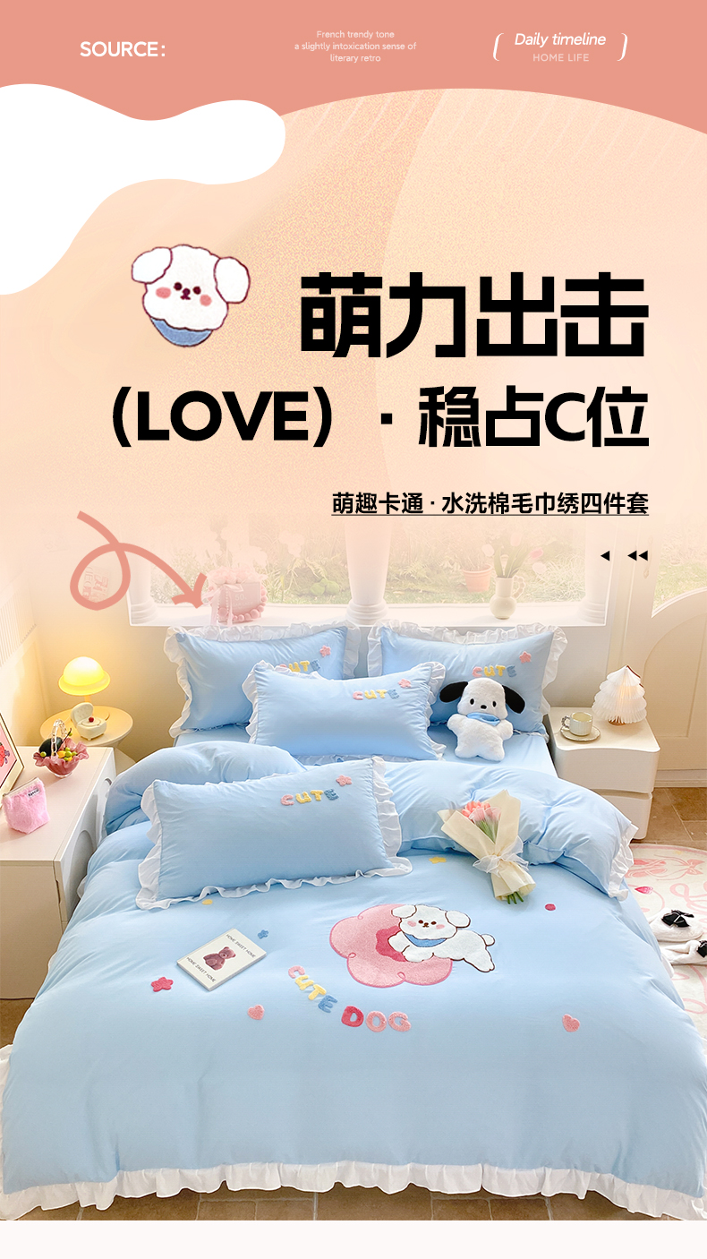 当前位置: 91家纺网 > 商品网购 > 床品套件 > 四件套 > 毛巾绣四件套 > 易禾家纺 2024新款专板花型亲肤水洗棉毛巾绣四件套-跳跳狗 跳跳狗-蓝