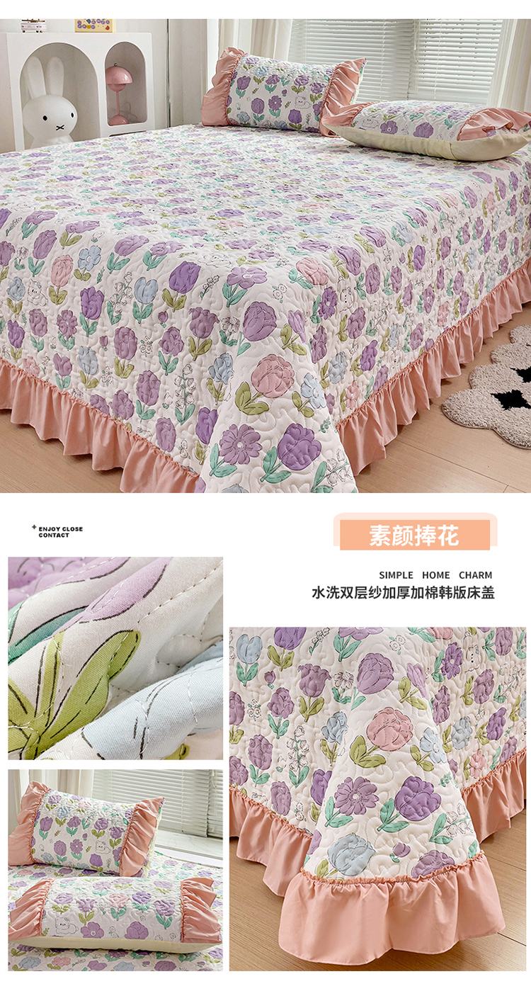 纽缦家纺 2024水洗双层纱加厚加棉韩版床盖 素颜捧花