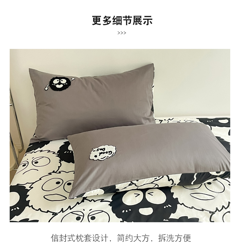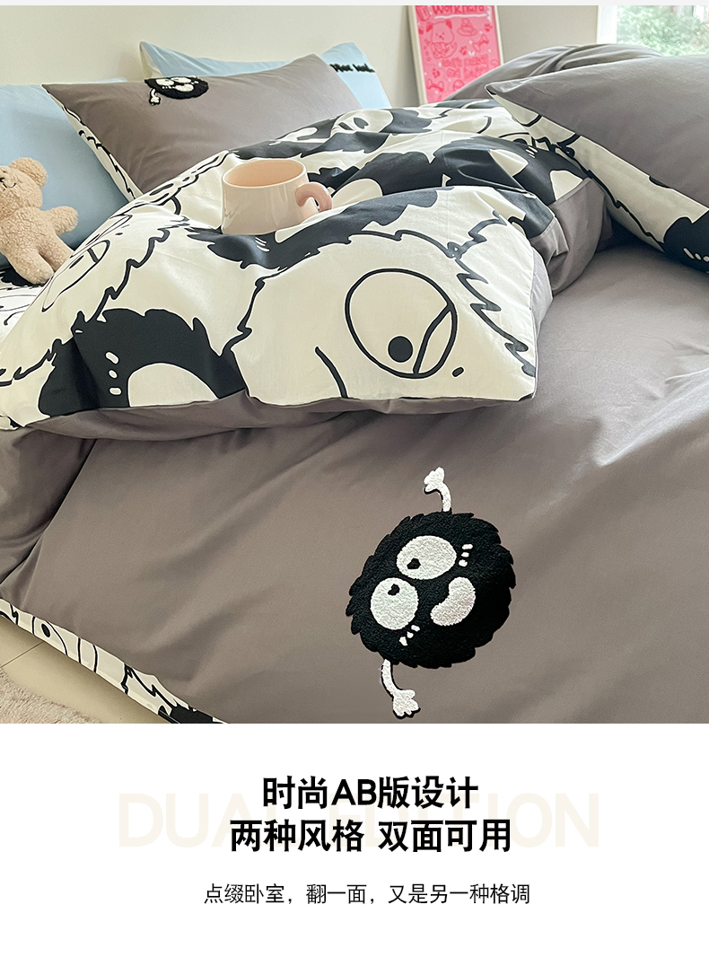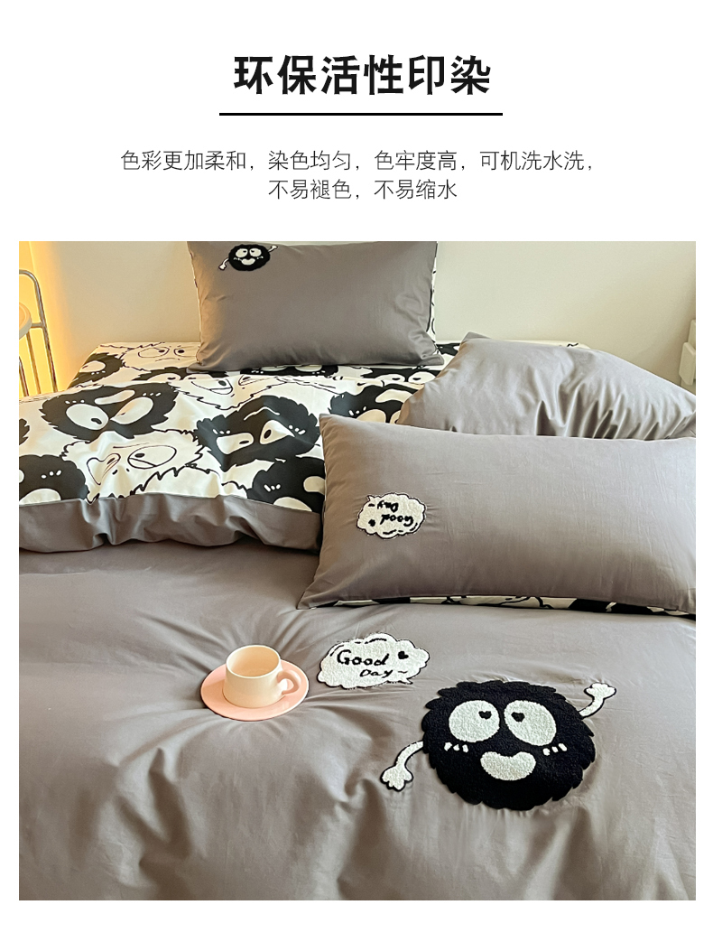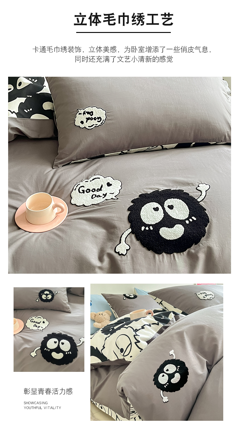 商品名称:金丝鸟家纺 2024新款全棉混搭毛巾绣四件套可爱卡通库洛米系列 灰色小煤球