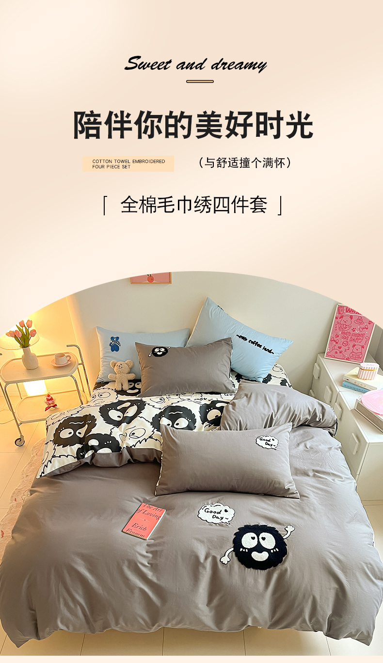 金丝鸟家纺 2024新款全棉混搭毛巾绣四件套可爱卡通库洛米系列 灰色小煤球