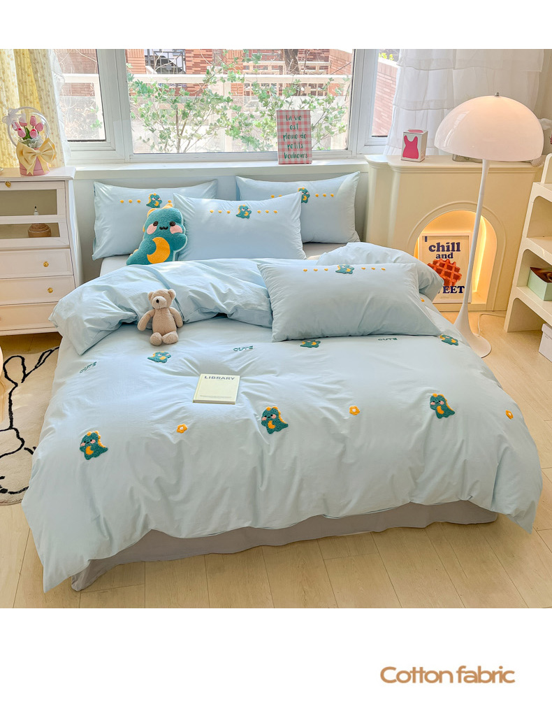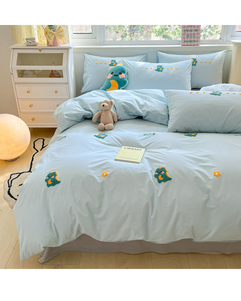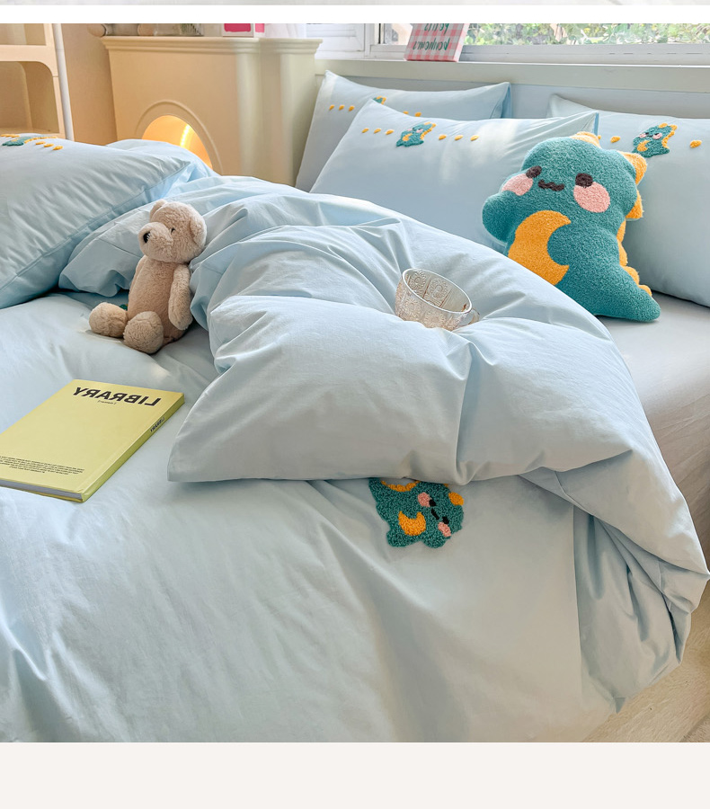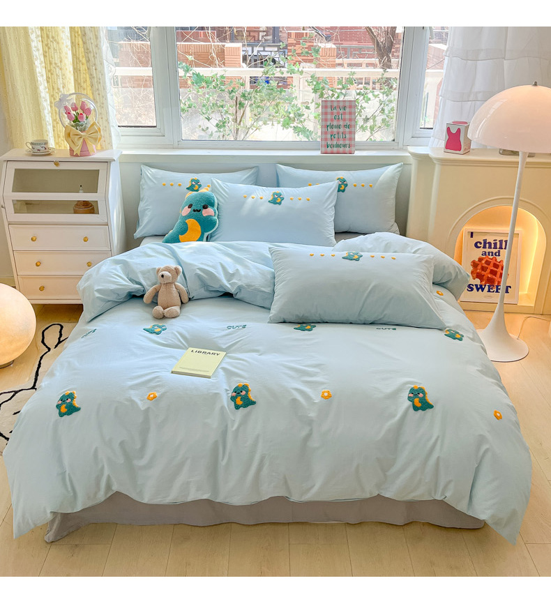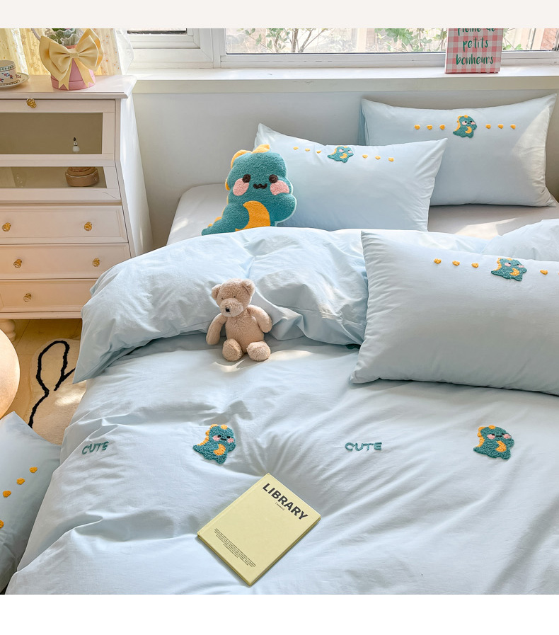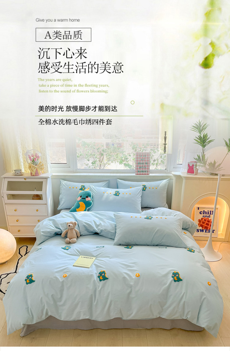 寐居家纺 2024新款全棉水洗棉毛巾绣色织四件套 萌宠恐龙-蓝