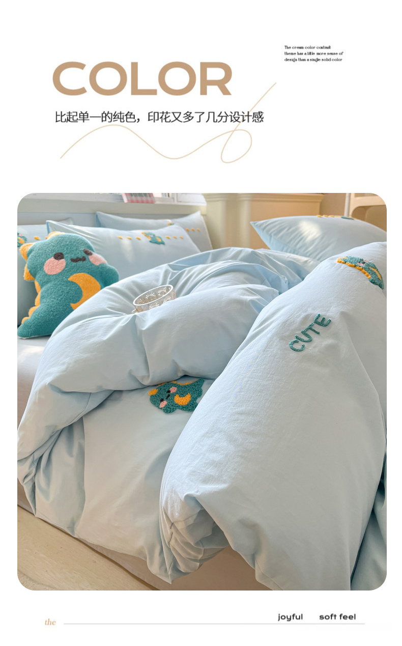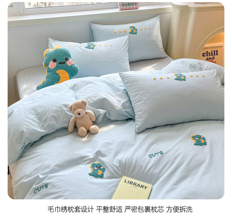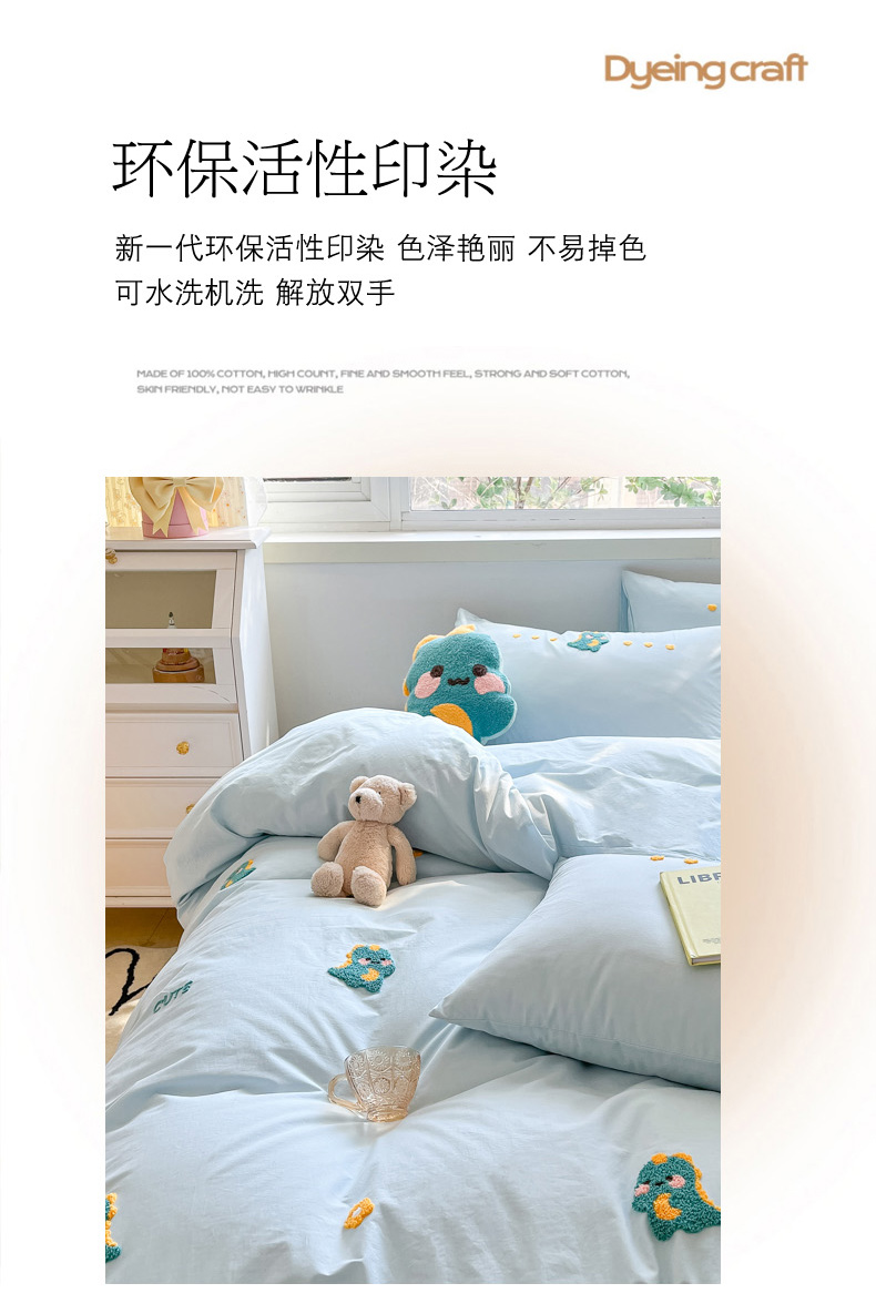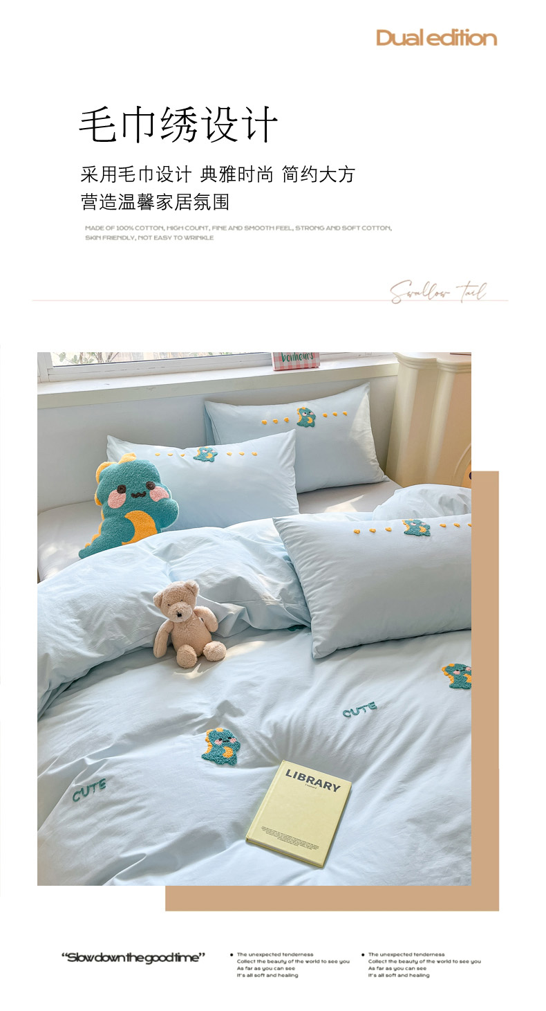 商品名称:寐居家纺 2024新款全棉水洗棉毛巾绣色织四件套 萌宠恐龙-蓝
