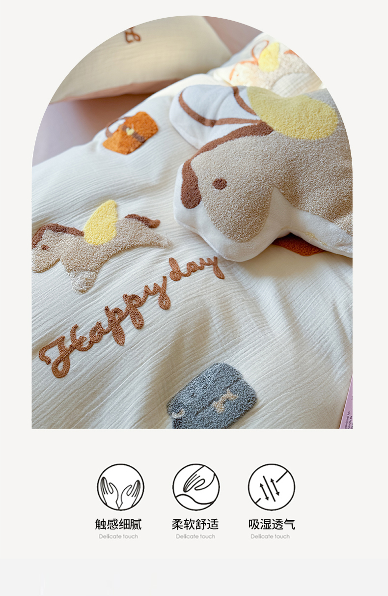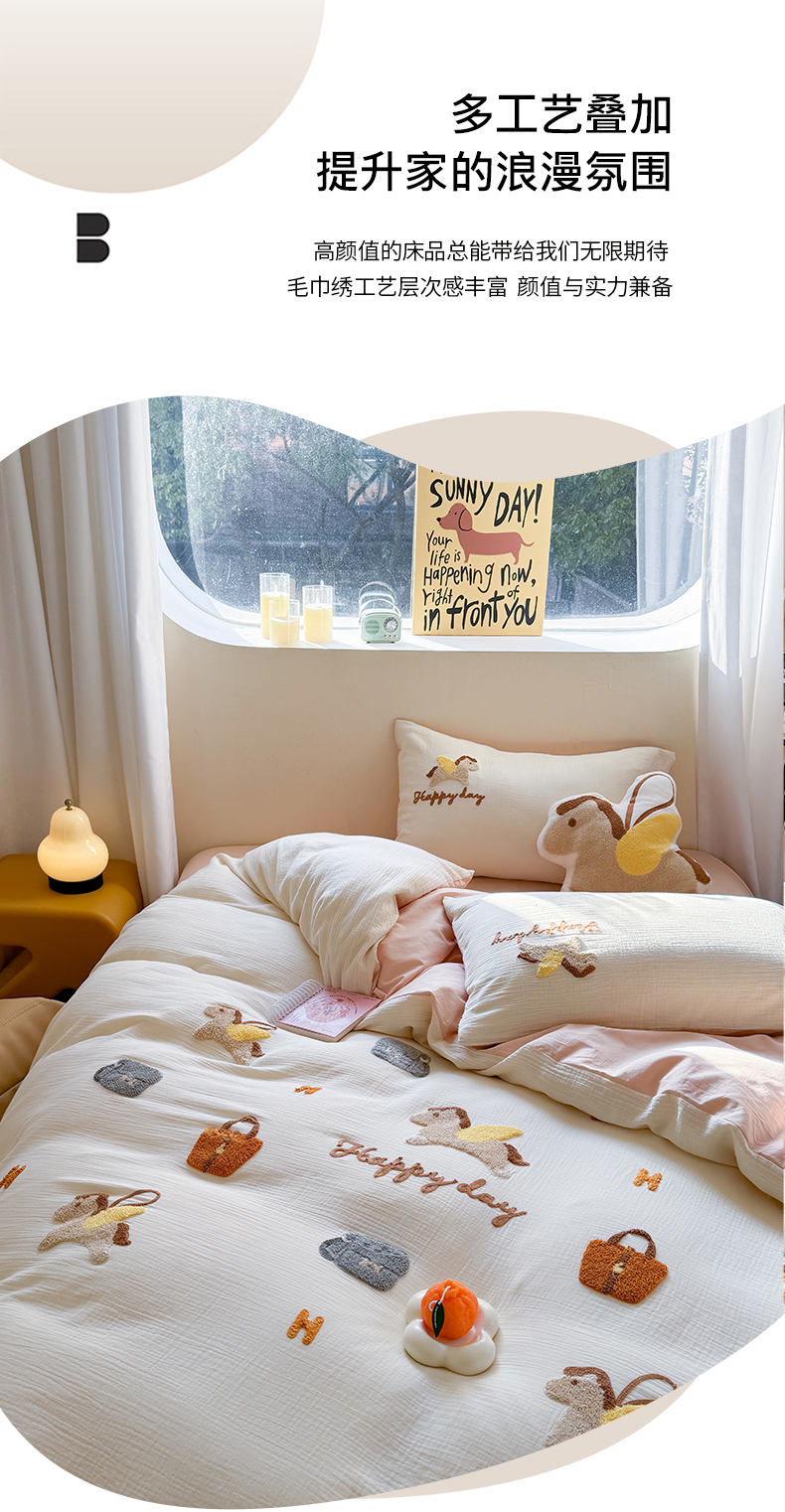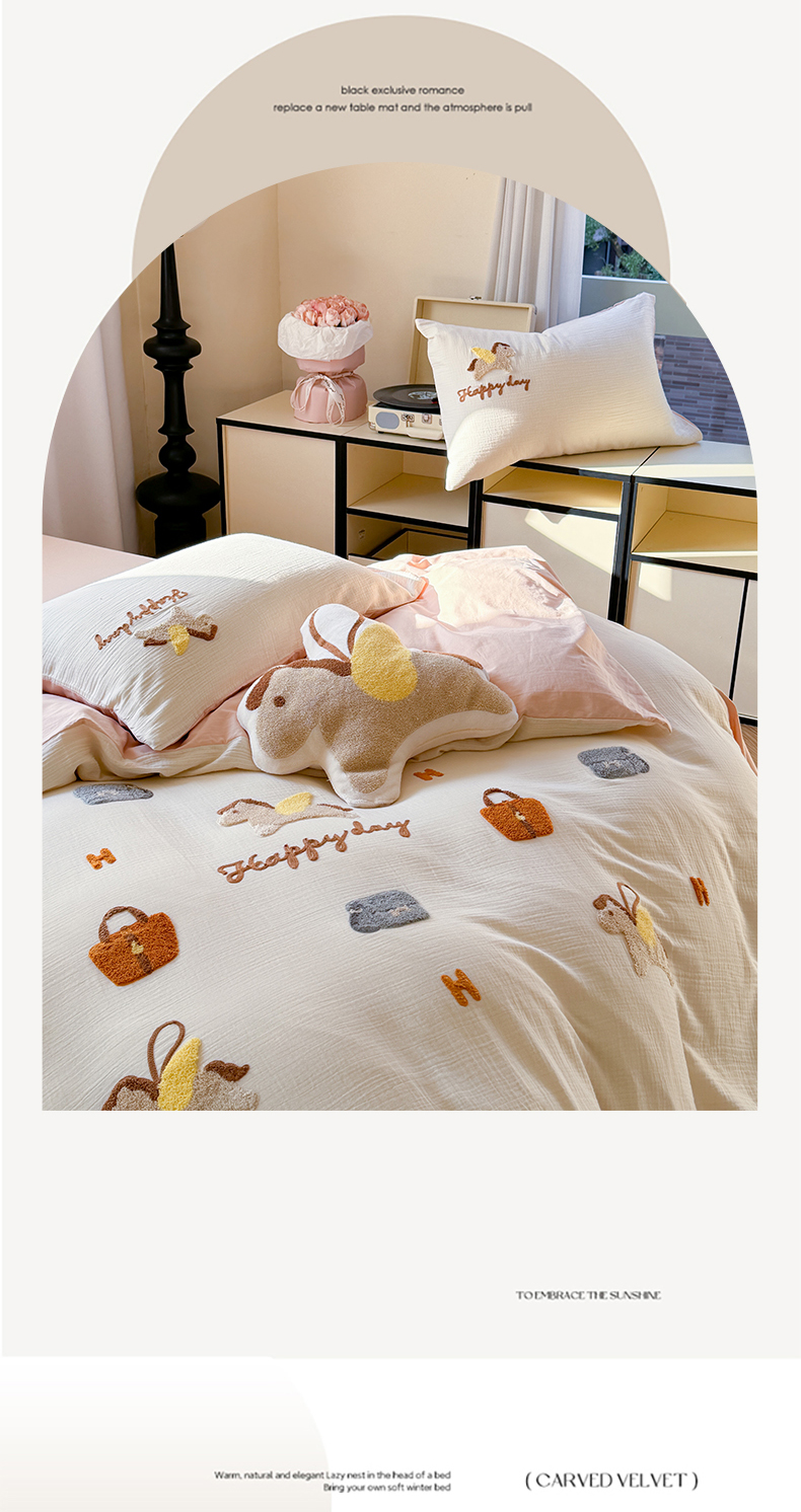 (总)眠屿家纺 2025新款加厚牛奶绒毛巾绣四件套,乐趣,面包狗,玩偶,玩泡泡