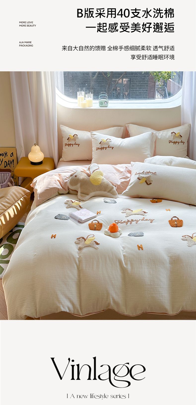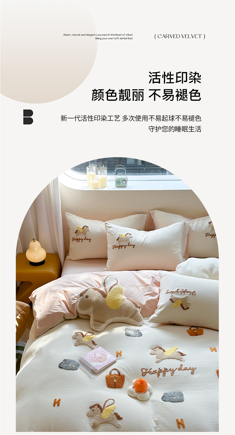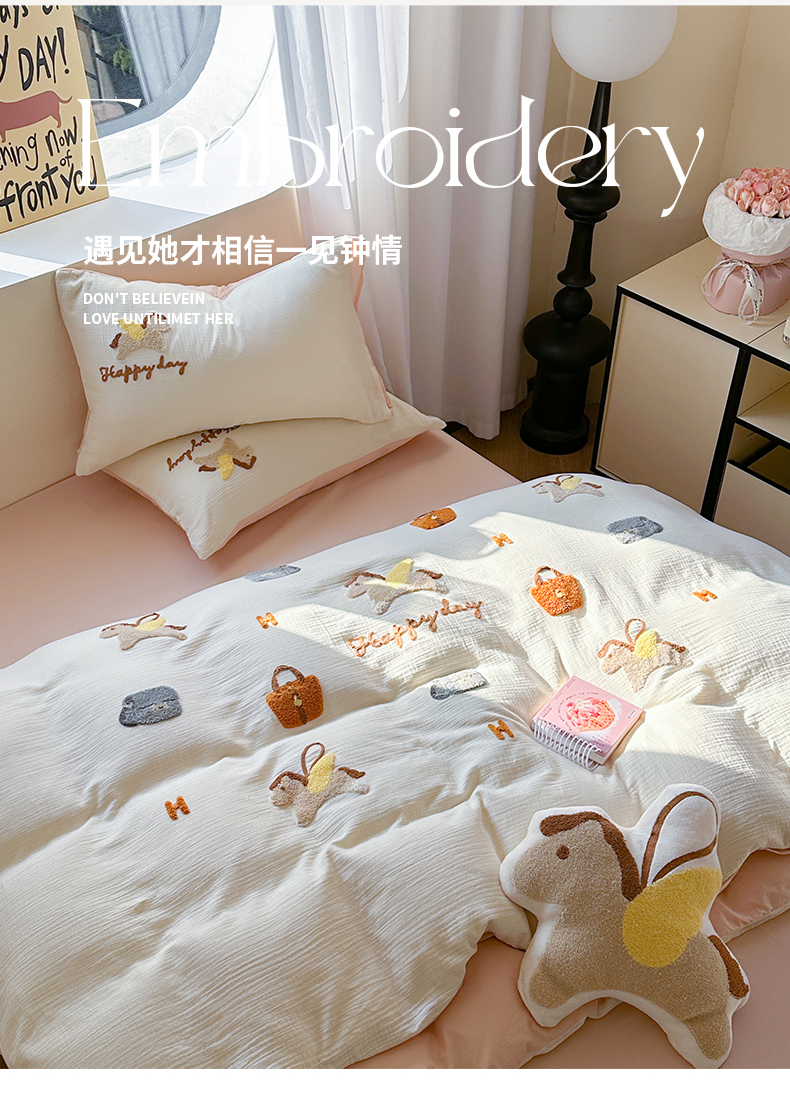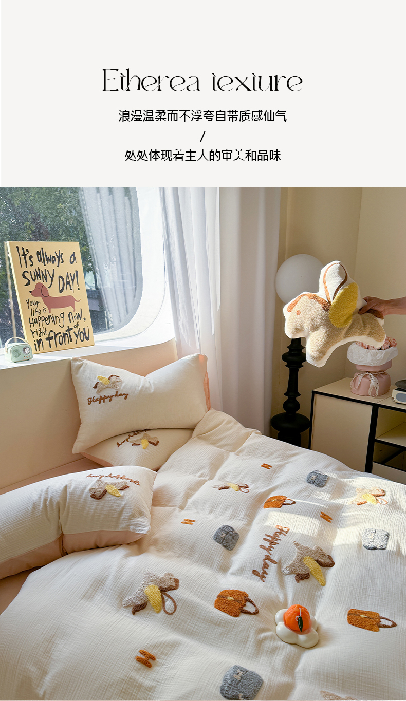 (总)眠屿家纺 2025新款全棉秋冬磨毛贴布绣四件套,爱心猫咪,蛋糕狗狗,可爱玩偶,热量100%