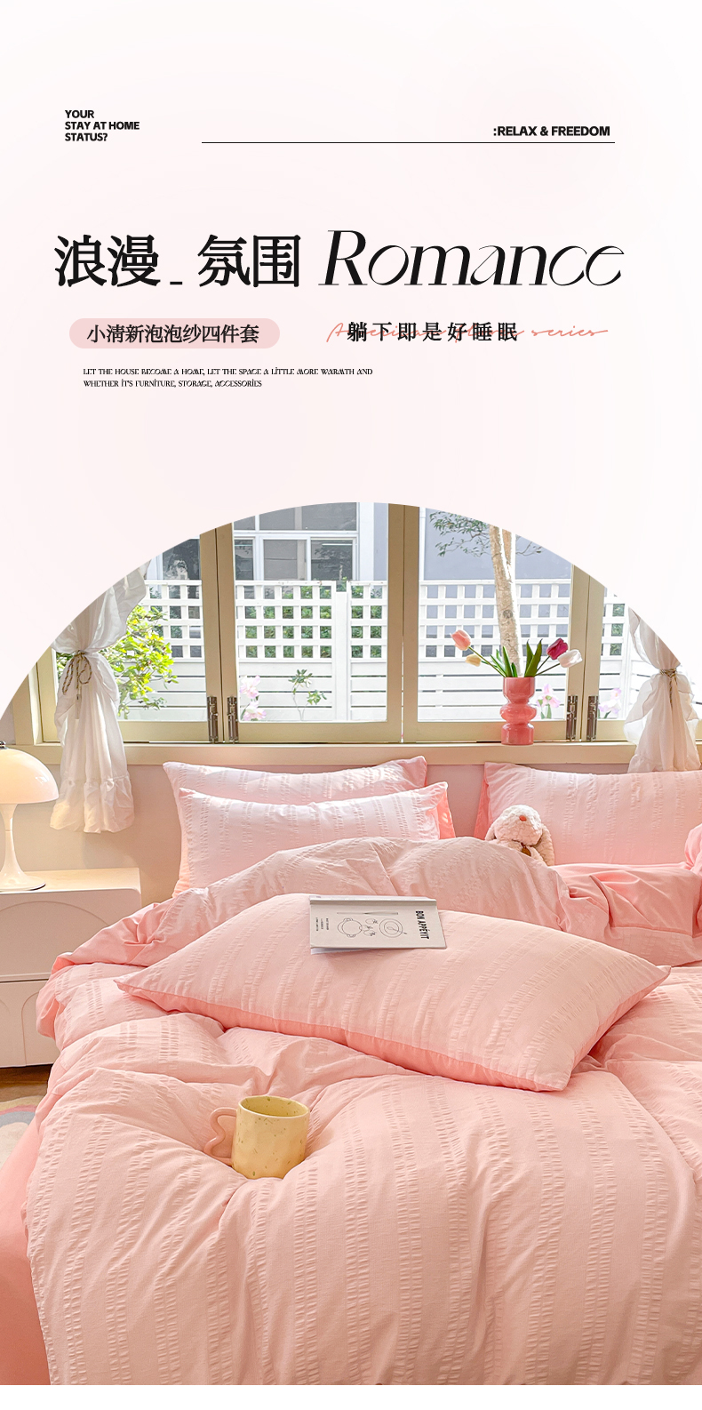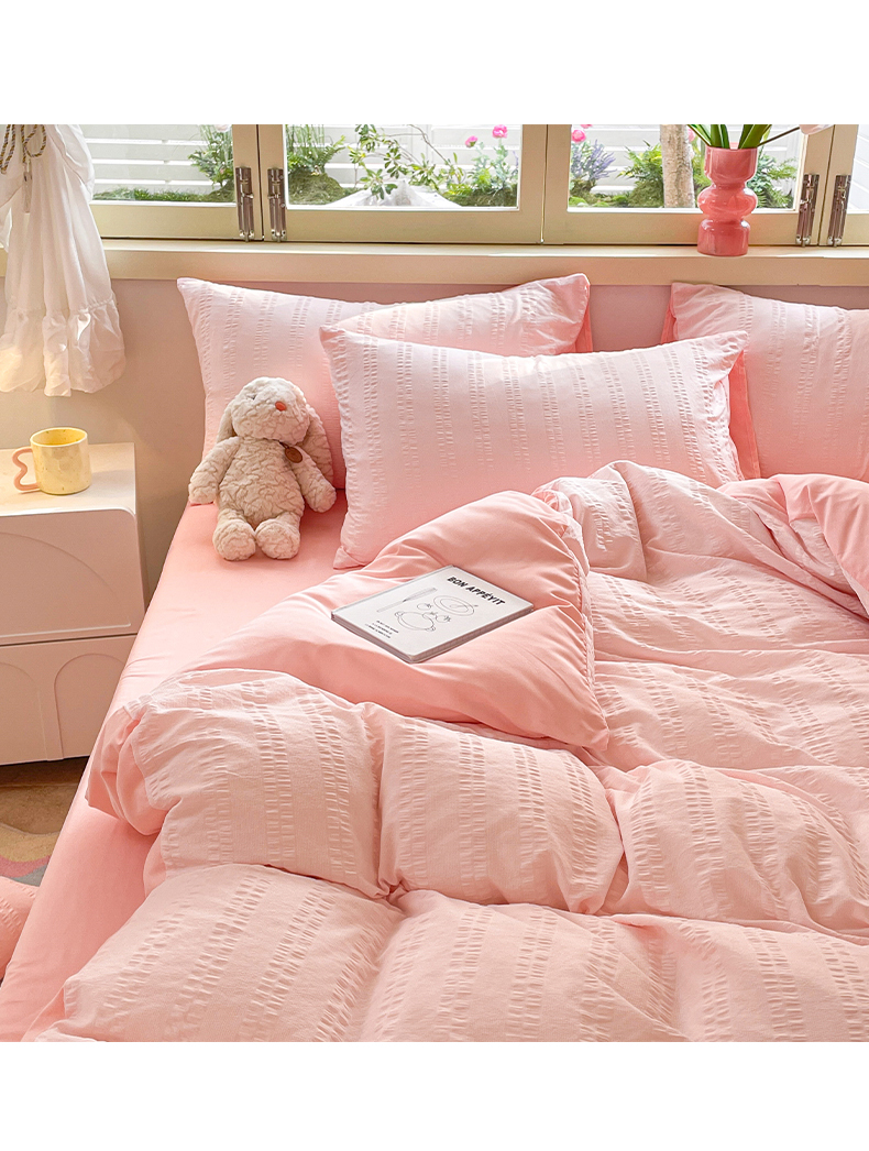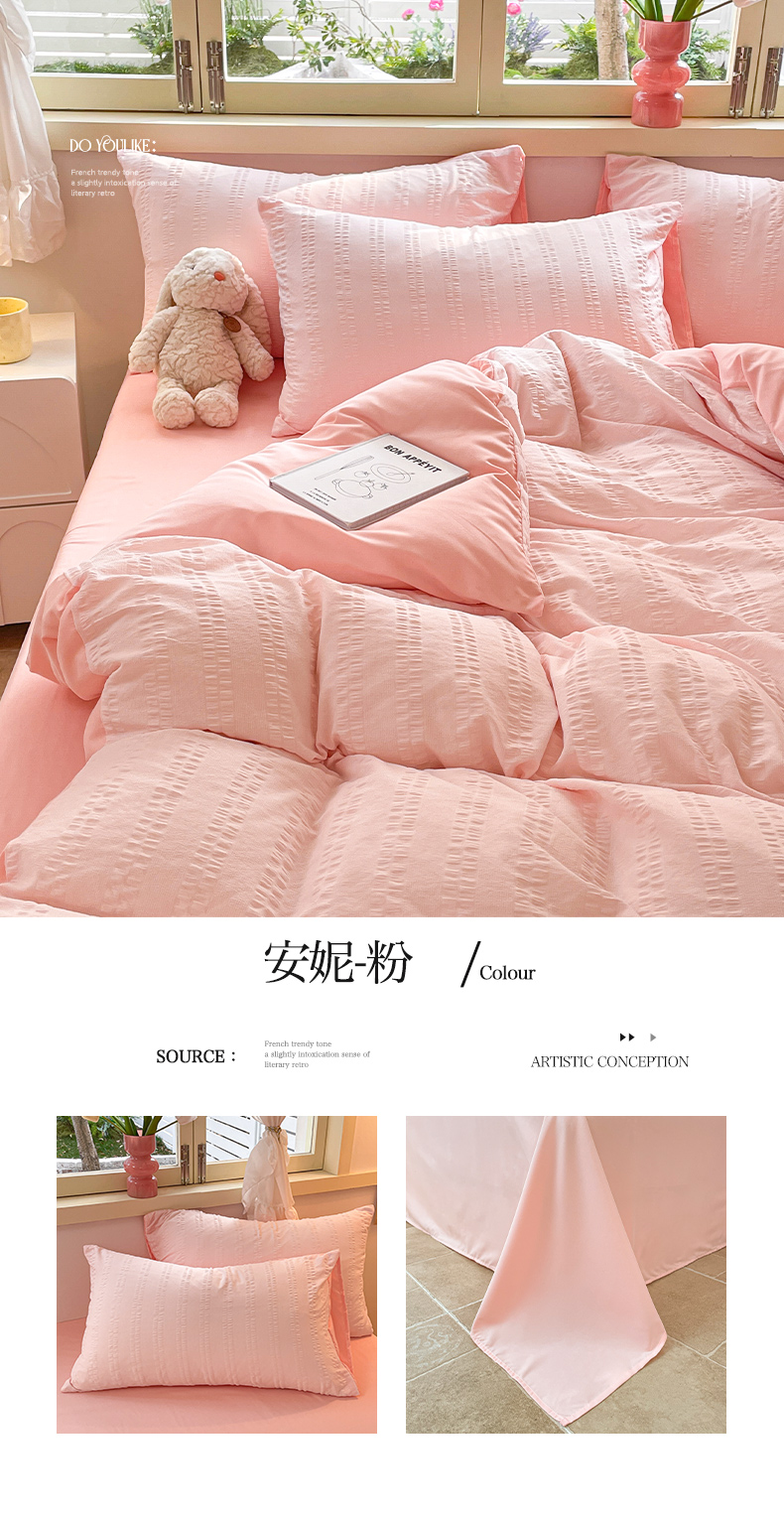 当前位置: 91家纺网 > 商品网购 > 床品套件 > 四件套 > 普通磨毛四件套 > 梦之岛 2024新款小清新泡泡纱安妮系列水洗磨毛四件套 安妮-粉