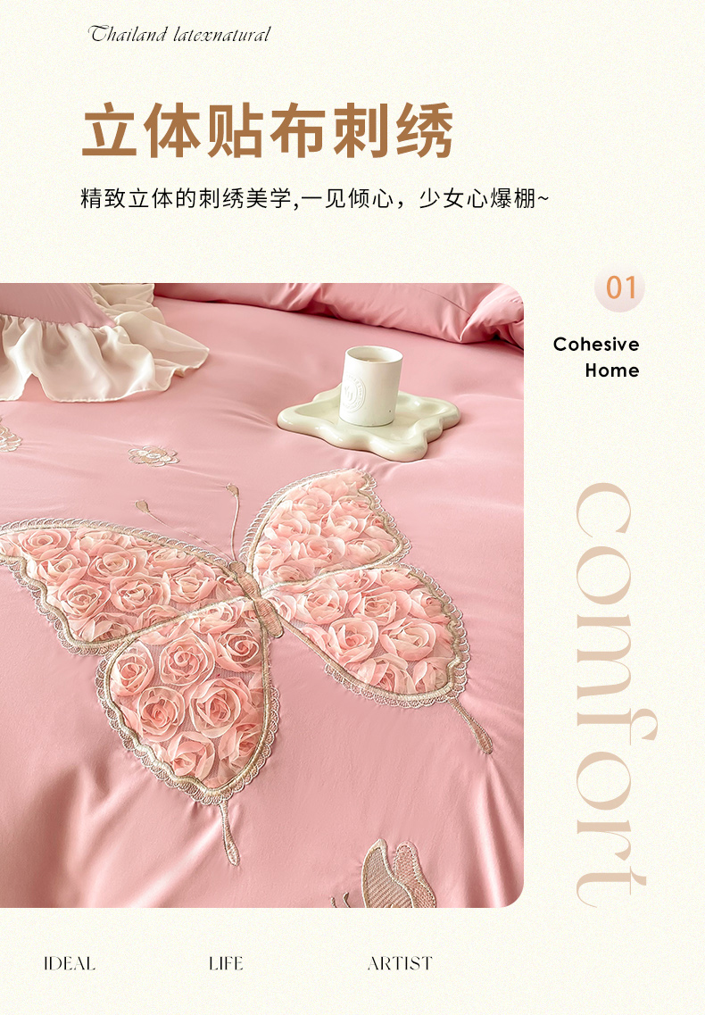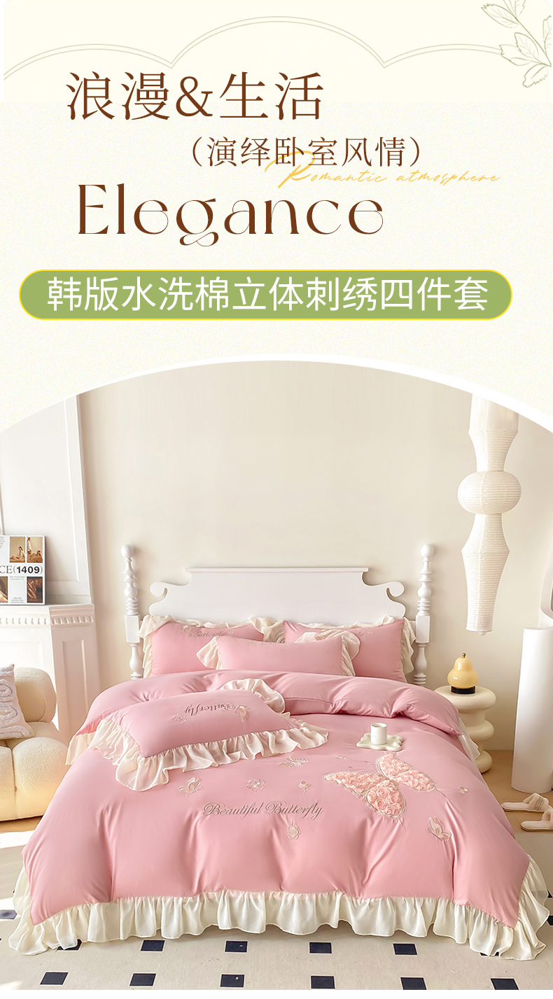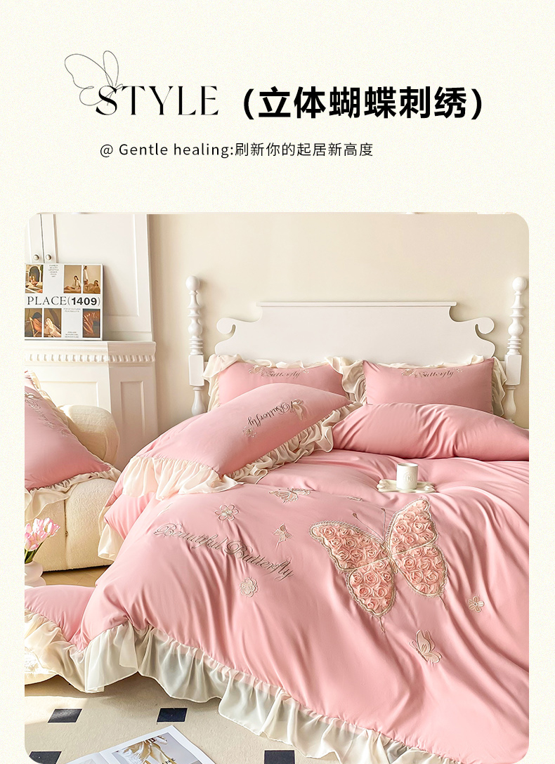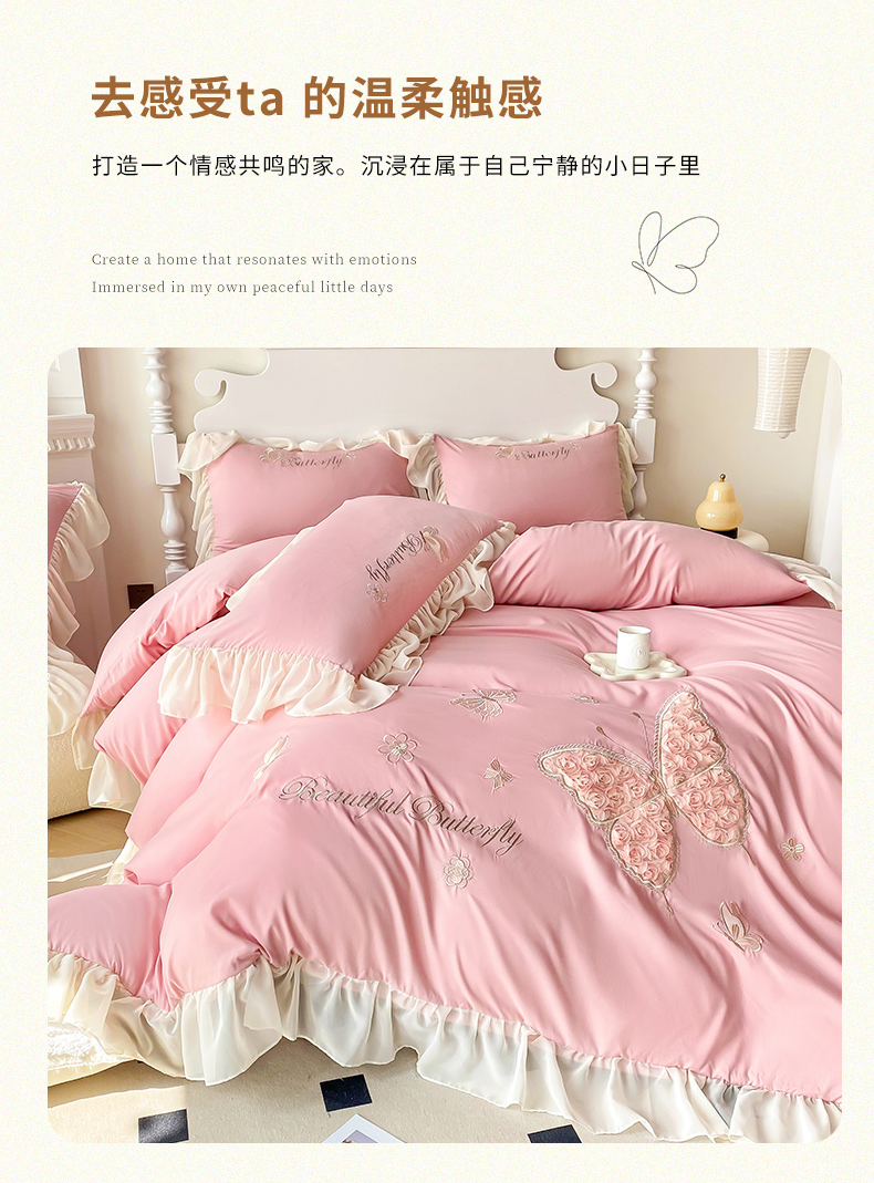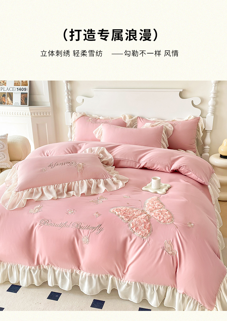 富盛 2024新款水洗亲肤棉立体刺绣四件套公主风四件套-蝴蝶系列 蝴蝶-豆沙