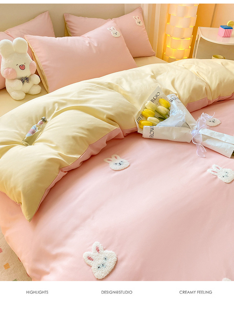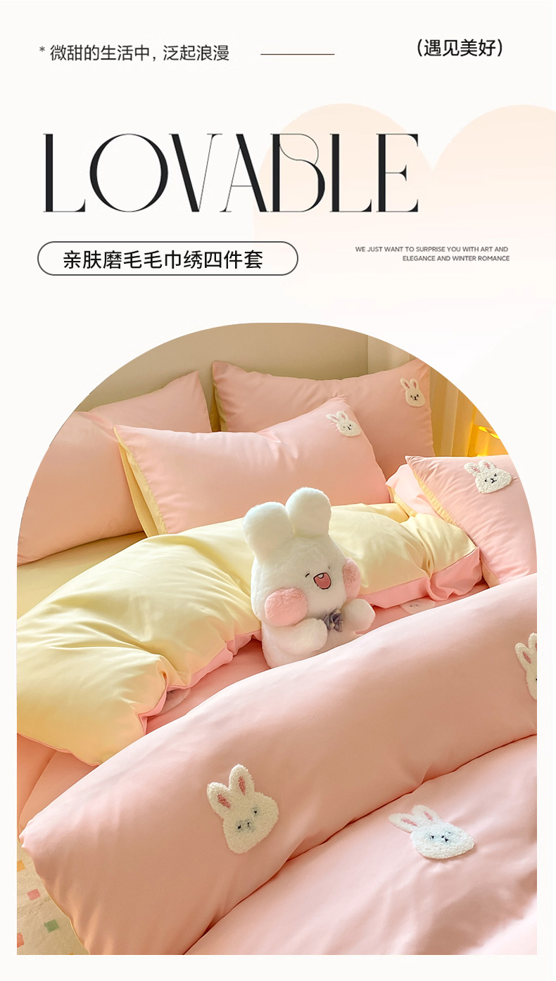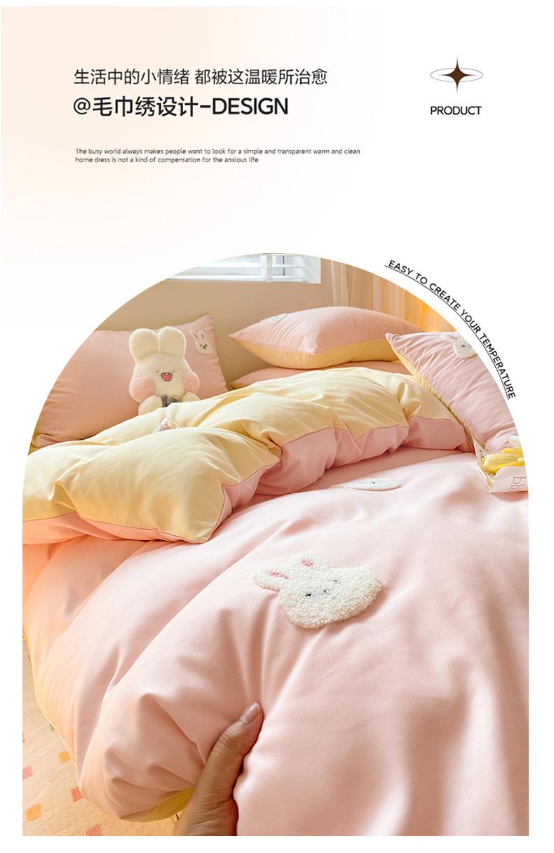 当前位置: 91家纺网 > 商品网购 > 床品套件 > 四件套 > 毛巾绣四件套 > 眠帛 2024新款亲肤棉卡通毛巾绣四件套 兔兔-奶油粉奶黄