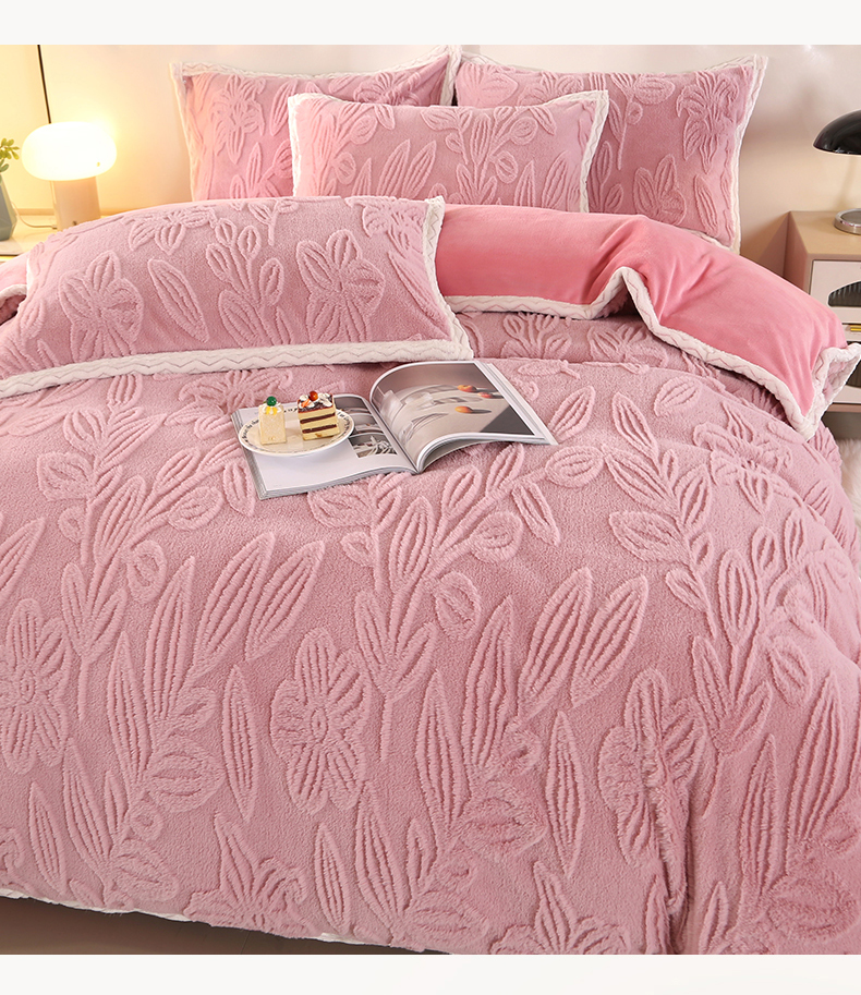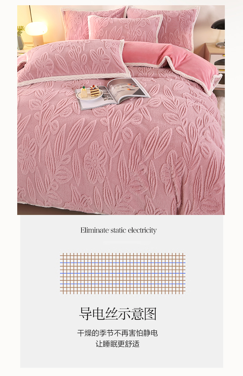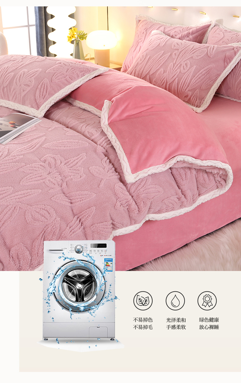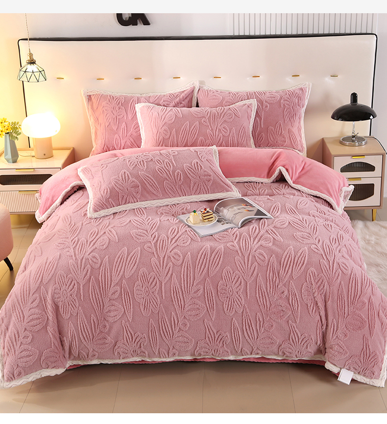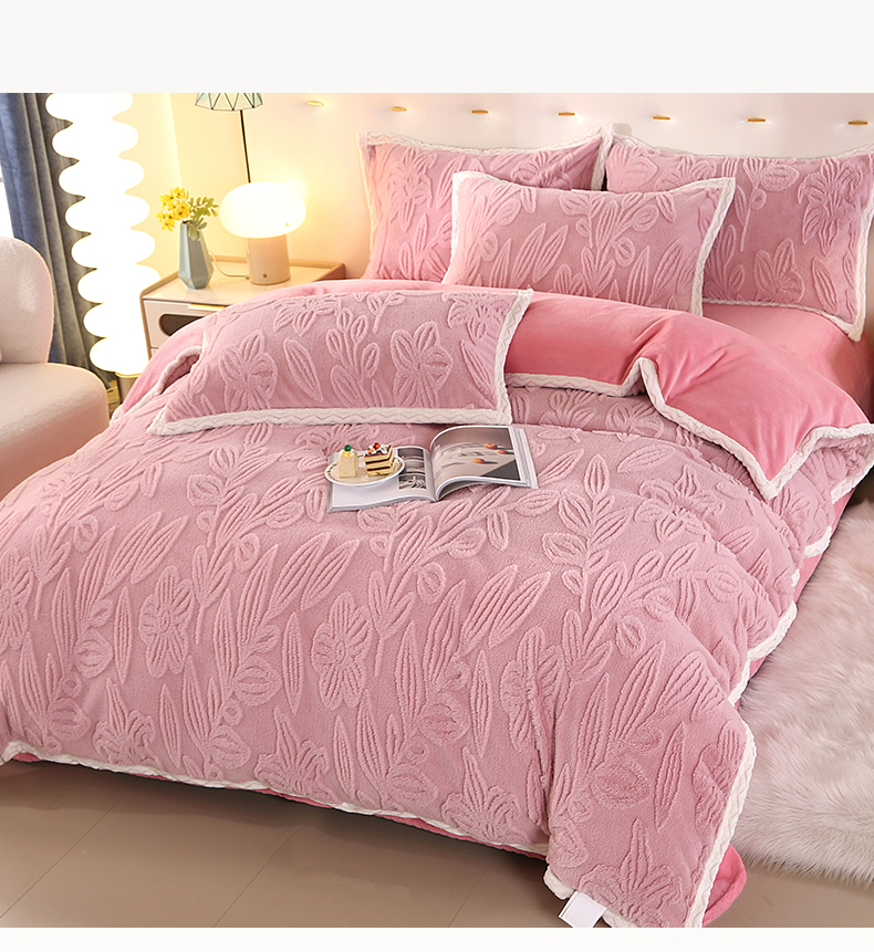芸锦豪2024新款花团雕花兔毛绒兔兔绒四件套 粉色