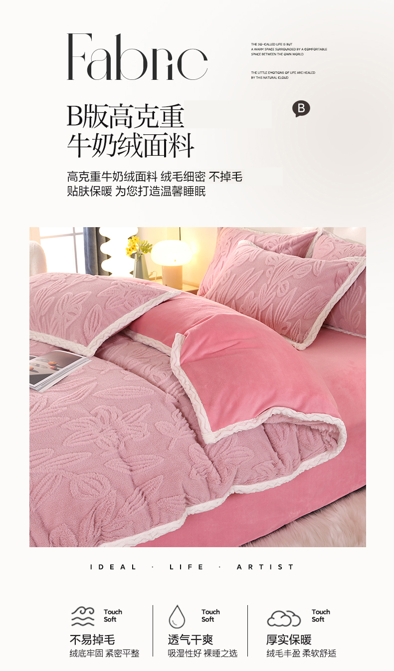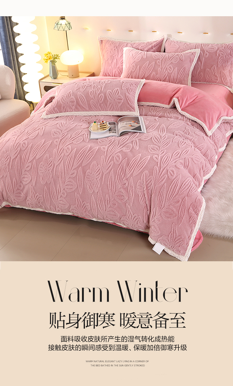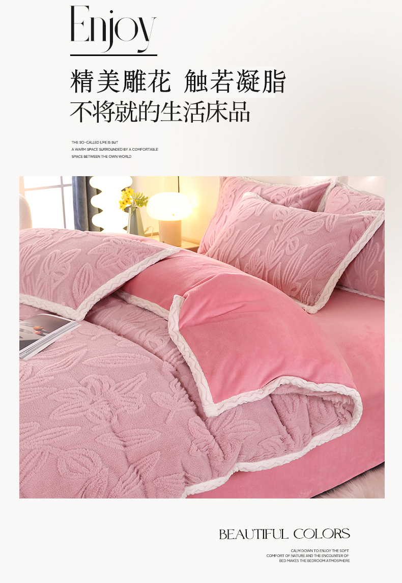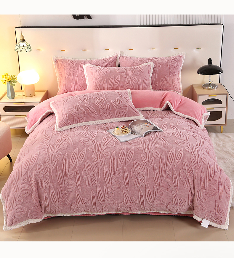 芸锦豪2024新款花团雕花兔毛绒兔兔绒四件套 粉色