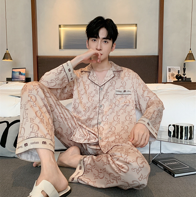 (总)洛兰沙 2024新款夏季高级感轻奢香槟色男士睡衣V字领长裤长袖轻薄家居服可外穿