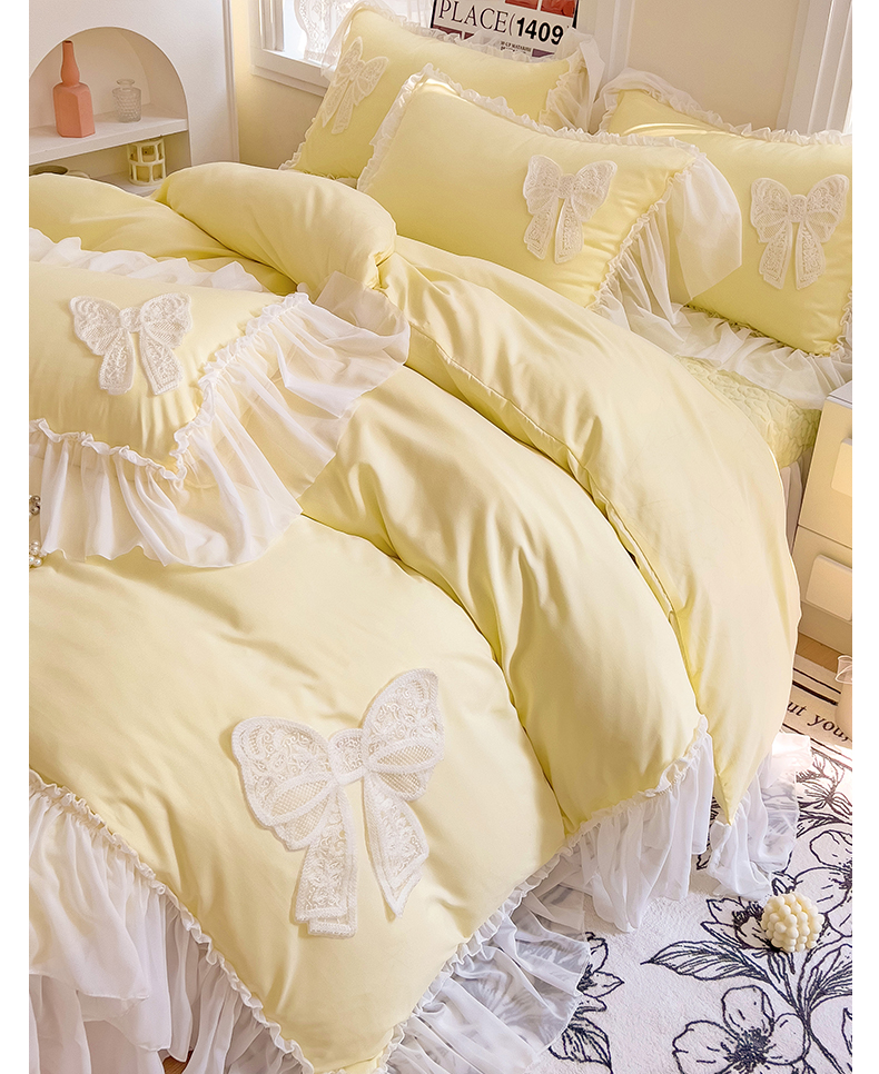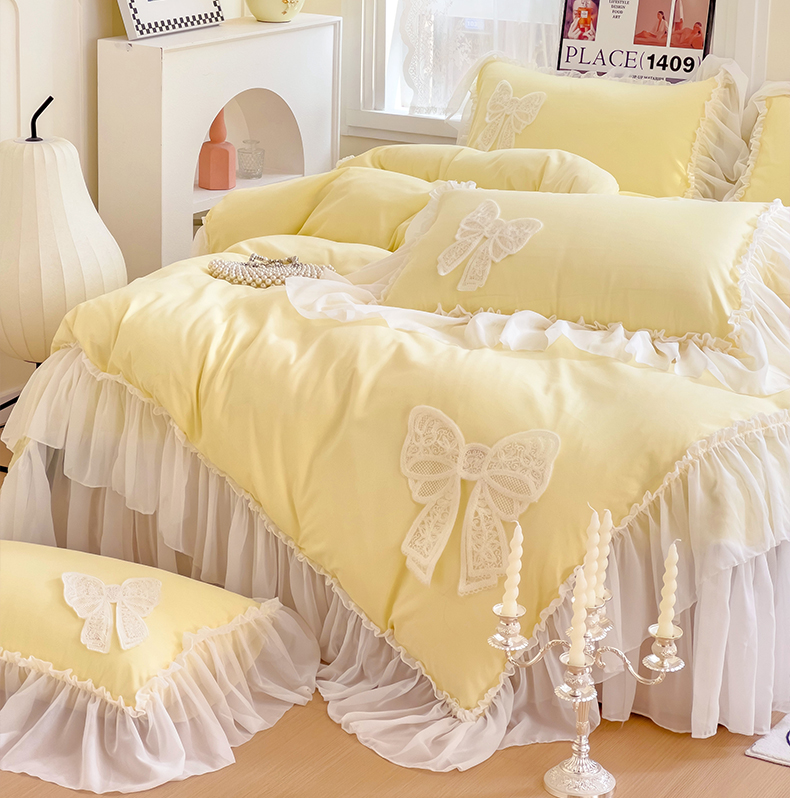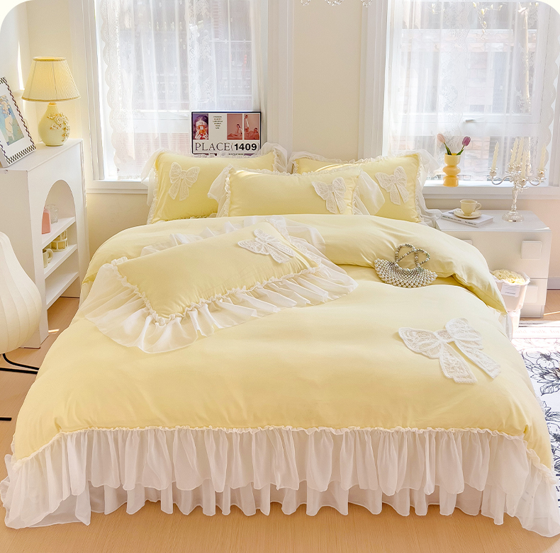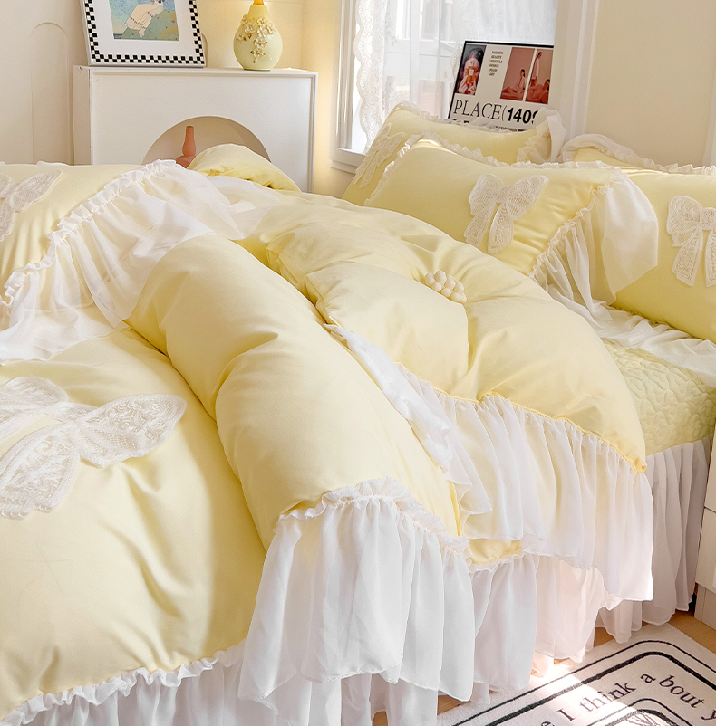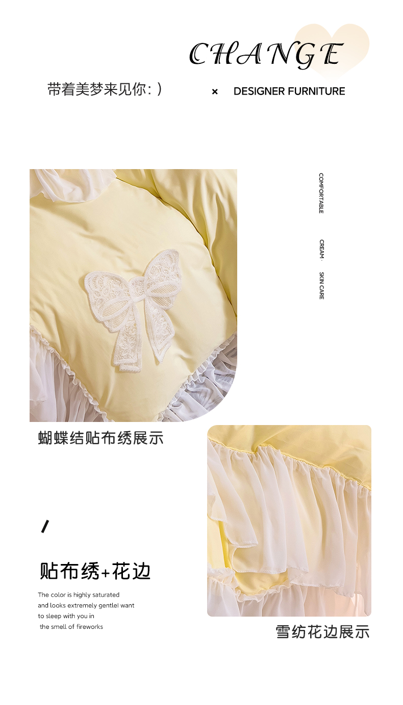当前位置: 91家纺网 > 商品网购 > 床品套件 > 四件套 > 其它四件套 > 言熙居家纺 2024新款韩版贴布绣雪纺花边床盖款四件套-初恋 初恋-黄