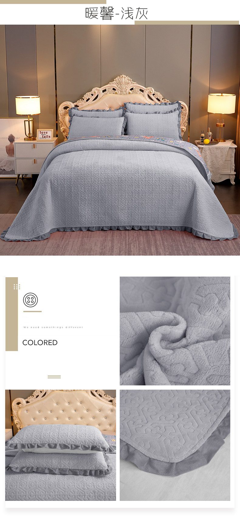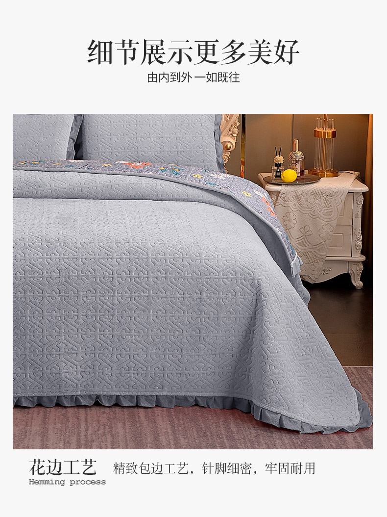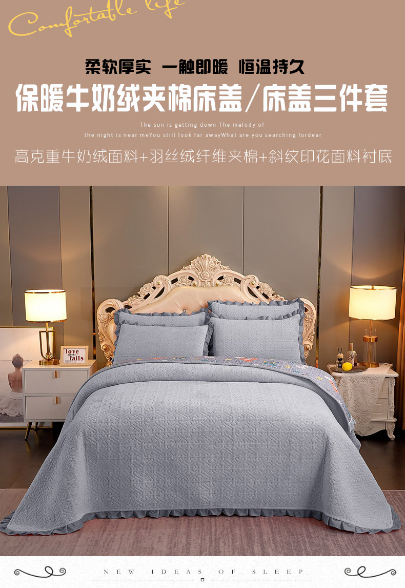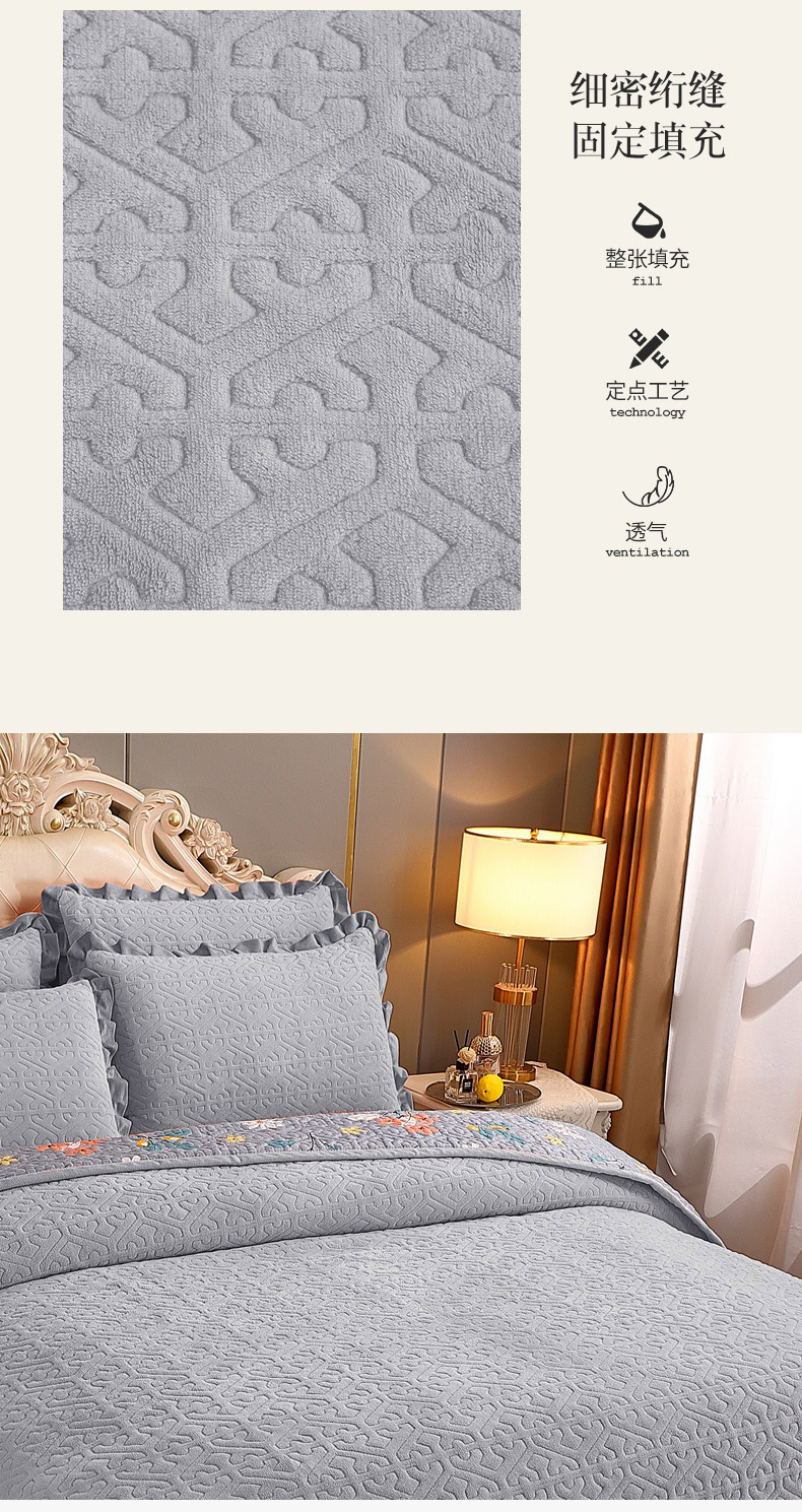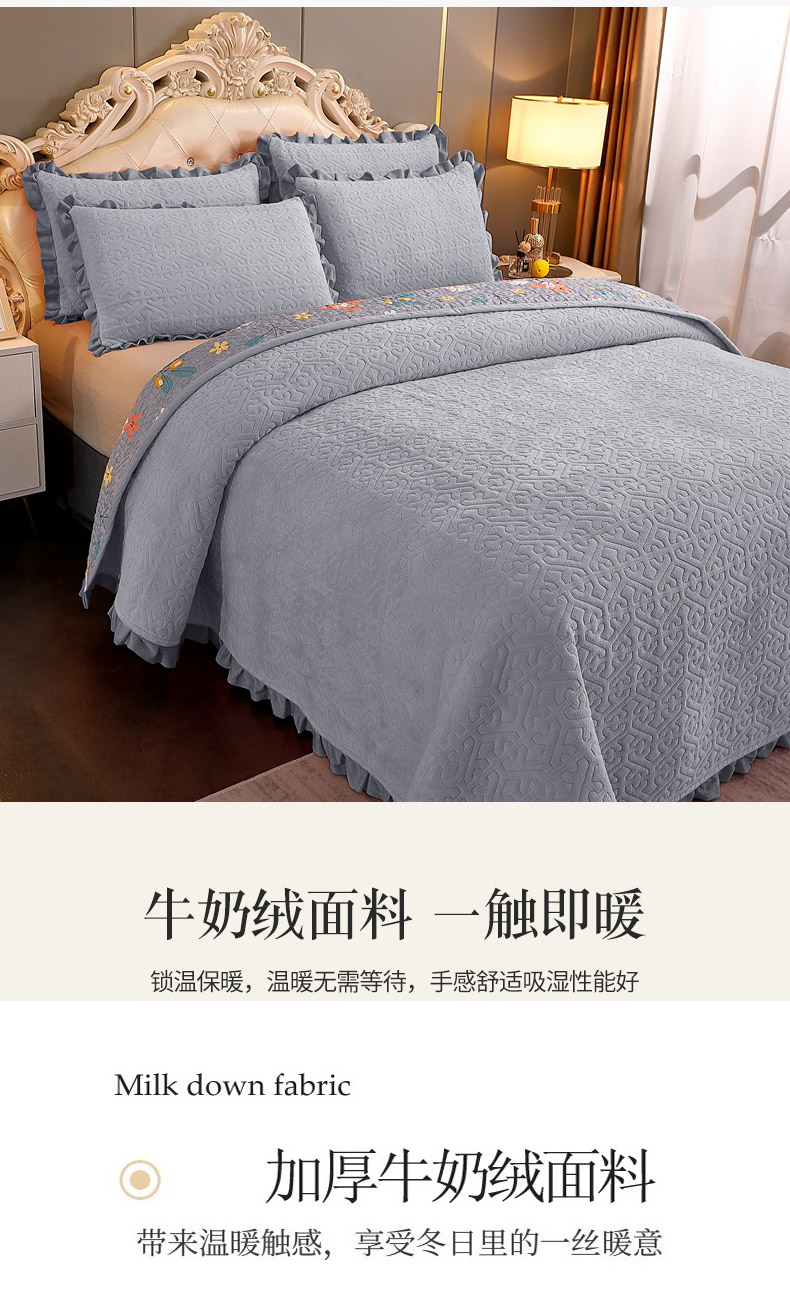 当前位置: 91家纺网 > 商品网购 > 床品套件 > 四件套 > 其它四件套 > 晶缦家纺 2024新款纯色小花边牛奶绒床盖三件套 暖馨-浅灰