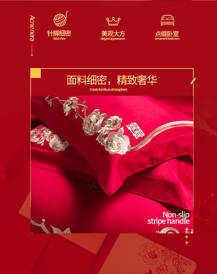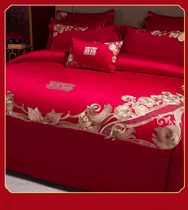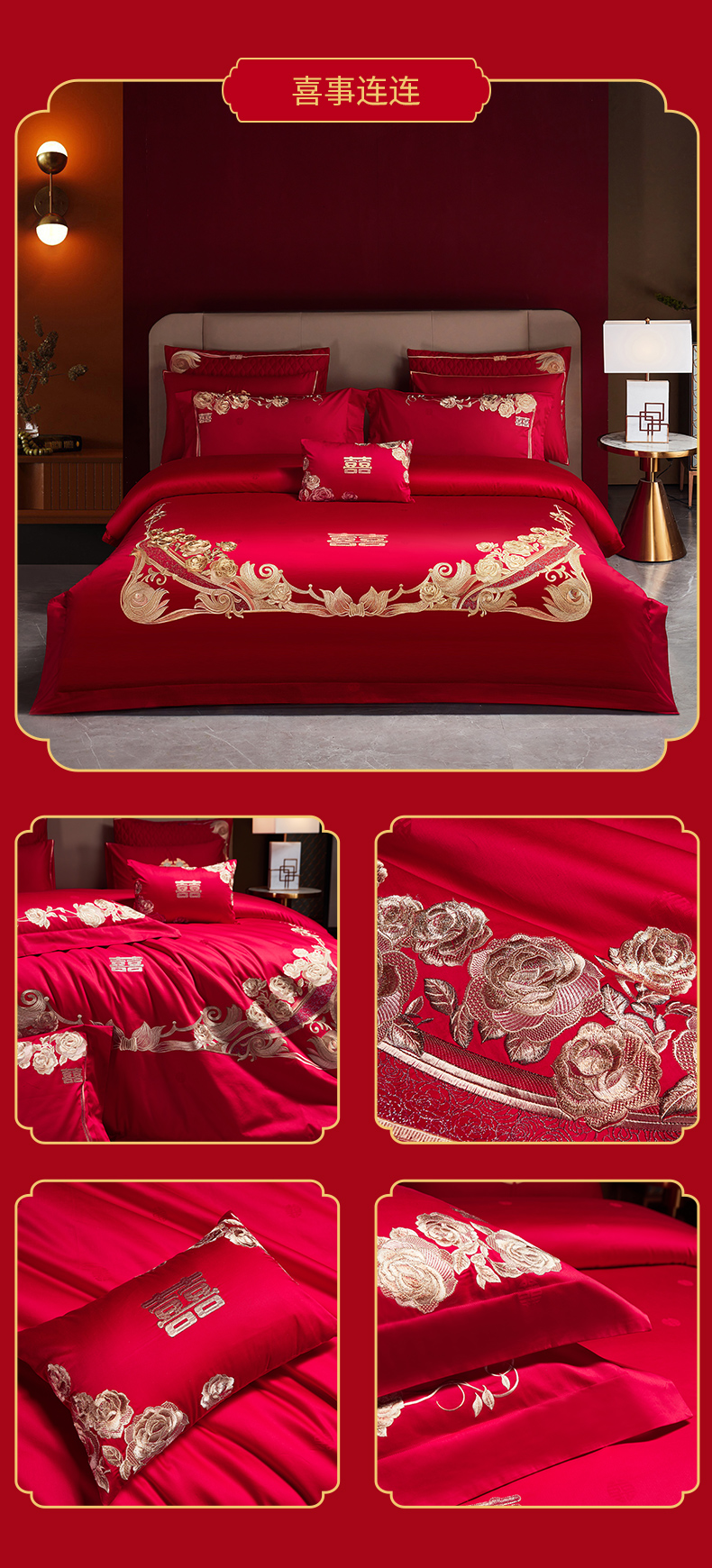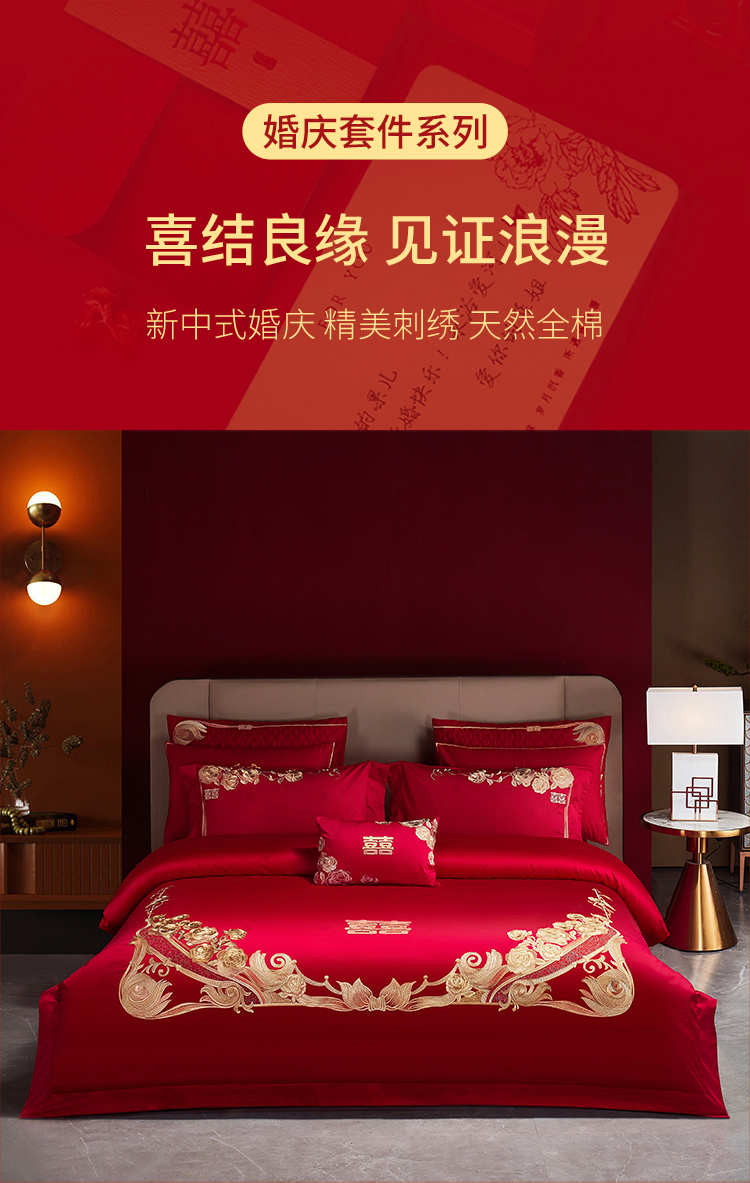 当前位置: 91家纺网 > 商品网购 > 床品套件 > 四件套 > 婚庆四件套 > 美娘阁 2025新款长绒棉贡缎提花款新中式古典韵味精美刺绣婚庆四件套多件套 喜事连连
