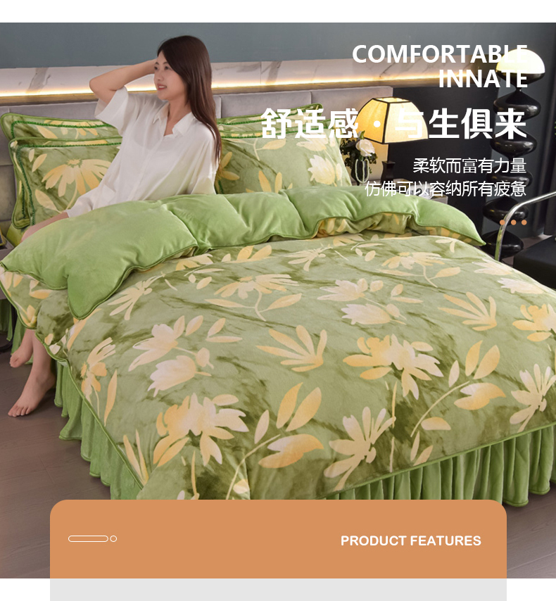 商品名称:锦铭源2025直播印花7斤牛奶绒金貂水晶法莱珊瑚绒四件套床裙款 清雅