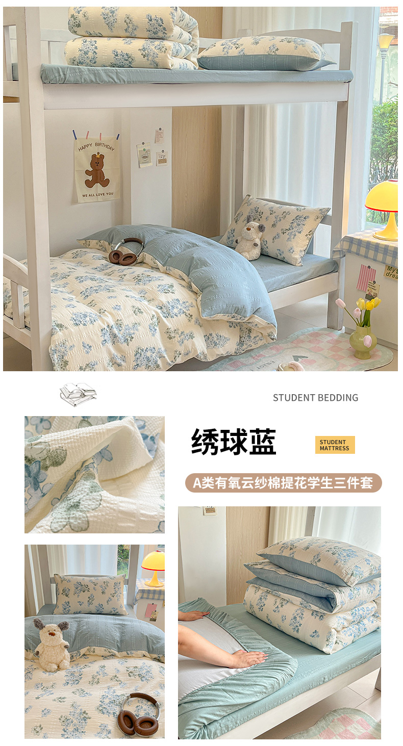 当前位置: 91家纺网 > 商品网购 > 床品套件 > 四件套 > 其它四件套 > 安哆啦家纺 2024新款A类有氧泡泡纱云纱棉学生季宿舍床三四件套 绣球蓝