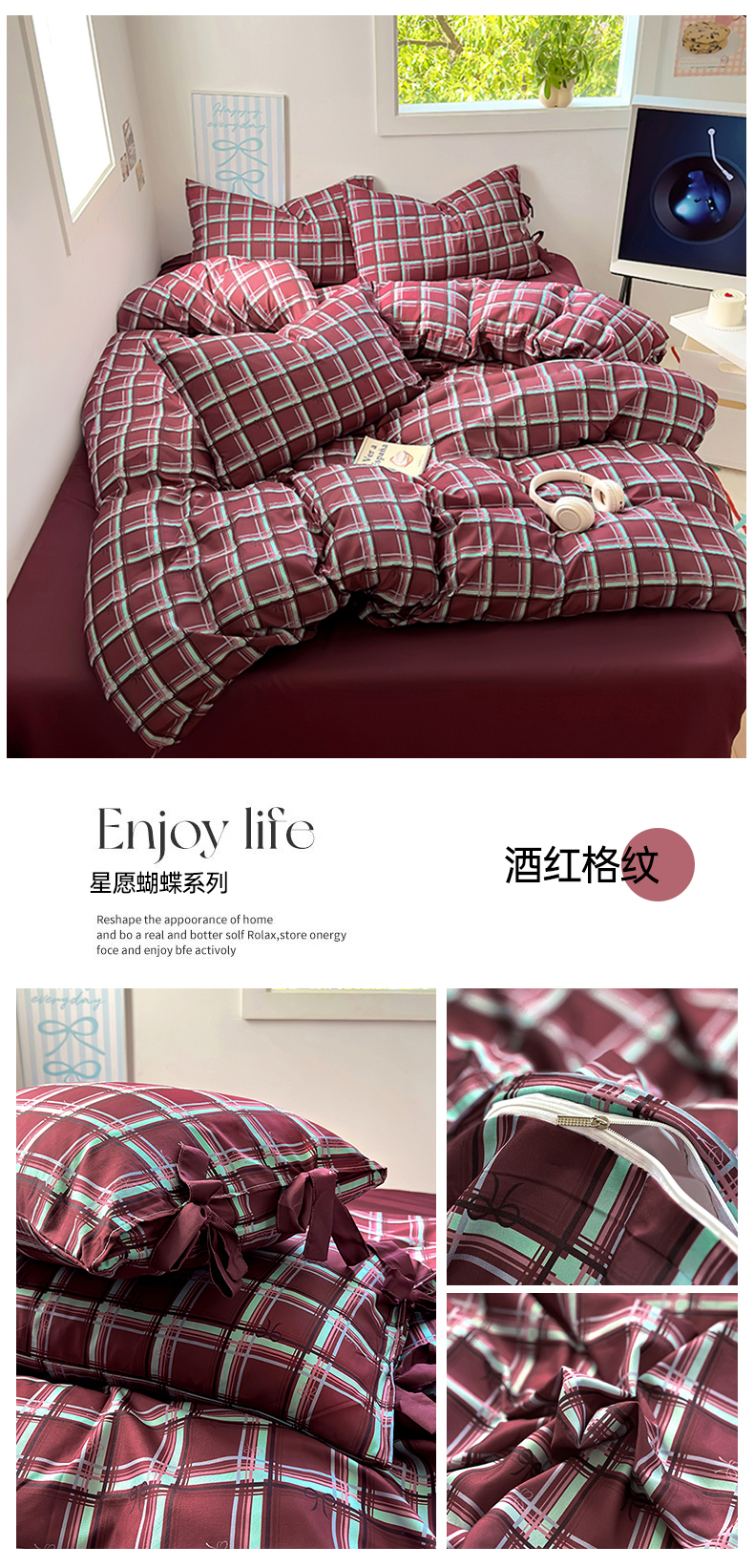 商品名称:春光里 2024新款亲肤棉磨毛印花星愿蝴蝶系列四件套 星愿蝴蝶-酒红格纹