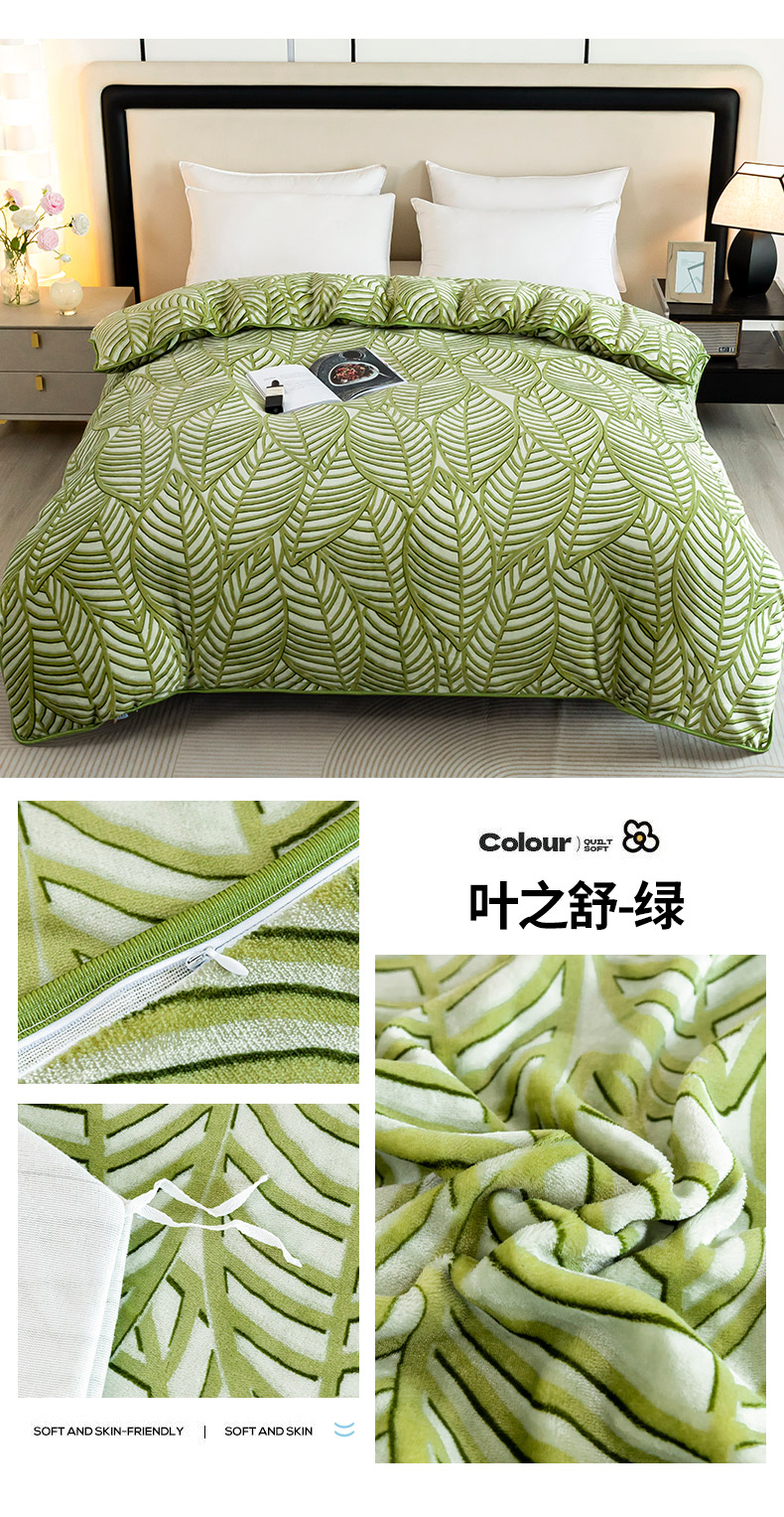 商品名称:博兰蒂 2025秋冬新款高克重牛奶绒印花单被套 叶之舒-绿
