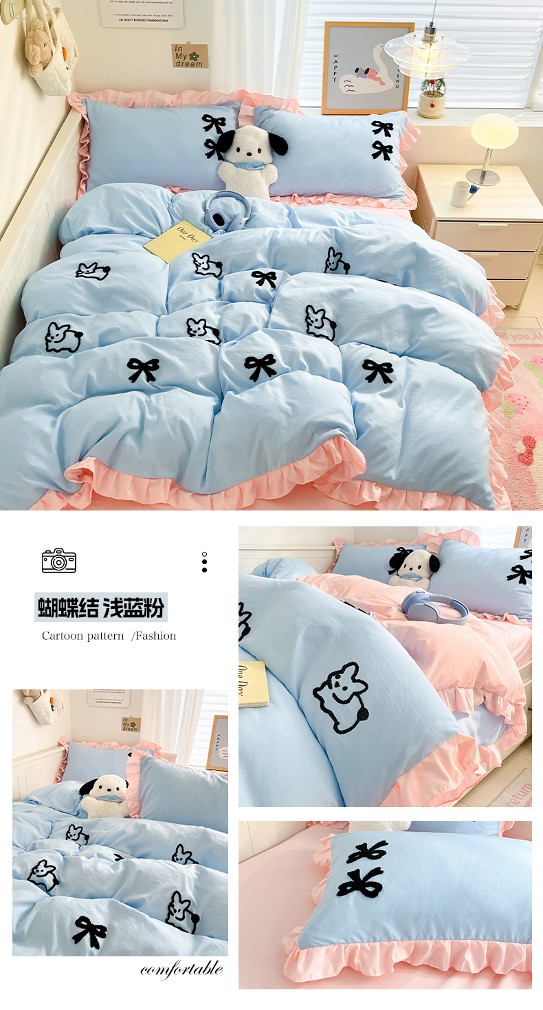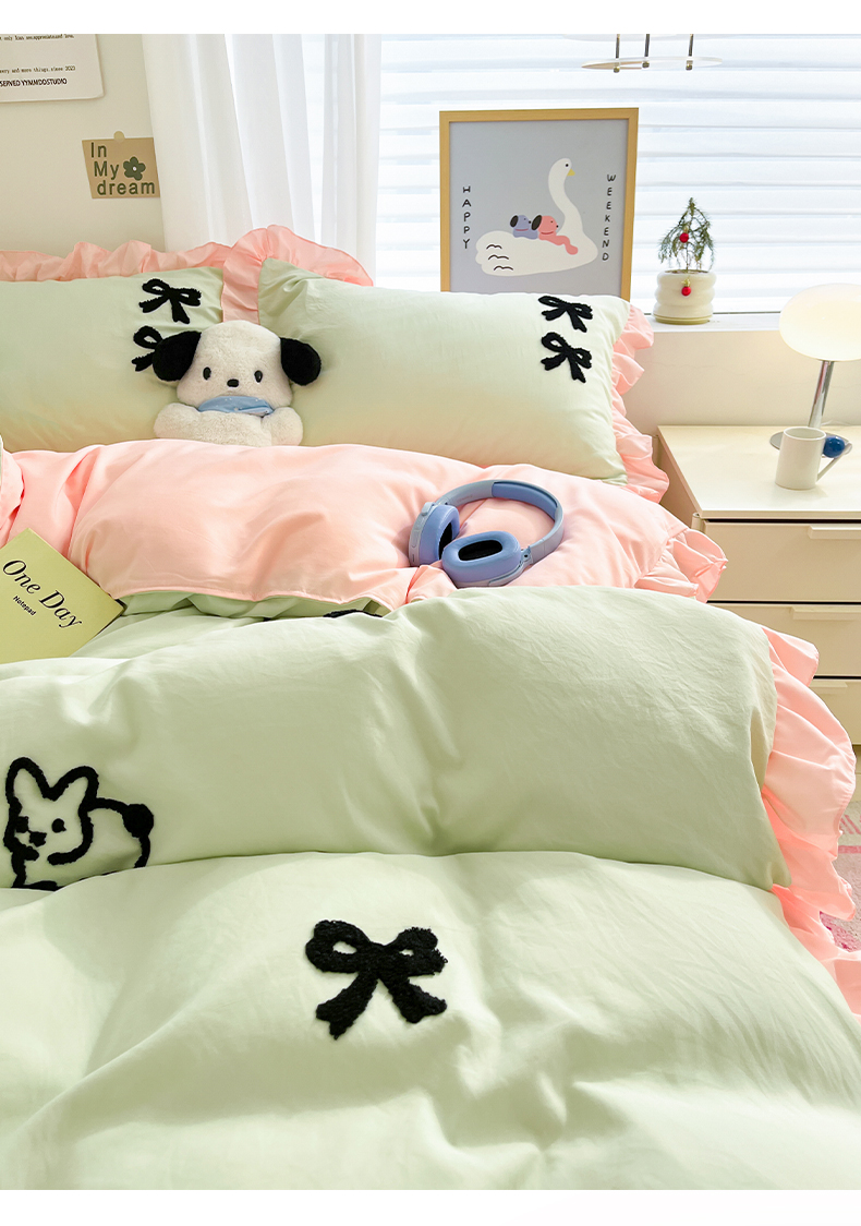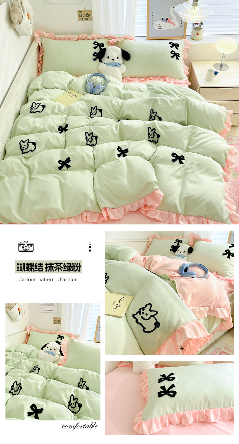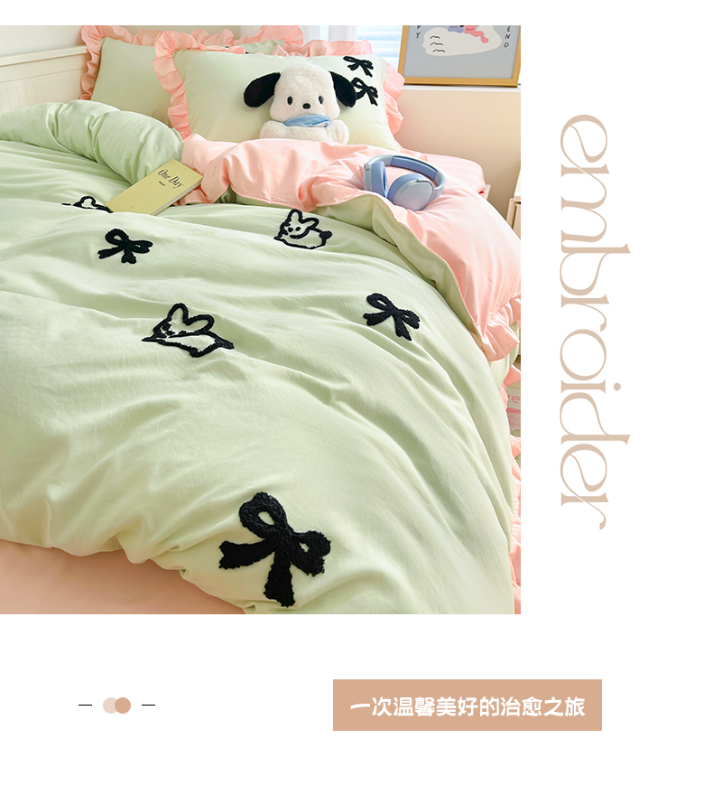 (总)泉欣家纺 2024韩式公主风毛巾绣花水洗棉四件套专版花型,蝴蝶结-粉玉,蝴蝶结-抹茶绿粉,蝴蝶结-浅黄灰,蝴蝶结-浅蓝粉
