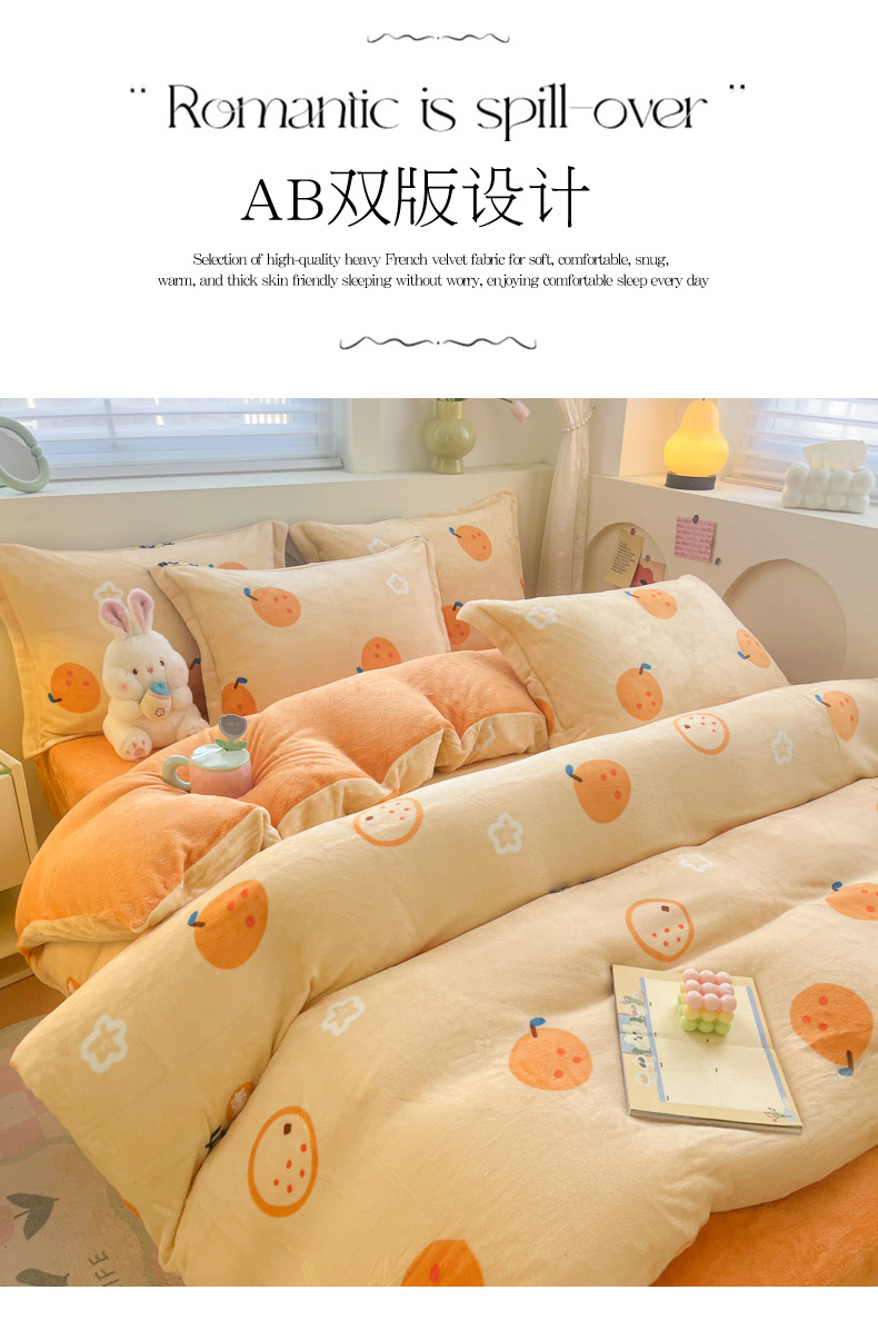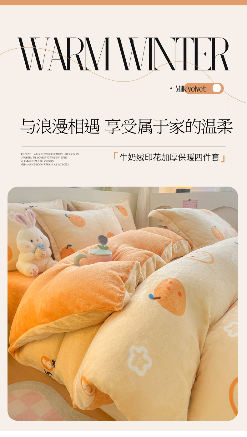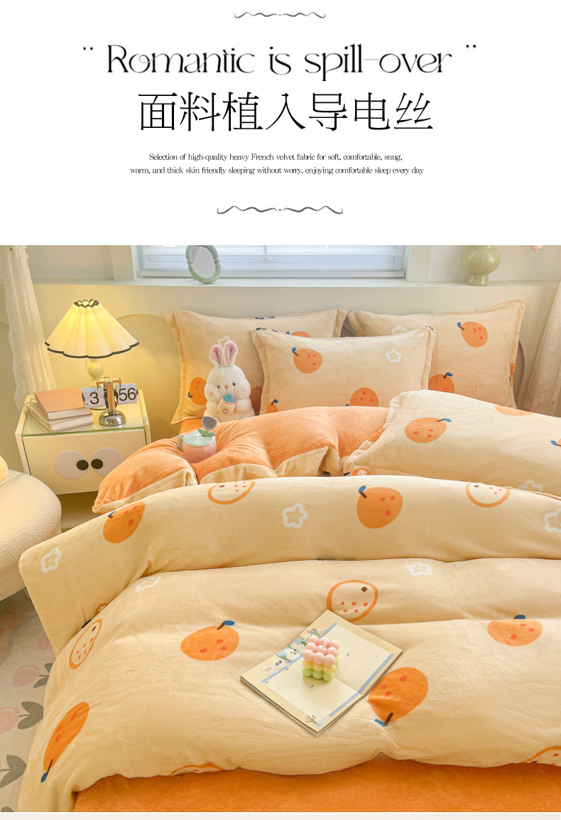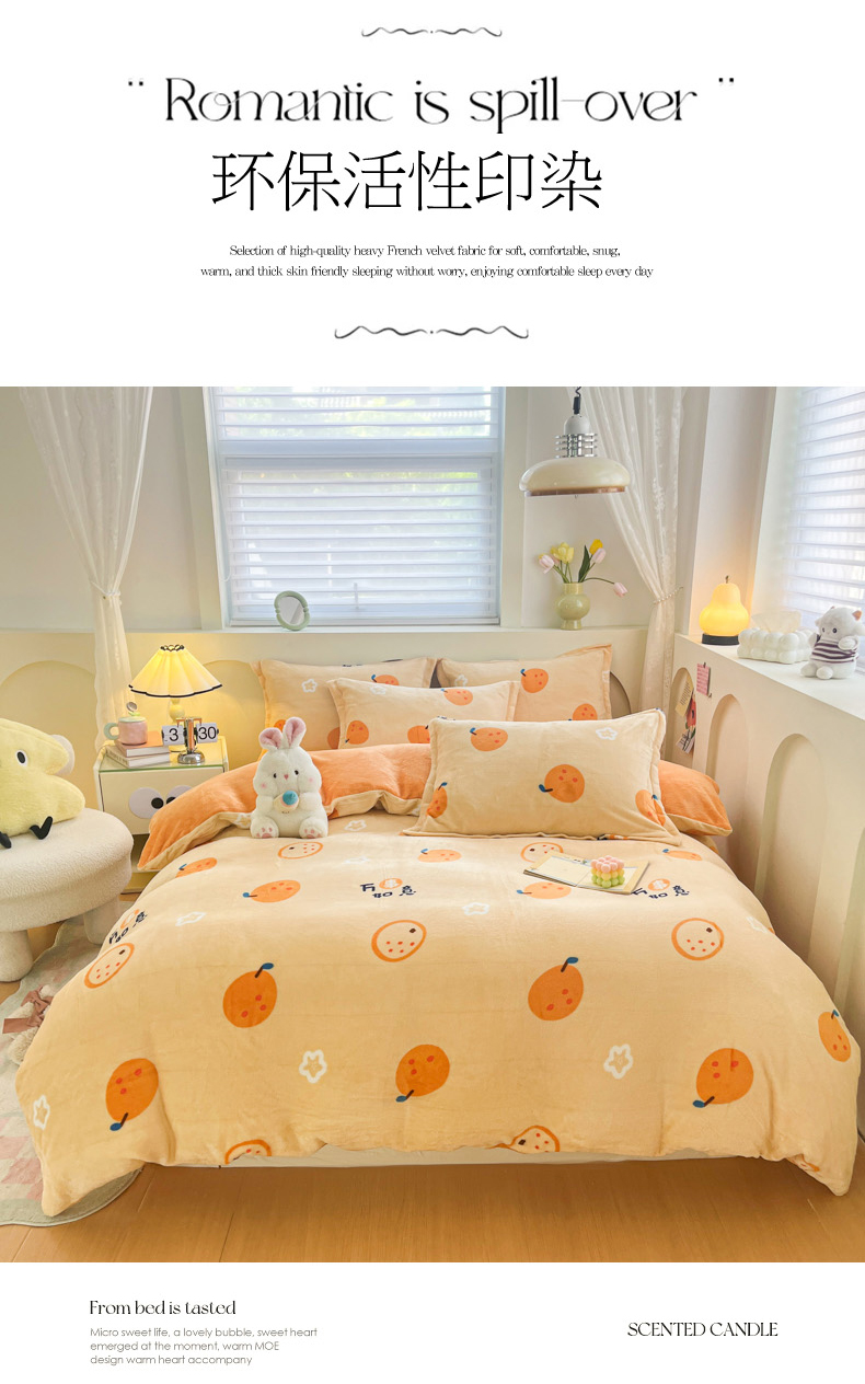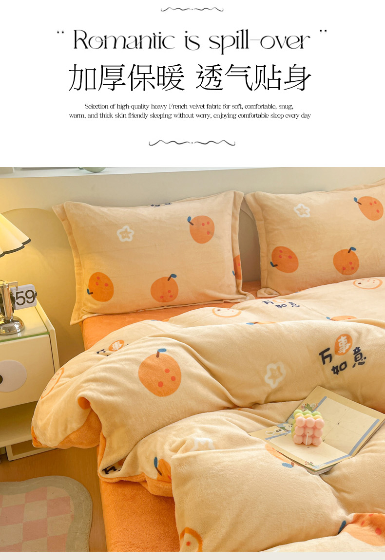 当前位置: 91家纺网 > 商品网购 > 床品套件 > 四件套 > 牛奶绒四件套 > 2024新款小清新牛奶绒高克重加厚保暖四件套 小橘子