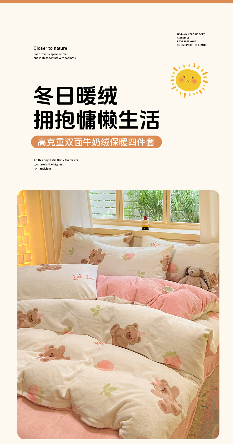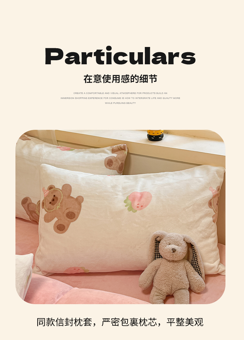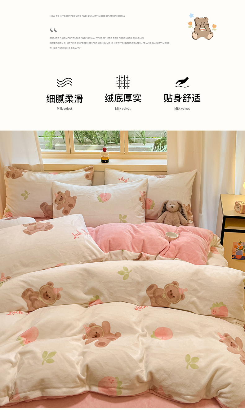 铭宣家居 2024新款7斤小清新高克重牛奶绒印花四件套床单床笠款 草莓熊