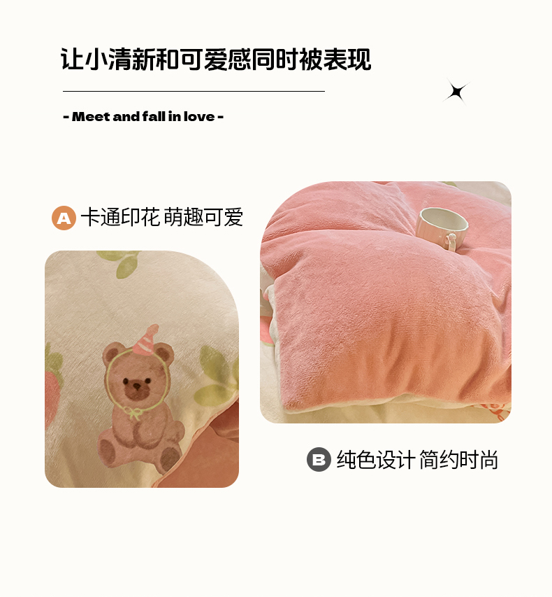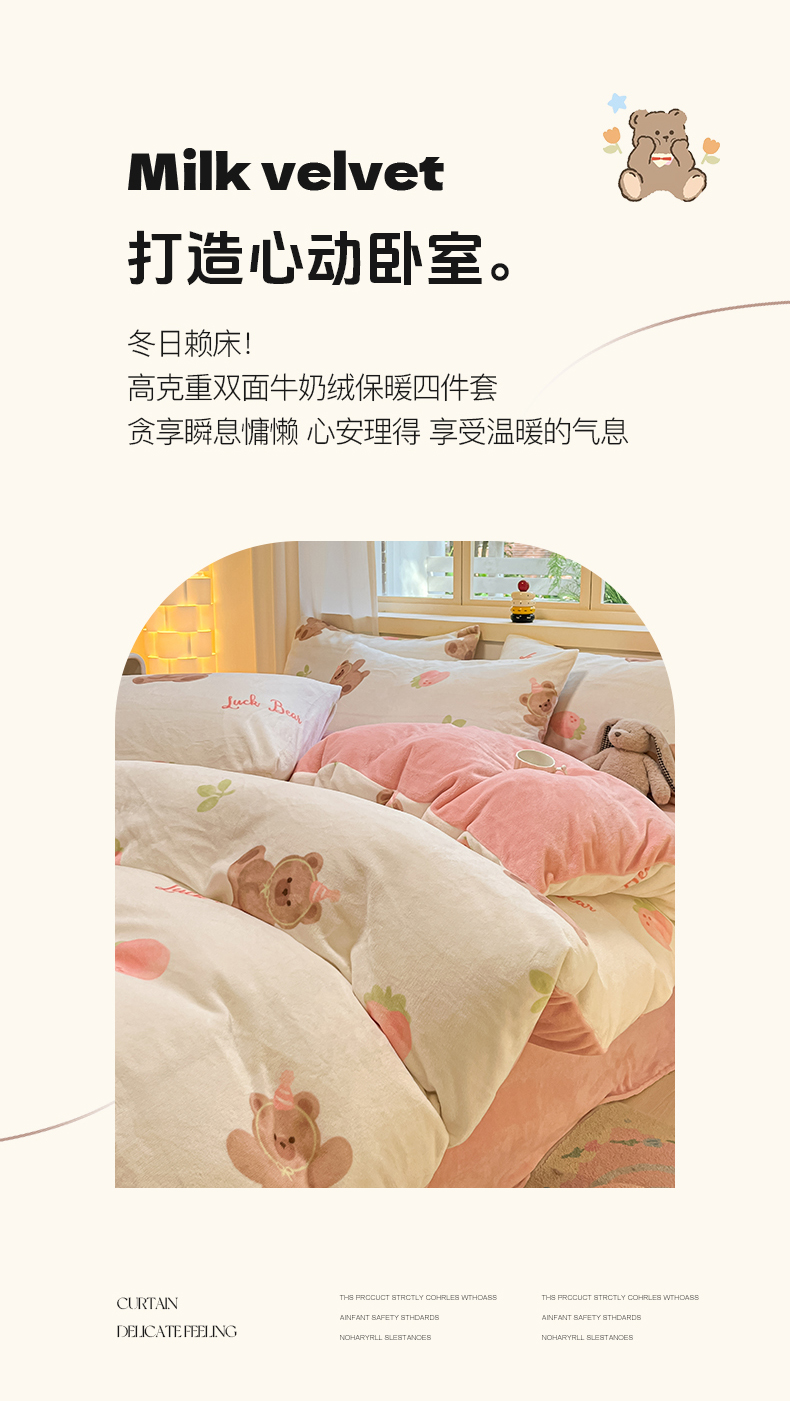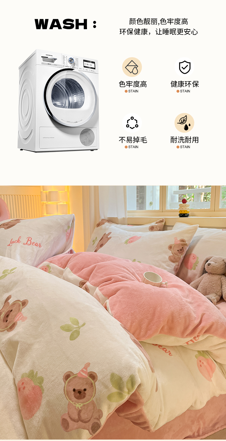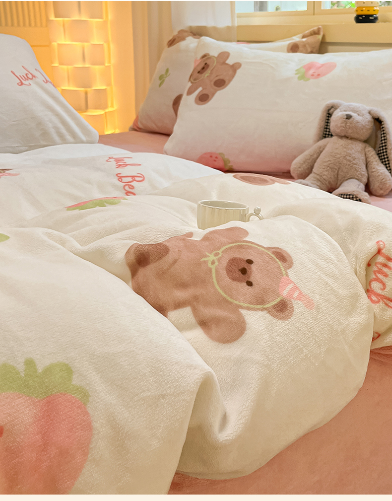 商品名称:铭宣家居 2024新款7斤小清新高克重牛奶绒印花四件套床单床笠款 草莓熊