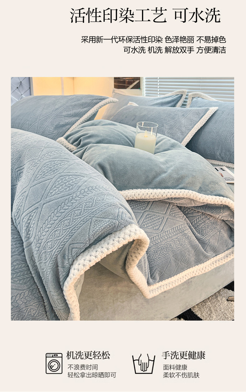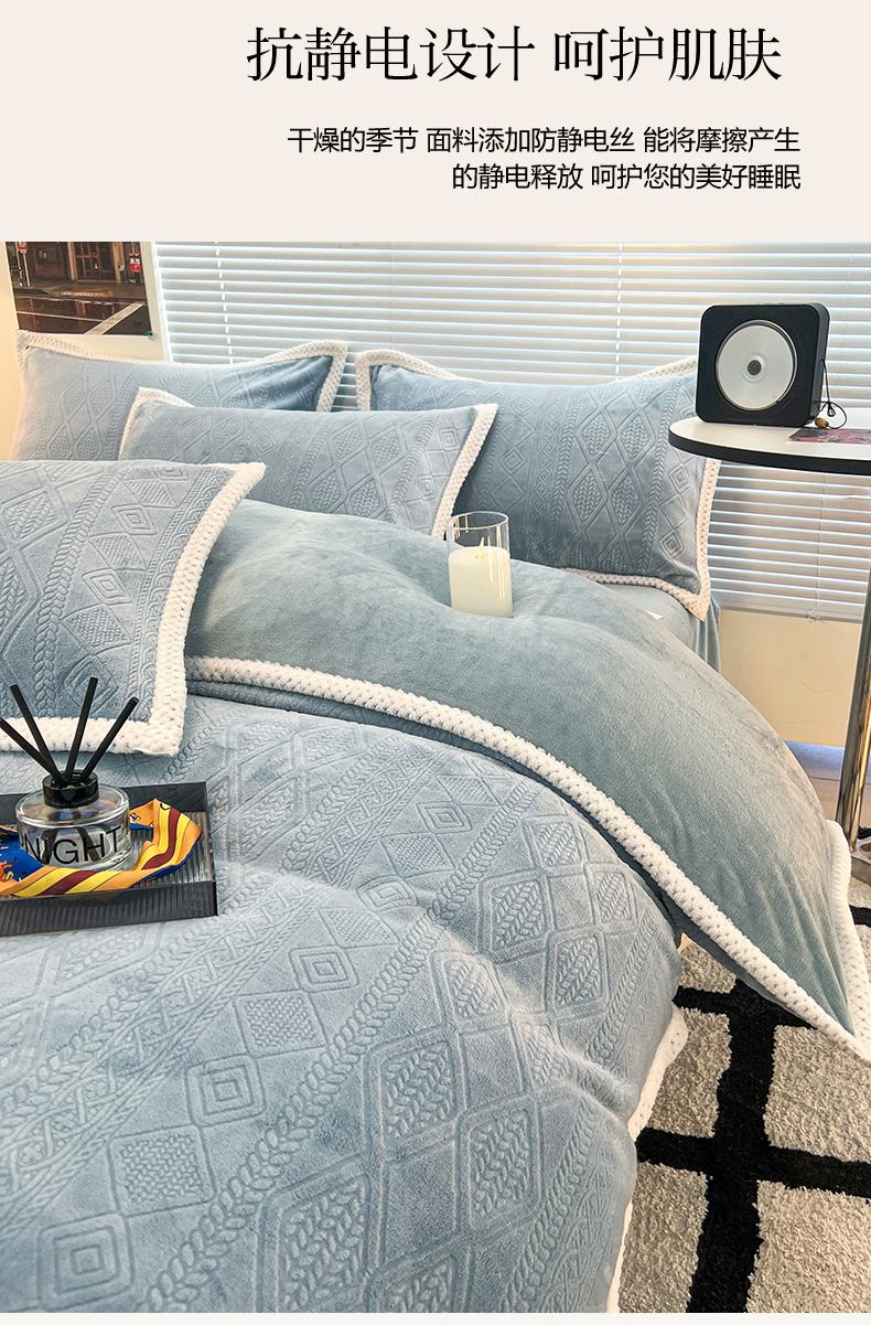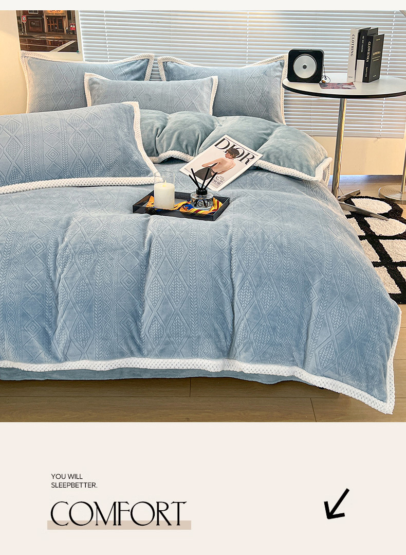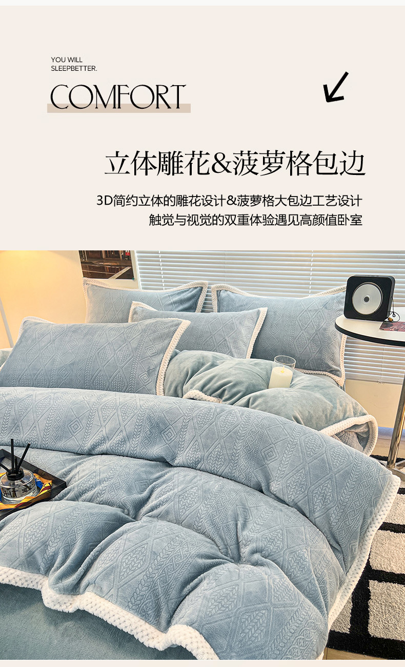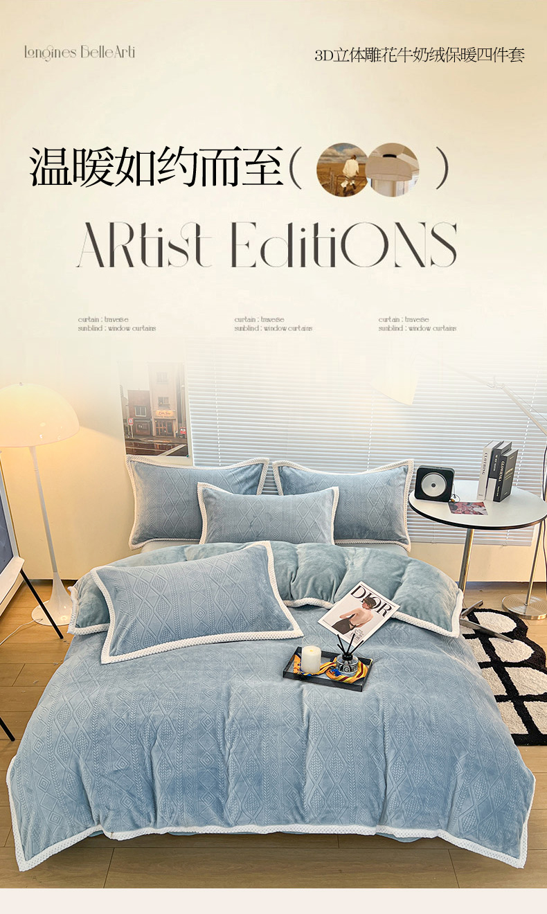 当前位置: 91家纺网 > 商品网购 > 床品套件 > 四件套 > 牛奶绒四件套 > 2024新款A类高克重3D立体雕花牛奶绒保暖系列套件单品-四件套 新暖意冰雪蓝