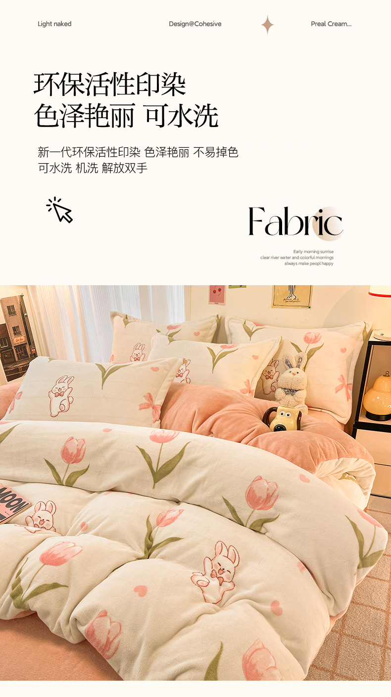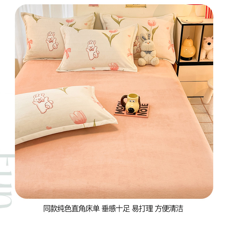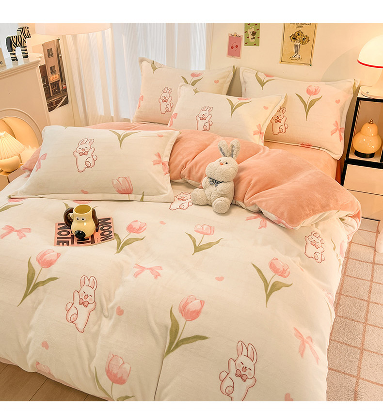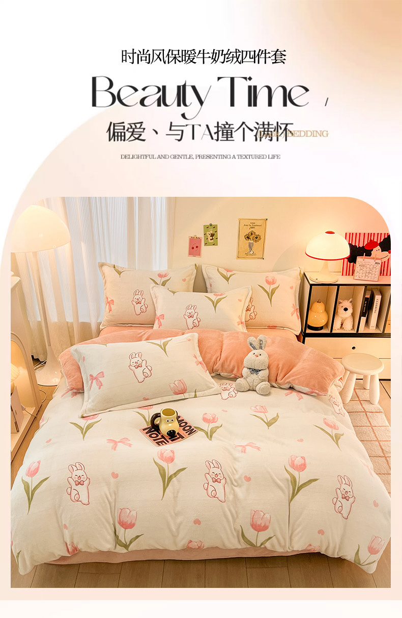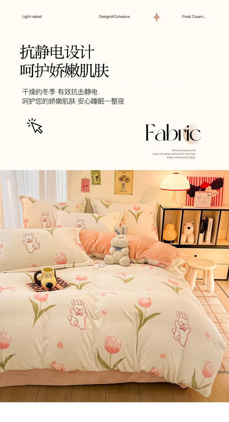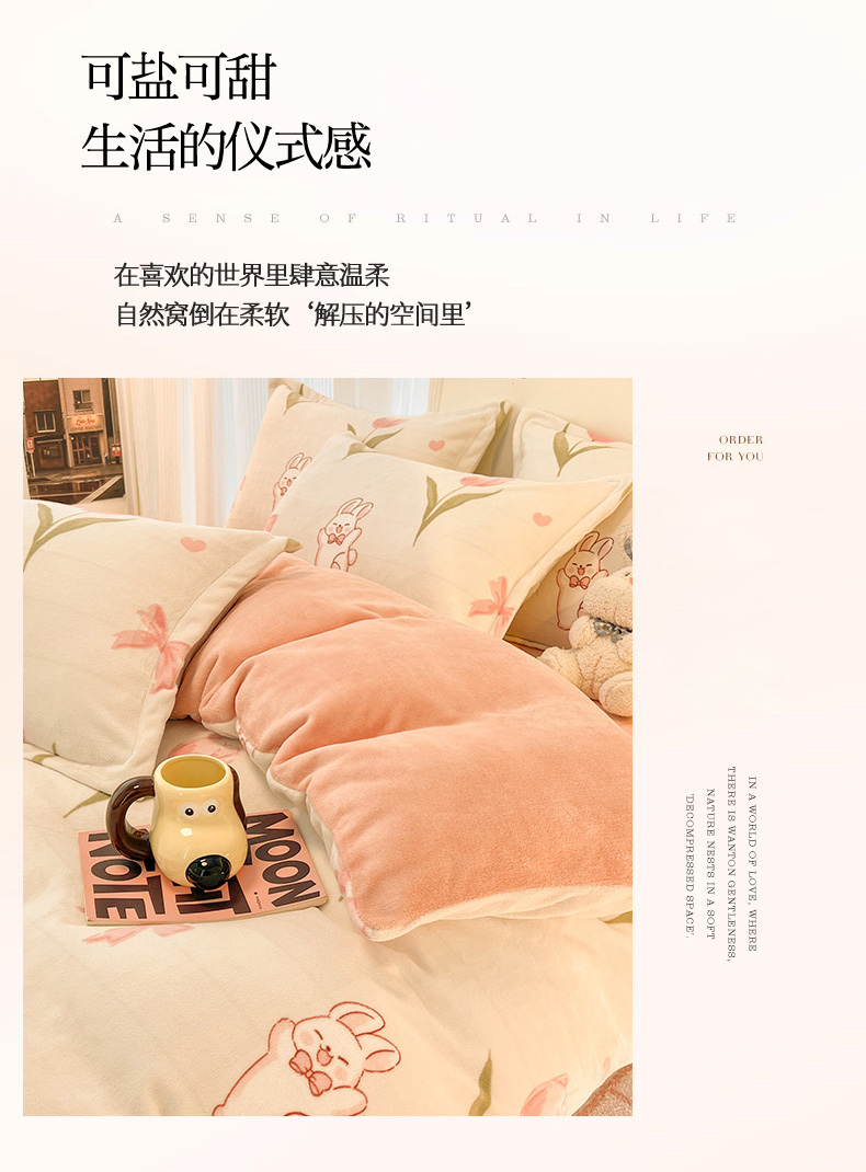 当前位置: 91家纺网 > 商品网购 > 床品套件 > 四件套 > 牛奶绒四件套 > 2024新款A类高克重时尚风牛奶绒加厚保暖系列套件单品-四件套 花花小兔粉