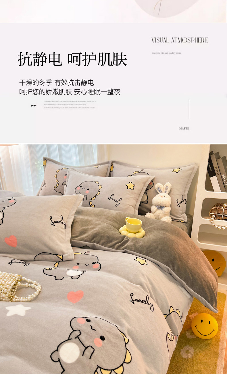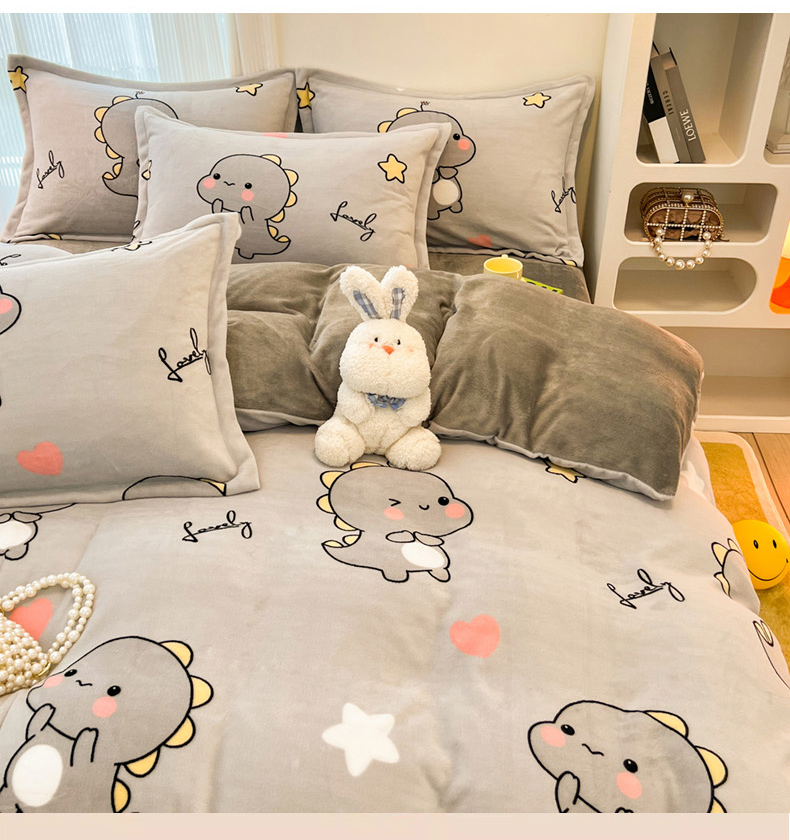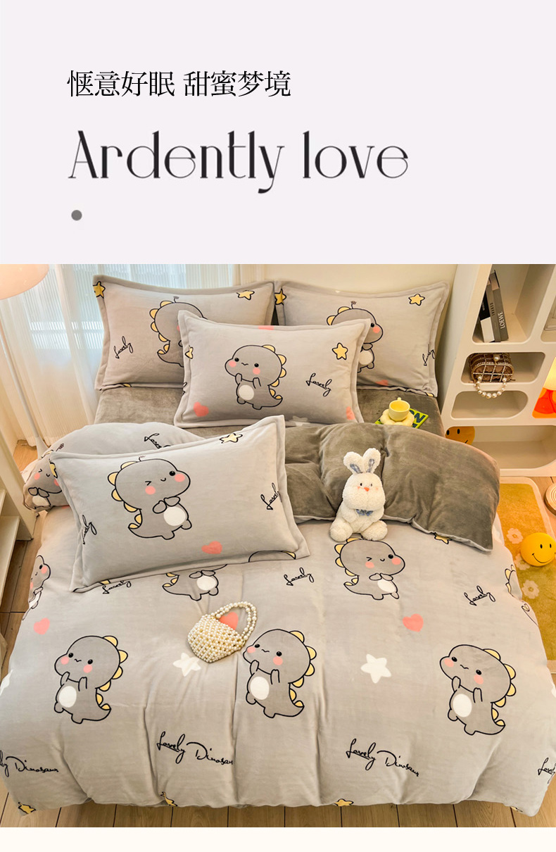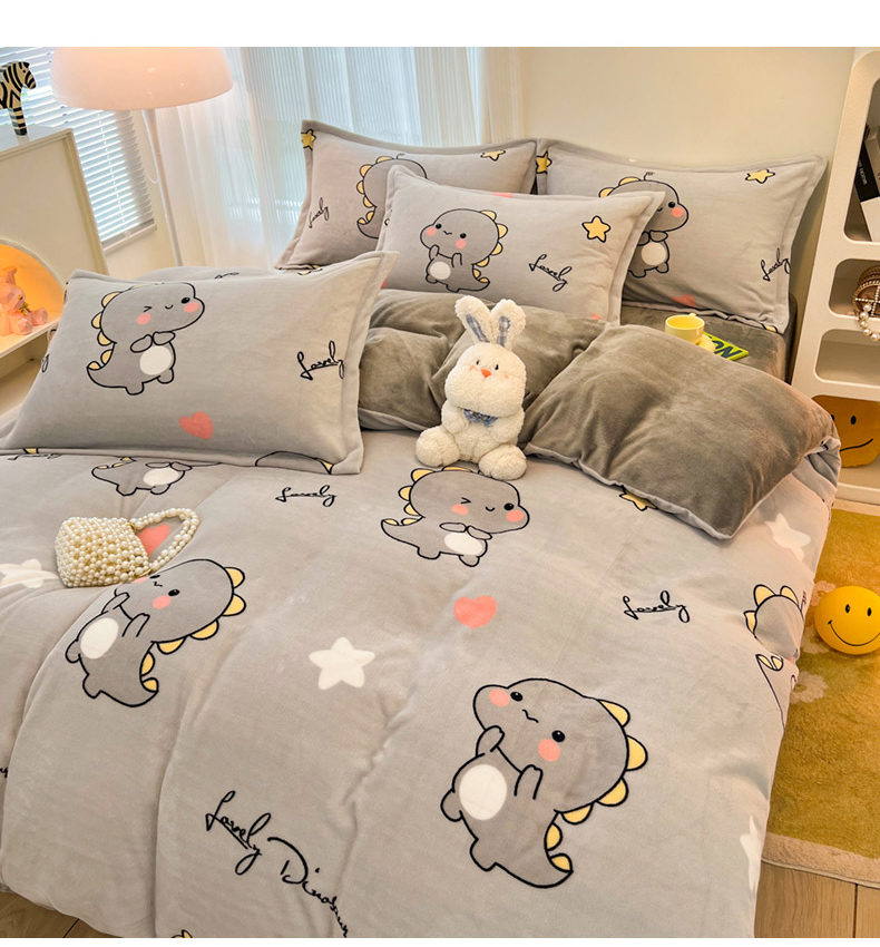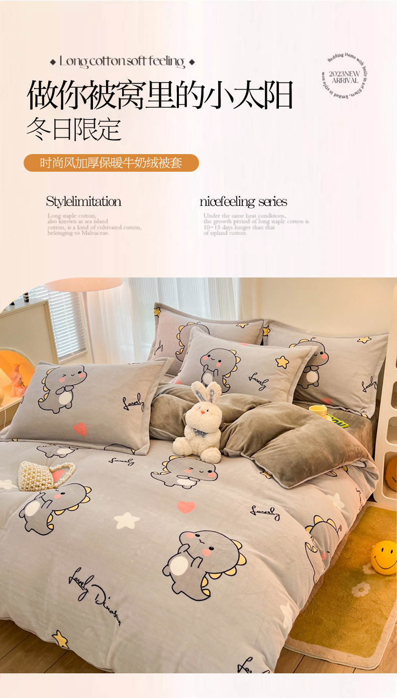 商品名称:2024新款A类高克重时尚风牛奶绒加厚保暖系列套件单品-被套 亲亲恐龙