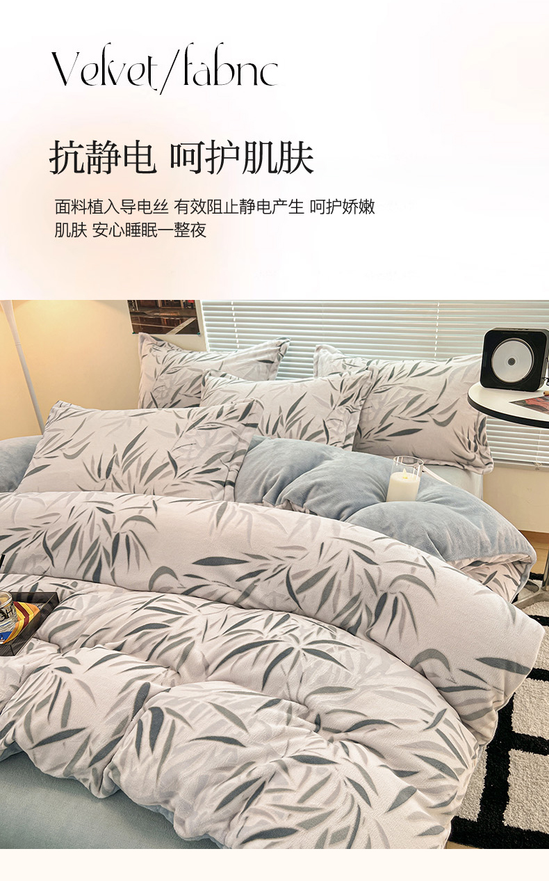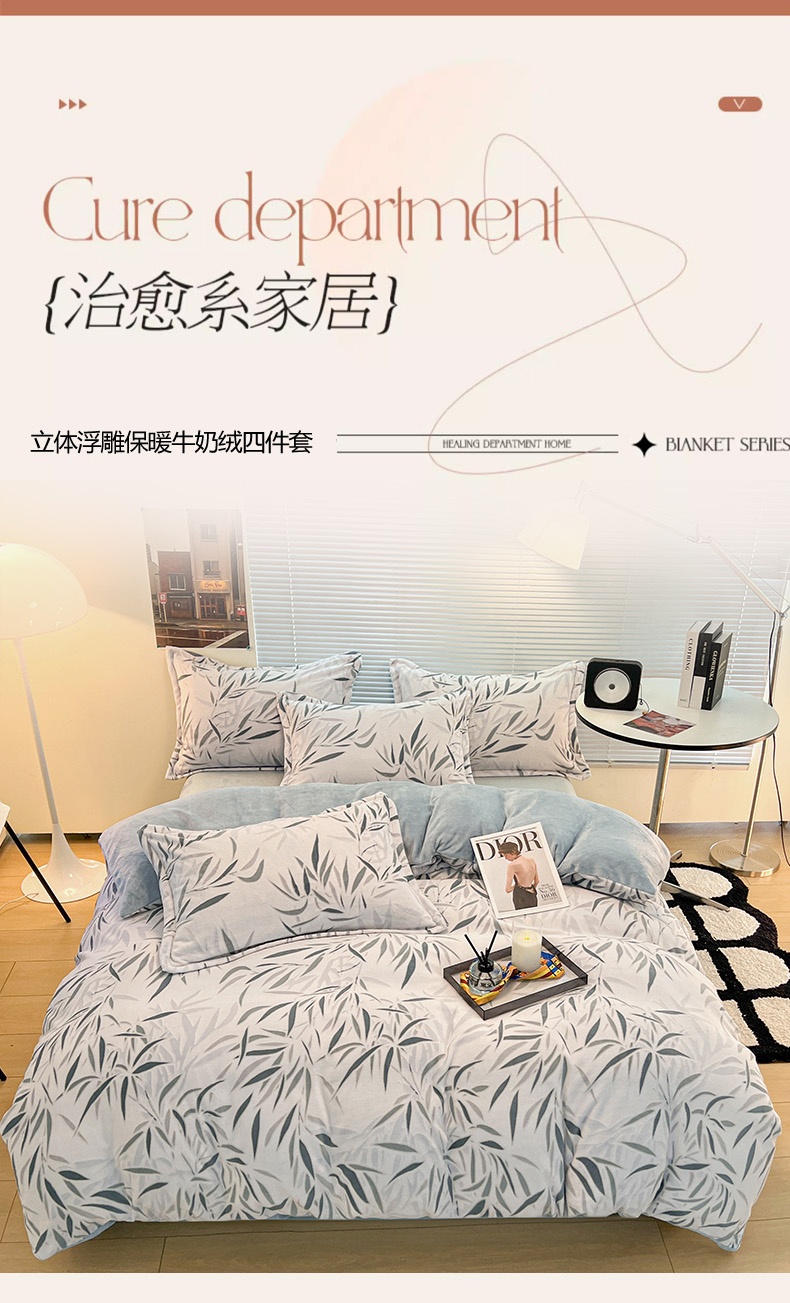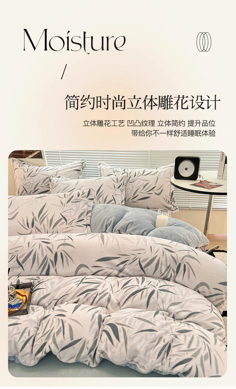 当前位置: 91家纺网 > 商品网购 > 床品套件 > 四件套 > 牛奶绒四件套 > 2024新款A类高克重立体浮雕牛奶绒加厚保暖简约风系列四件套 竹叶潇潇