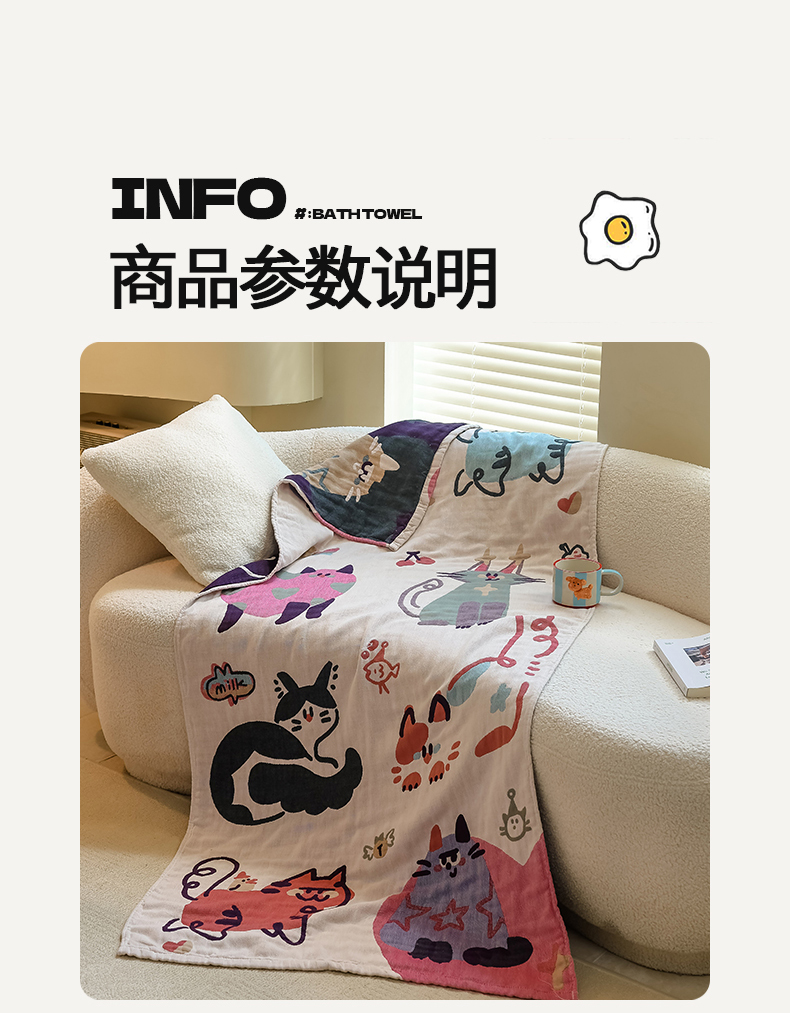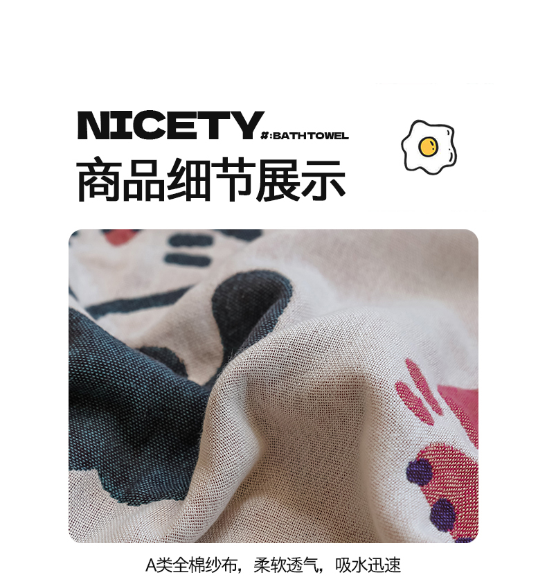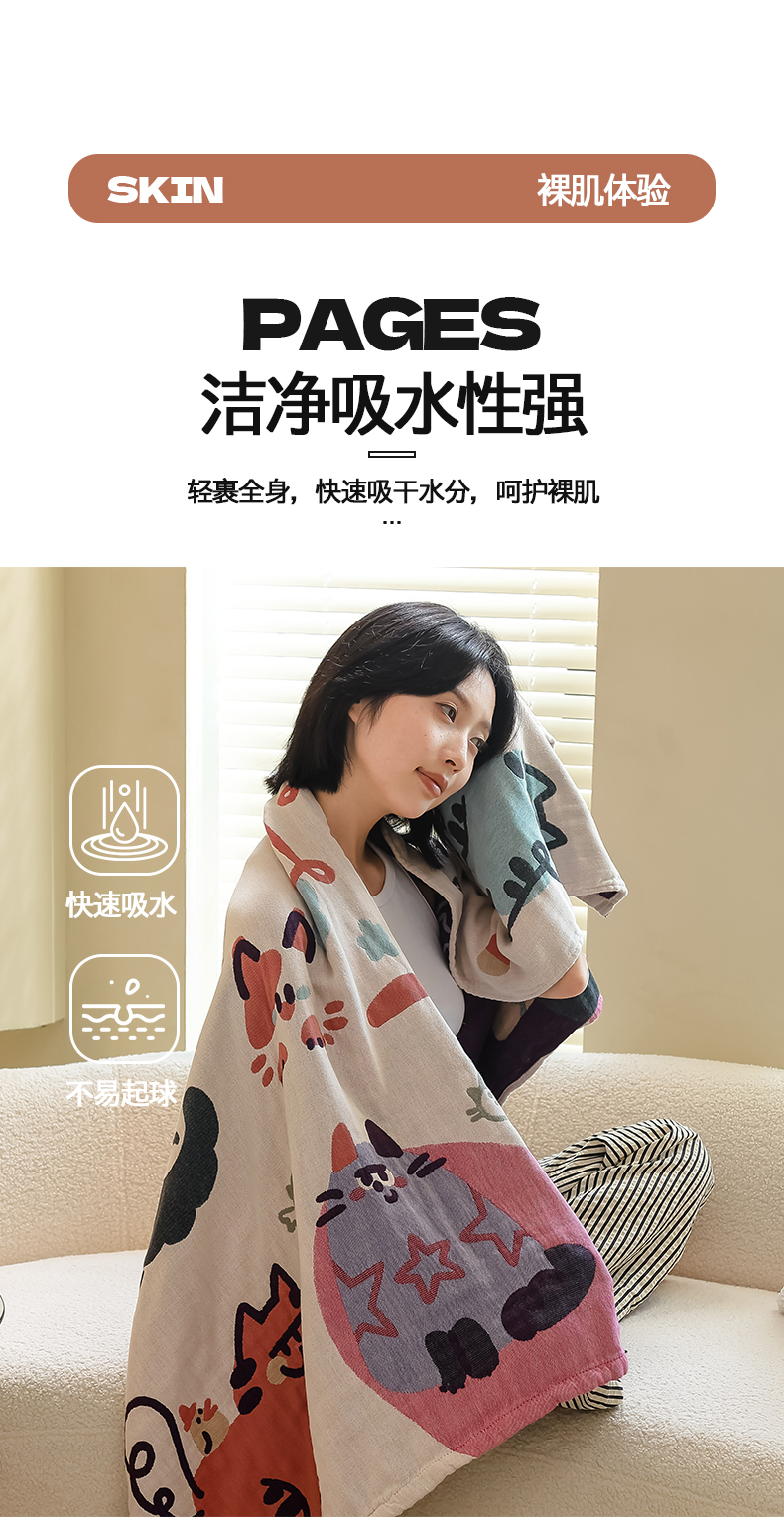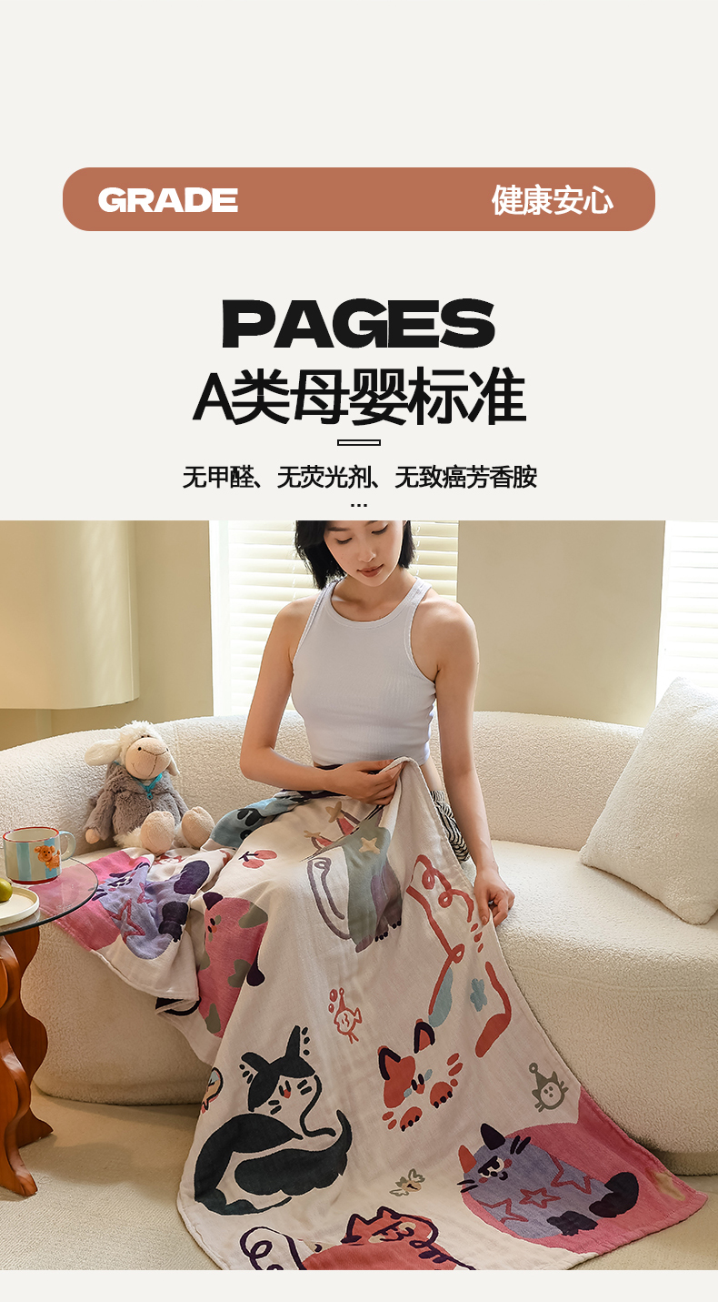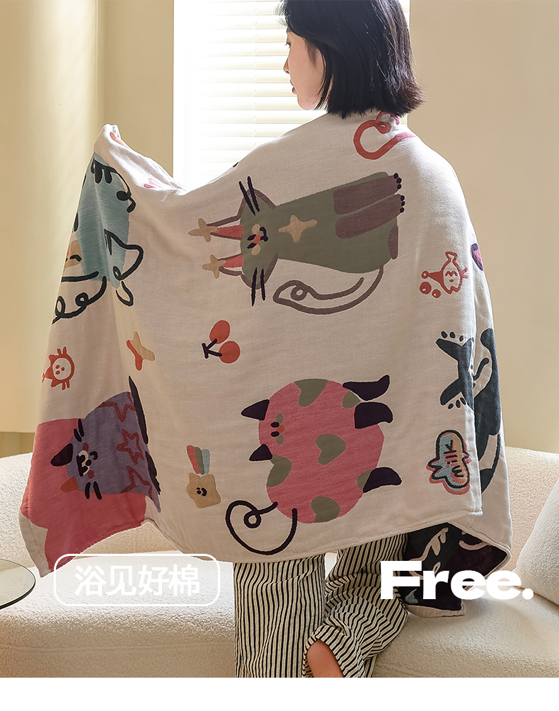 当前位置: 91家纺网 > 商品网购 > 居家日用 > 毛巾/浴巾/浴袍 > 浴巾 > 雯雨家纺 2024新款四层全棉纱布浴巾加大毛巾80*160cm 漫画猫