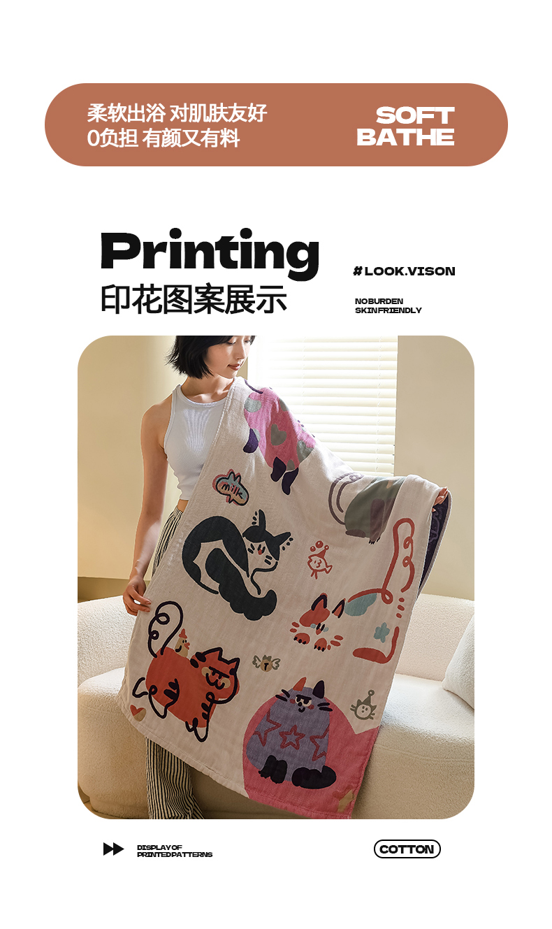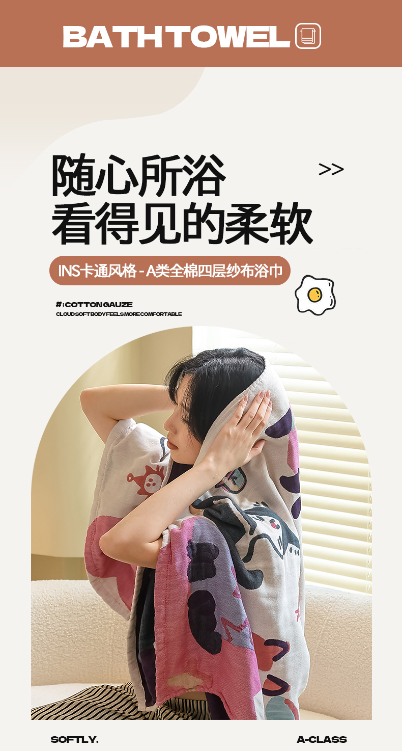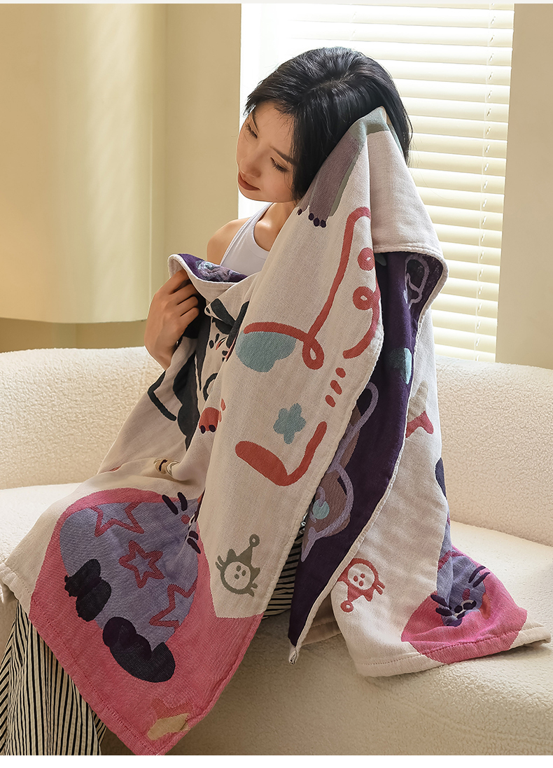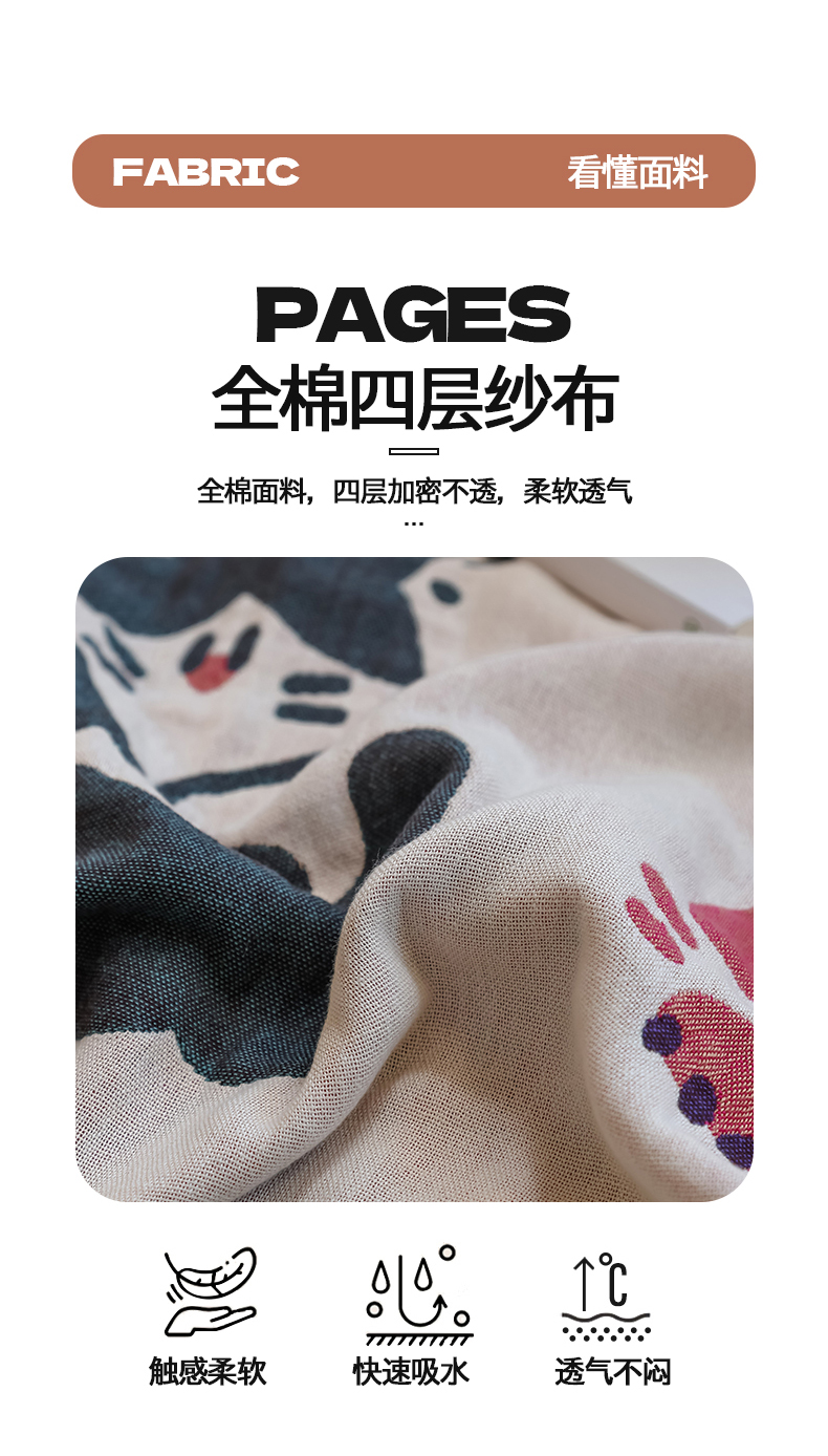 当前位置: 91家纺网 > 商品网购 > 居家日用 > 毛巾/浴巾/浴袍 > 浴巾 > 雯雨家纺 2024新款四层全棉纱布浴巾加大毛巾80*160cm 漫画猫