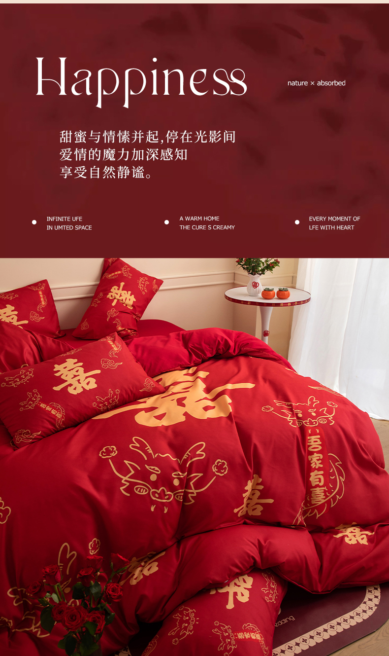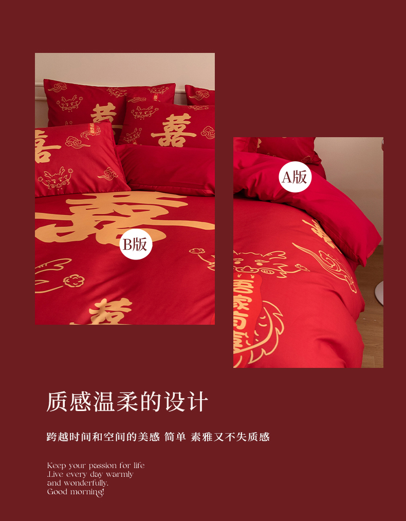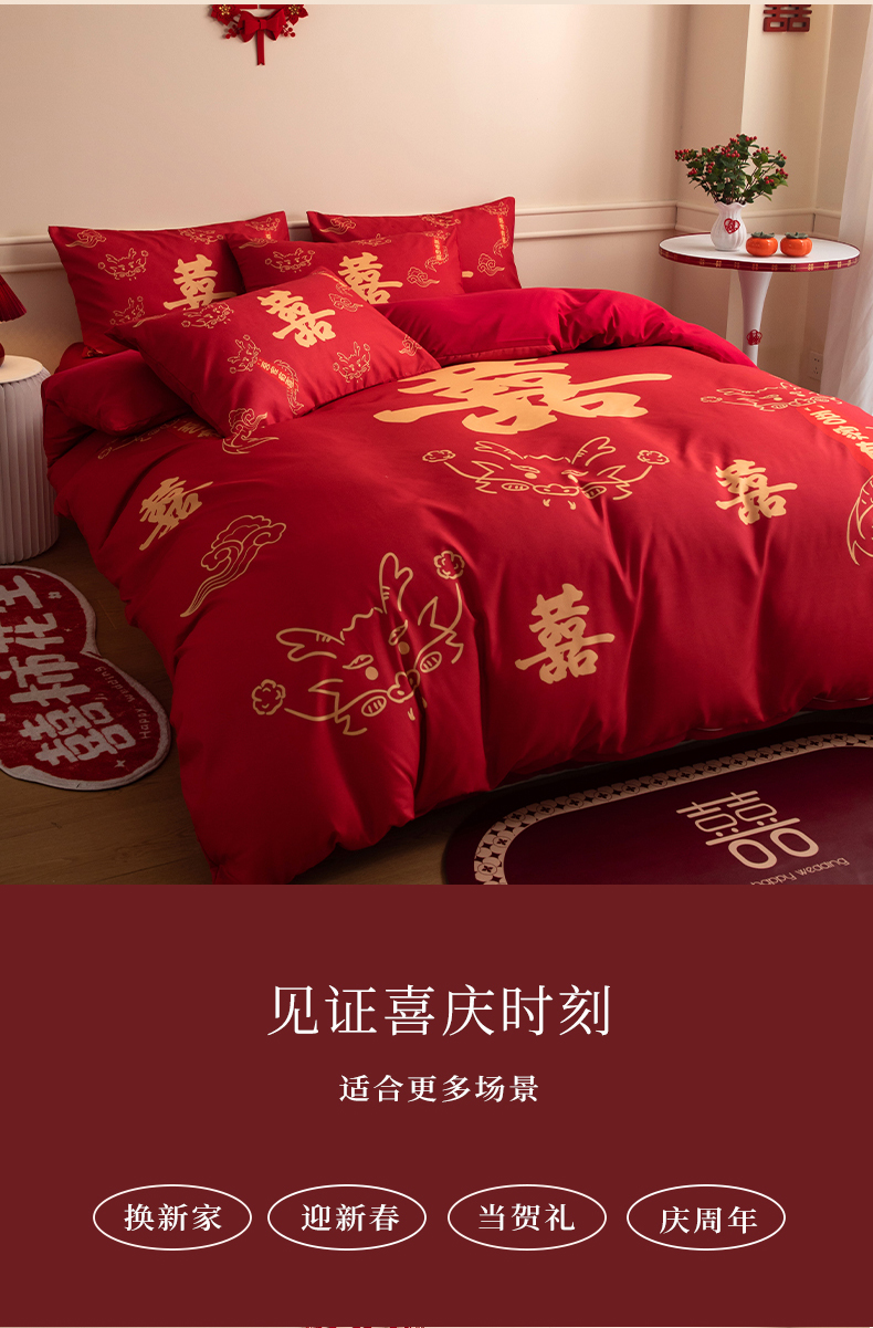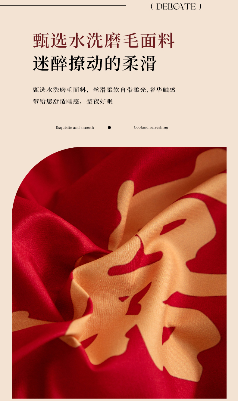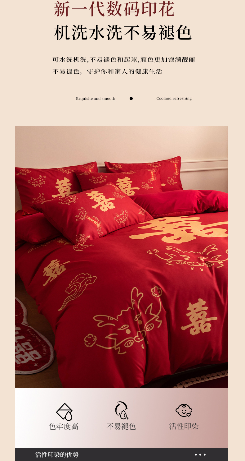 商品名称:色鬼布艺 2024新款水洗磨毛数码印花婚庆四件套磨毛四件套 喜结良缘
