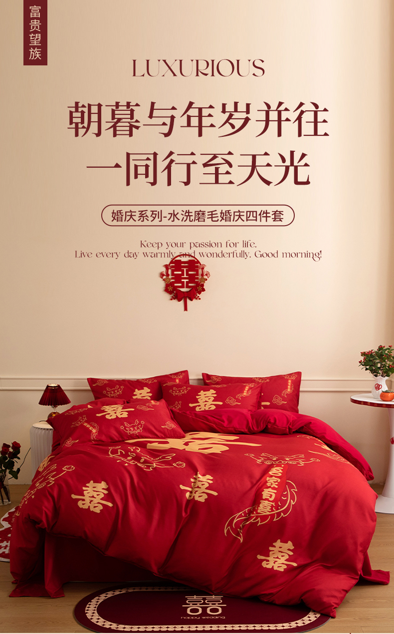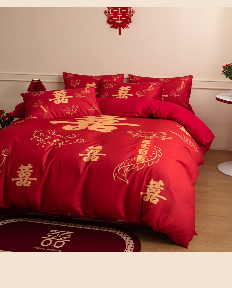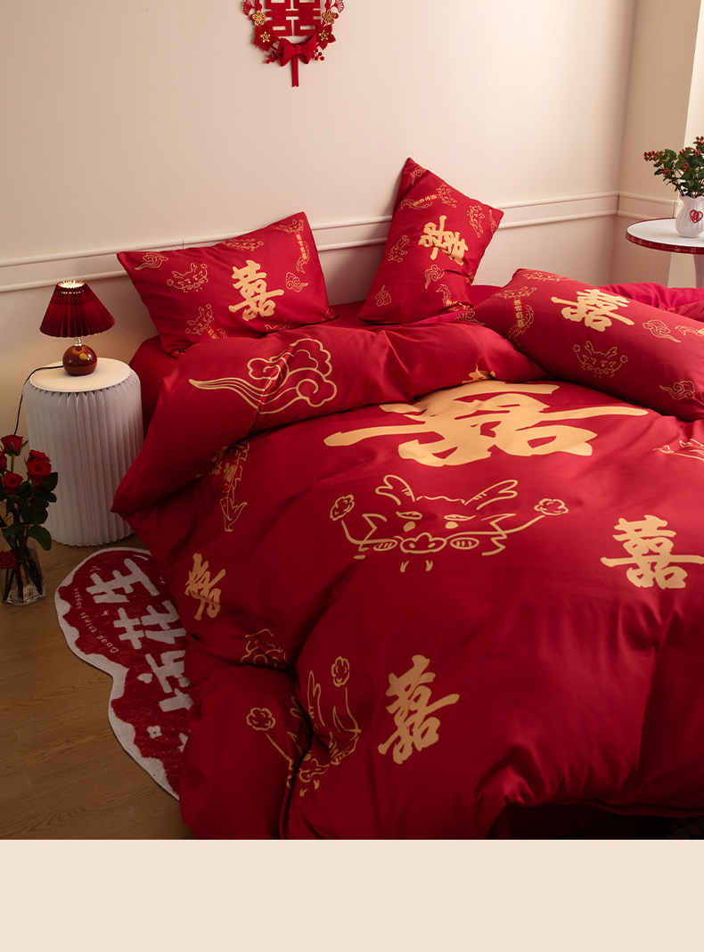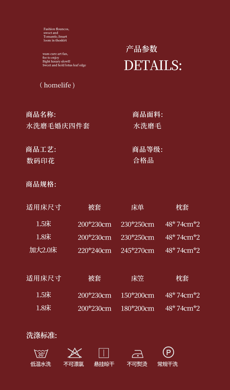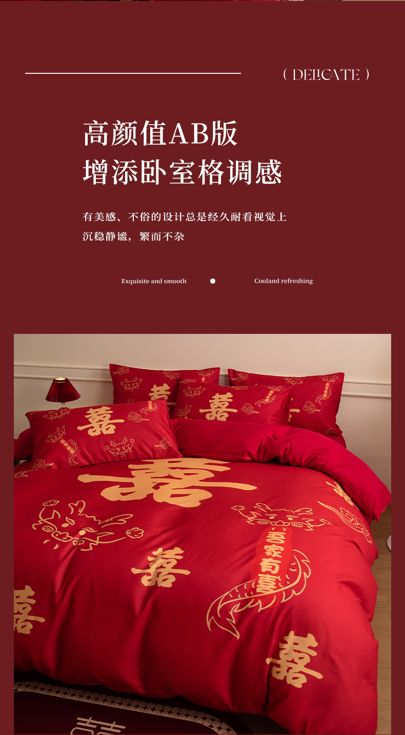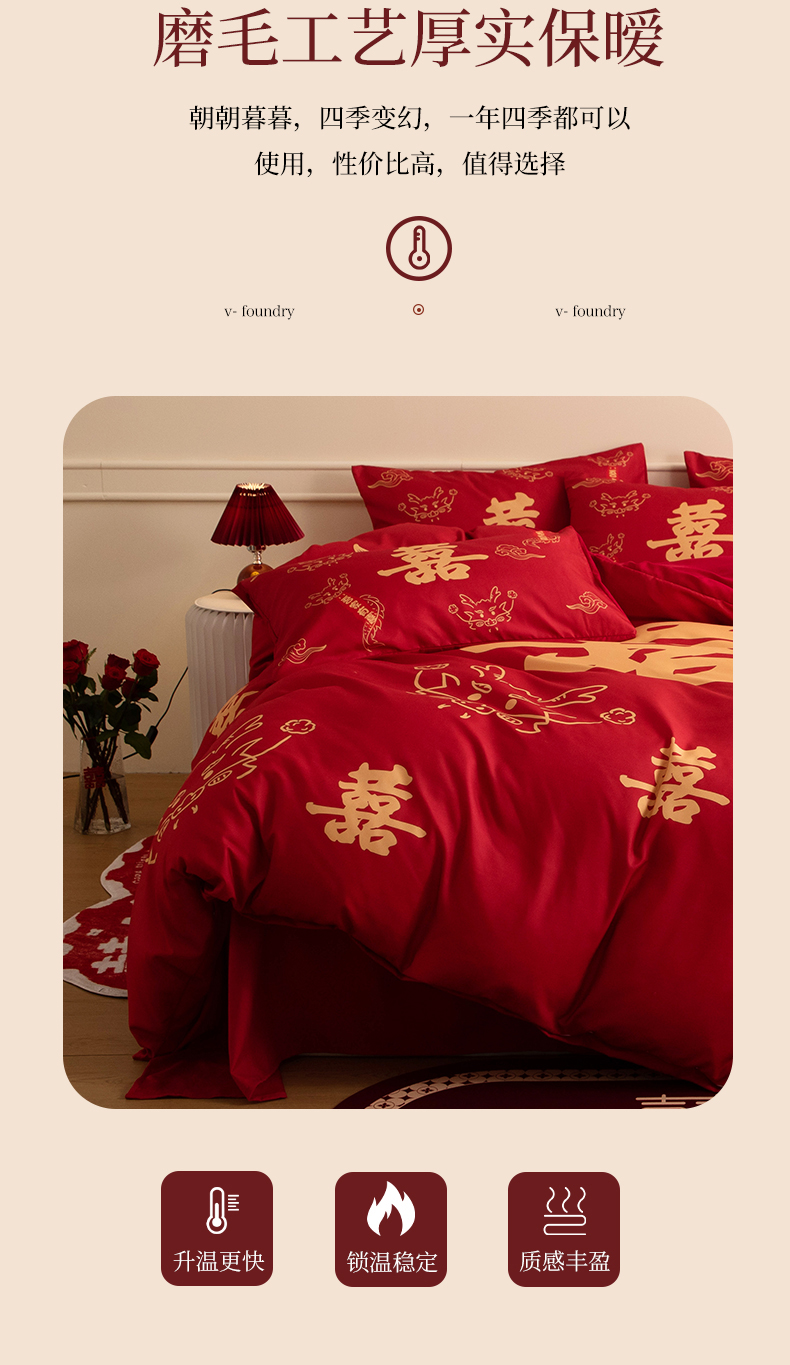 商品名称:色鬼布艺 2024新款水洗磨毛数码印花婚庆四件套磨毛四件套 喜结良缘