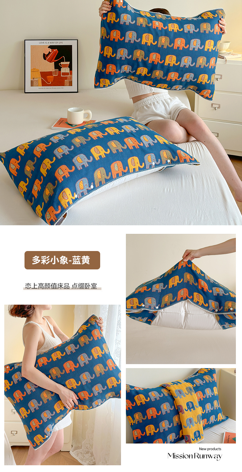 • 91家纺网 家纺一手货源 找家纺 朴尔家纺-毛巾被 2024新款防滑半包可调节暗扣魔术全棉三层纱布枕巾 多彩小象-蓝黄53*110cm/对
