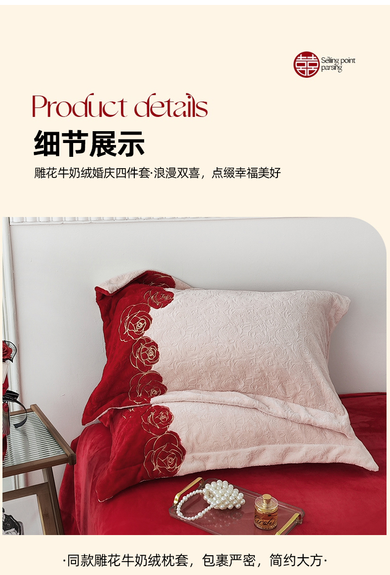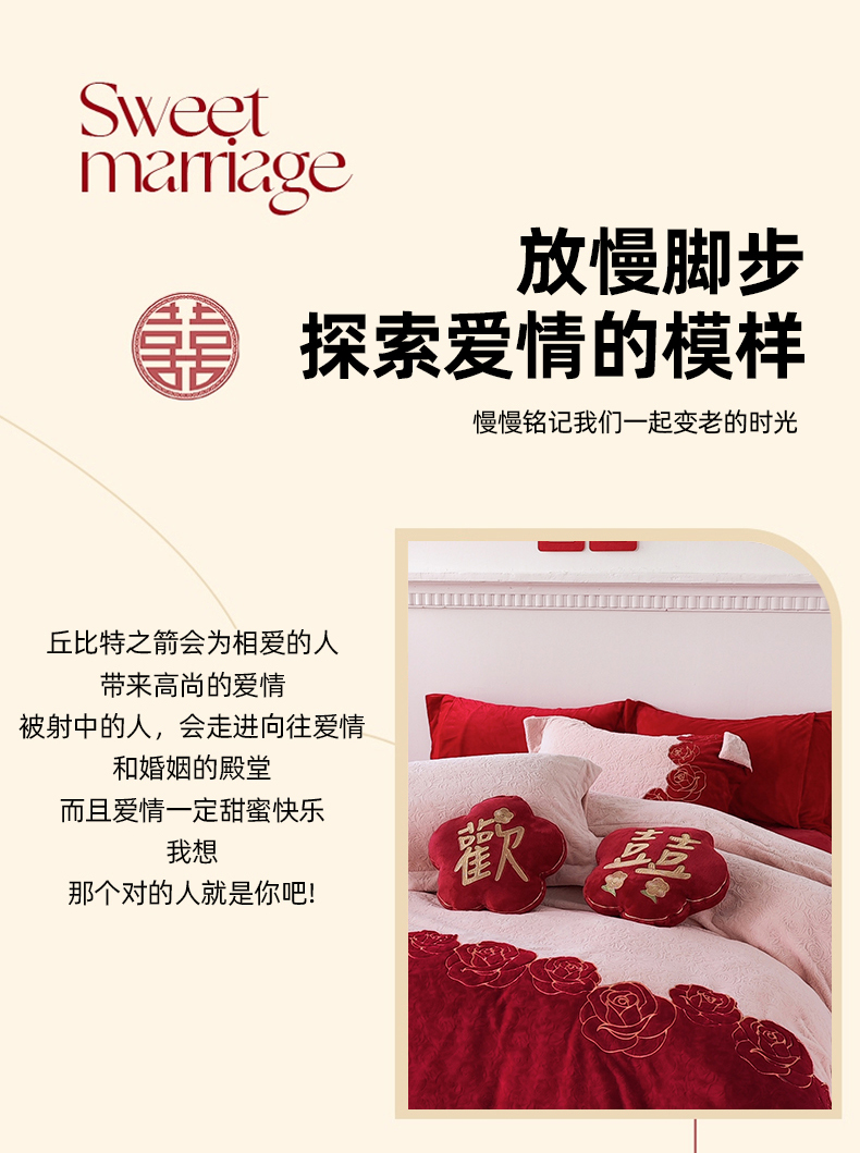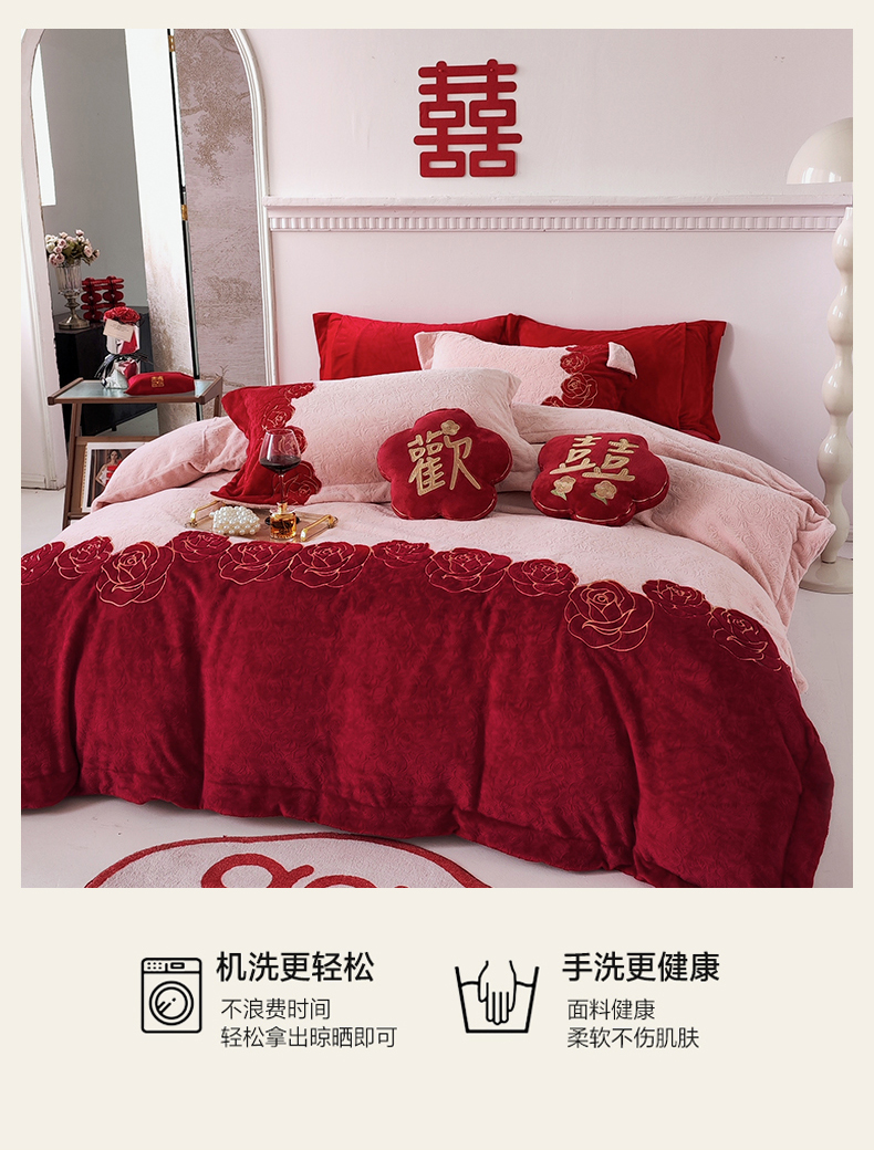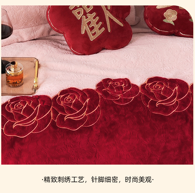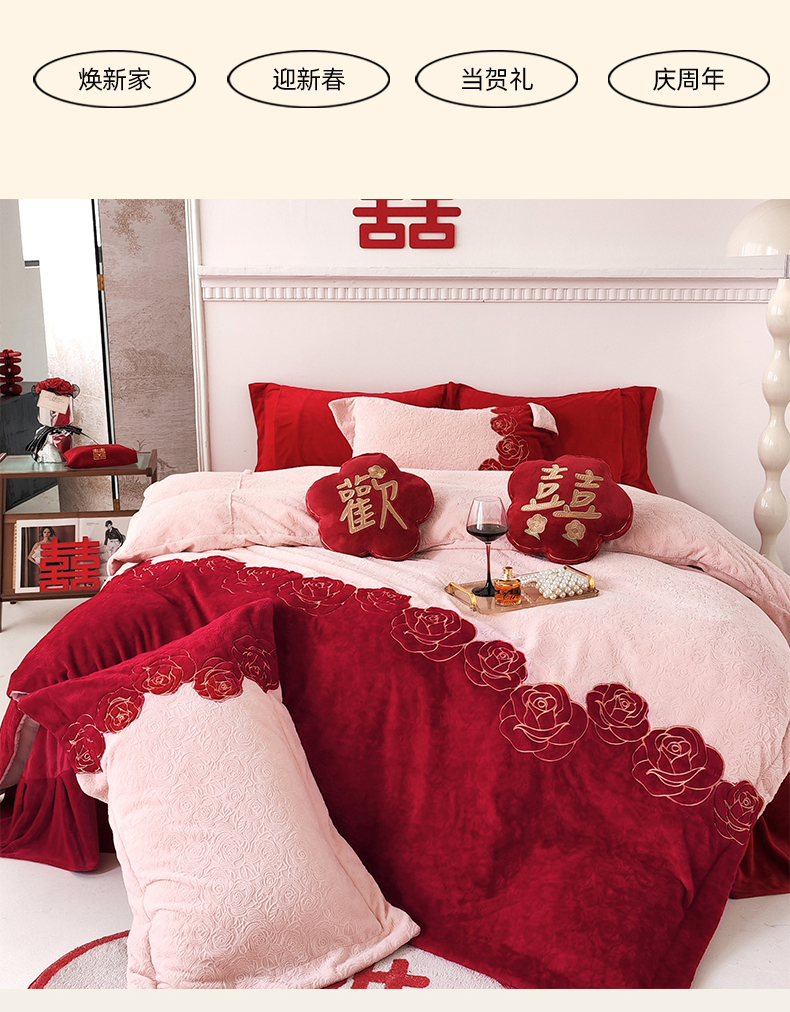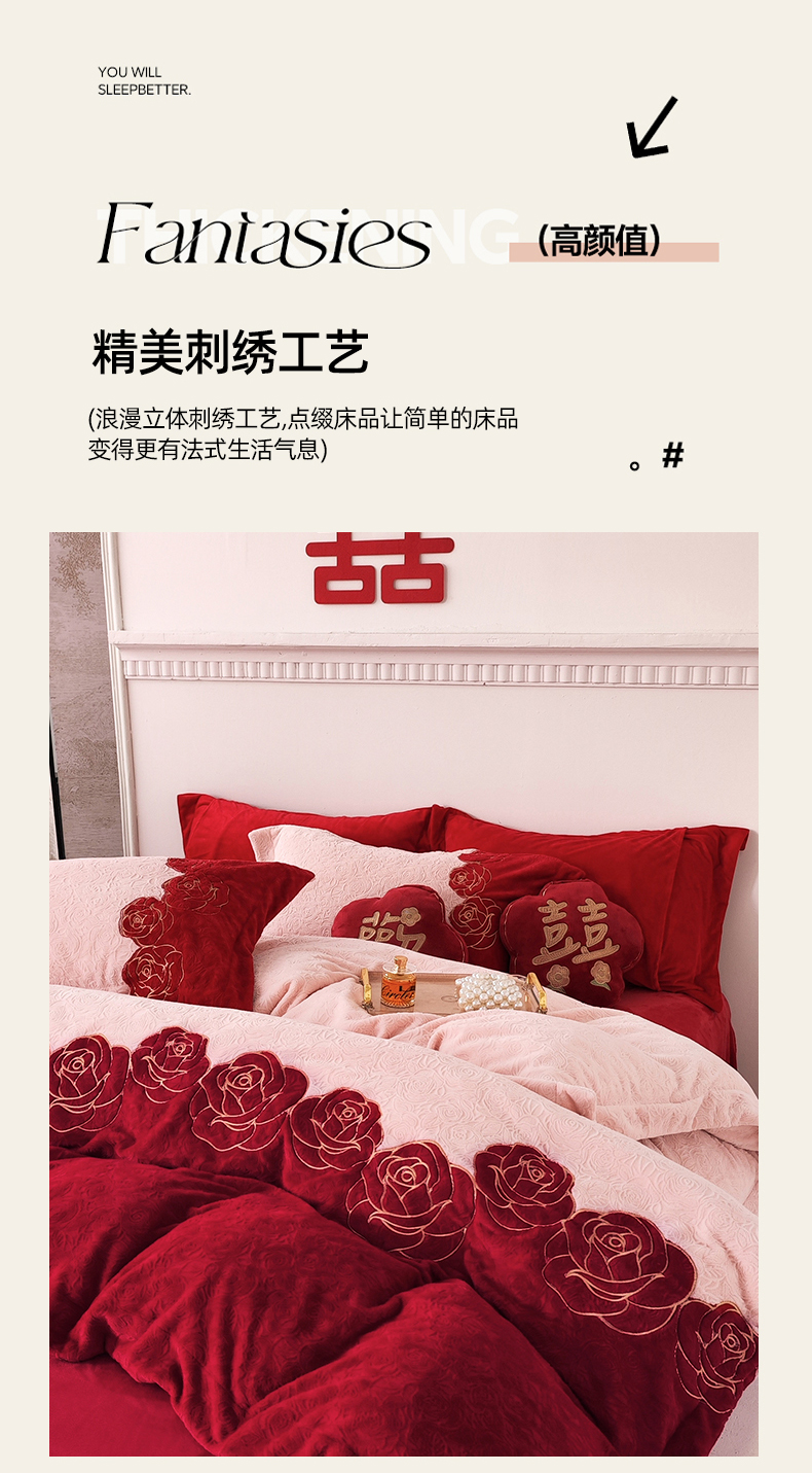 甜咪咪婚庆 2024新品婚庆雕花绒牛奶绒刺绣结婚四件套多件套 小红书推荐爆款 浪漫花都